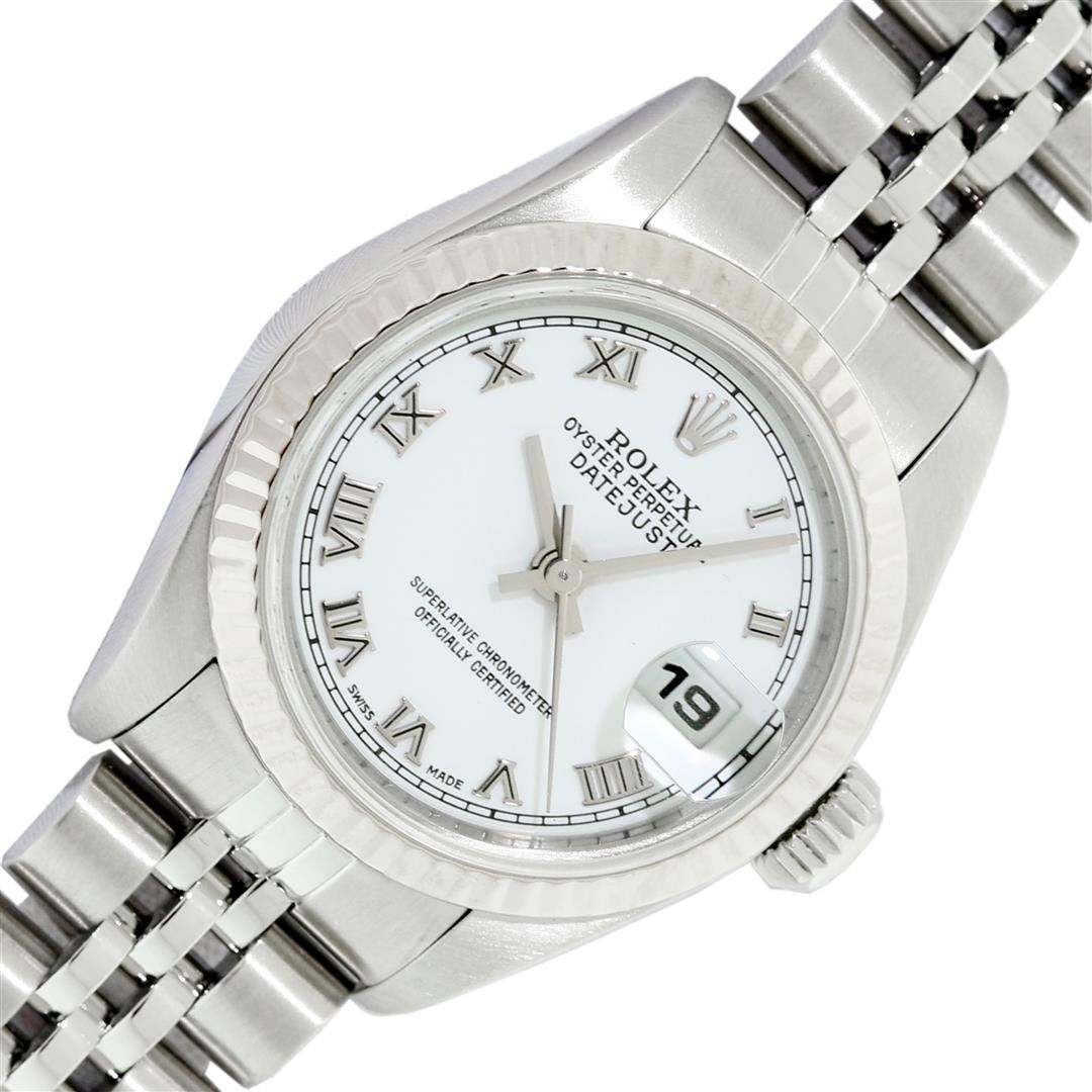 One Quickset Sapphire Pre Owned Ladies Stainless Steel Rolex Datejust Polished Bright with Satin Finish, Serviced & Electronically Tested, Rolex Stainless Steel Case: 26mm, Rolex Stainless Steel Crown, Rolex Bezel: 18K White Gold Fluted Bezel, Crystal: Sapphire With Date Window. Custom Hands: New Hands. Rolex Movement: Automatic Winding Movement 2235. Rolex Dial: White Roman With Square Track, Date Window: 3 O'Clock Position Date Display, Model: Quickset Datejust. Condition: G-6 Extra Fine. Rolex Bracelet: Stainless Steel Jubilee Band. Bright Polish & Satin Finish. 6.0 Inch Length, Adjustable. Standard Clasp, With Rolex Logo. This Watch Has Been Serviced Time Tested And Is In Excellent Condition It Is Free Of All Scratches And Dents. This Watch Comes With A Rolex Box, Rolex Booklets, And Rolex Wallet.