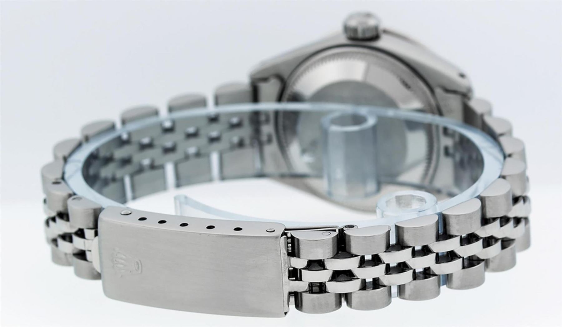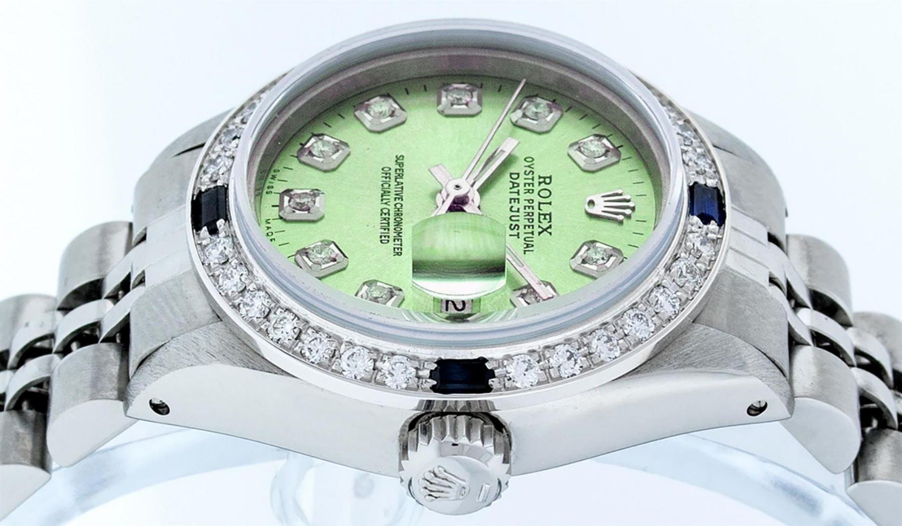 One Ladies Stainless Steel Rolex Datejust Polished Bright with Satin Finish, Serviced & Electronically Tested, Stainless Steel Case: 26mm, Stainless Steel Crown, Custom Bezel: New 18K White Gold Sapphire Beadset Diamond Bezel, Diamond + Gem Count: 28 Diamonds + 4 Sapphires. Total Weight .70 Carat, Clarity: SI-VS, Color: G to H. Custom Crystal: New Scratch Resistant Synthetic Sapphire Cyclops Lens. Custom Hands: New Luminescent Hands. Movement: Automatic Winding Movement. Custom Dial: Refinished Green With Diamond Hour Markers & Dash Tracks, 10 Diamonds in Dial, G To H In Color, Clarity: SI-VS. Date Window: 3 O'Clock Position Date Display, Model: Datejust. Condition: G-6 Extra Fine. Bracelet: Stainless Steel Jubilee. Bright Polish & Satin Finish. 6.0 Inch Length, Adjustable. Standard Clasp, With Rolex Logo. This Watch Has Been Serviced Time Tested And Is In Excellent Condition It Is Free Of All Scratches And Dents.