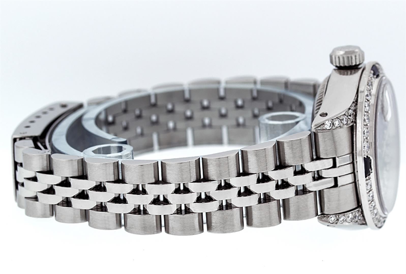 One Ladies Stainless Steel Rolex Datejust Polished Bright with Satin Finish, Serviced & Electronically Tested, Stainless Steel Case: 26mm, Stainless Steel Crown, Diamond Lugs: 24 Diamonds On Lugs, Clarity: SI-VS, Color: G to H. Custom Bezel: New 18K White Gold Diamond + Sapphire Beadset Diamond Bezel, Stone Count: 28 Diamonds + 4 Sapphires, Total Weight .70 Carat, Clarity: SI-VS, Color: G to H. Custom Crystal: New Synthetic Sapphire Cyclops Lens. Custom Hands: New Luminescent Hands. Movement: Automatic Winding Movement. Custom Dial: Refinished Blue String Diamond Dial, 43 Diamonds in Dial G To H In Color, Clarity: VS. Date Window: 3 O'Clock Position Date Display, Model: Datejust. Condition: G-6 Extra Fine. Bracelet: Stainless Steel Jubilee. Bright Polish & Satin Finish. 6.0 Inch Length, Adjustable. Standard Clasp, With Rolex Logo. This Watch Has Been Serviced Time Tested And Is In Excellent Condition It Is Free Of All Scratches And Dents.