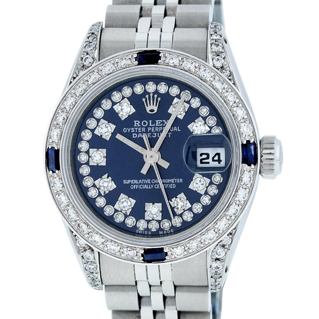 One Ladies Stainless Steel Rolex Datejust Polished Bright with Satin Finish, Serviced & Electronically Tested, Stainless Steel Case: 26mm, Stainless Steel Crown, Diamond Lugs: 24 Diamonds On Lugs, Clarity: SI-VS, Color: G to H. Custom Bezel: New 18K White Gold Diamond + Sapphire Beadset Diamond Bezel, Stone Count: 28 Diamonds + 4 Sapphires, Total Weight .70 Carat, Clarity: SI-VS, Color: G to H. Custom Crystal: New Synthetic Sapphire Cyclops Lens. Custom Hands: New Luminescent Hands. Movement: Automatic Winding Movement. Custom Dial: Refinished Blue String Diamond Dial, 43 Diamonds in Dial G To H In Color, Clarity: VS. Date Window: 3 O'Clock Position Date Display, Model: Datejust. Condition: G-6 Extra Fine. Bracelet: Stainless Steel Jubilee. Bright Polish & Satin Finish. 6.0 Inch Length, Adjustable. Standard Clasp, With Rolex Logo. This Watch Has Been Serviced Time Tested And Is In Excellent Condition It Is Free Of All Scratches And Dents.