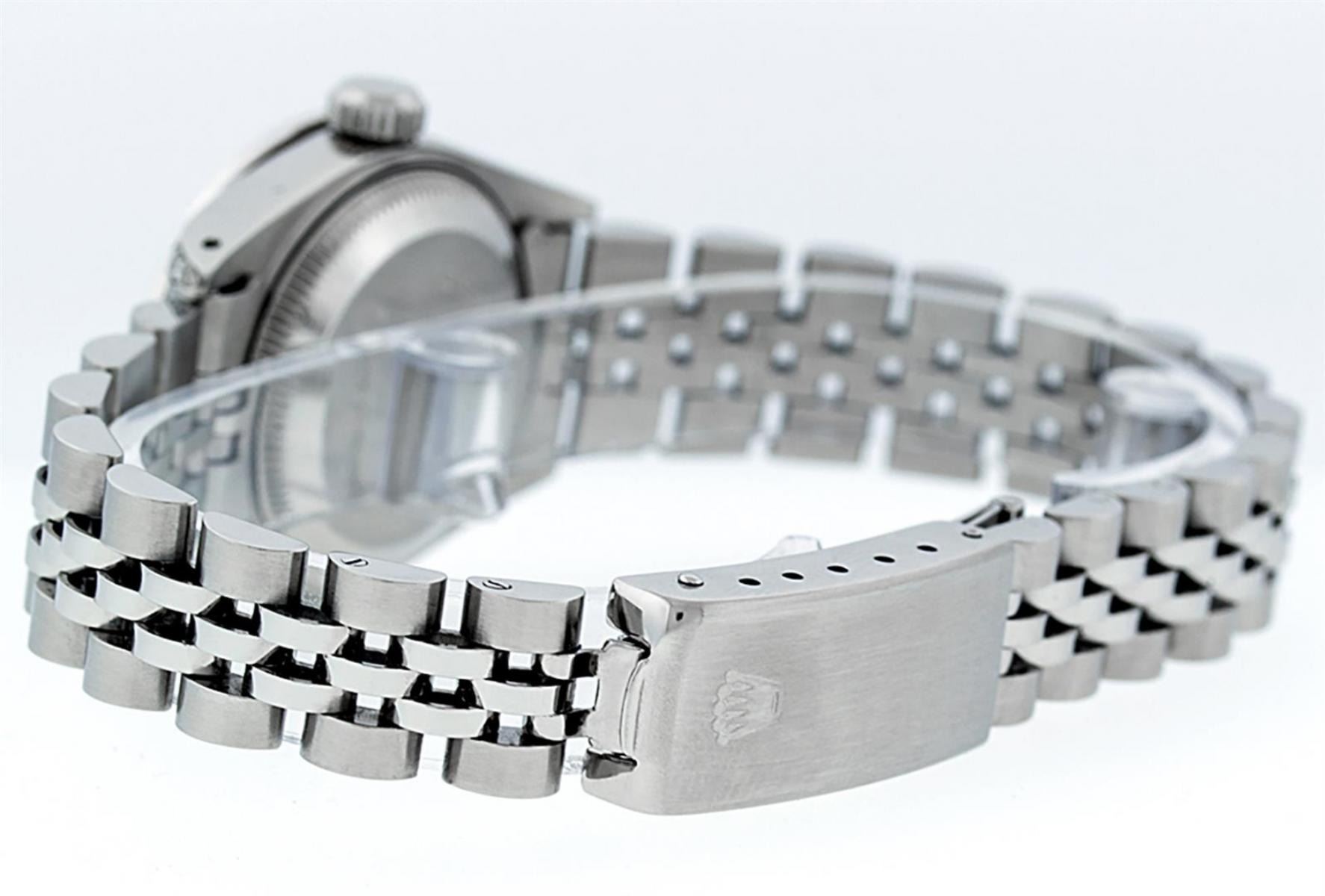 One Ladies Stainless Steel Rolex Datejust Polished Bright with Satin Finish, Serviced & Electronically Tested, Stainless Steel Case: 26mm, Stainless Steel Crown, Custom Diamond Lugs: 24 Diamonds On Lugs, Clarity: SI-VS, Color: G to H. Custom Bezel: New 18K White Gold Diamond Beadset Diamond Bezel, Stone Count: 32 Diamonds, Total Weight .70 Carat, Clarity: SI-VS, Color: G to H. Custom Crystal: New Scratch Resistant Synthetic Sapphire Cyclops Lens. Custom Hands: New Luminescent Hands. Movement: Automatic Winding Movement. Custom Dial: Refinished Green String Diamond Dial, 43 Diamonds in Dial G To H In Color, Clarity: VS. Date Window: 3 O'Clock Position Date Display, Model: Datejust. Condition: G-6 Extra Fine. Bracelet: Stainless Steel Jubilee Band. Bright Polish & Satin Finish. 6.0 Inch Length, Adjustable. Standard Clasp, With Rolex Logo. This Watch Has Been Serviced Time Tested And Is In Excellent Condition It Is Free Of All Scratches And Dents.