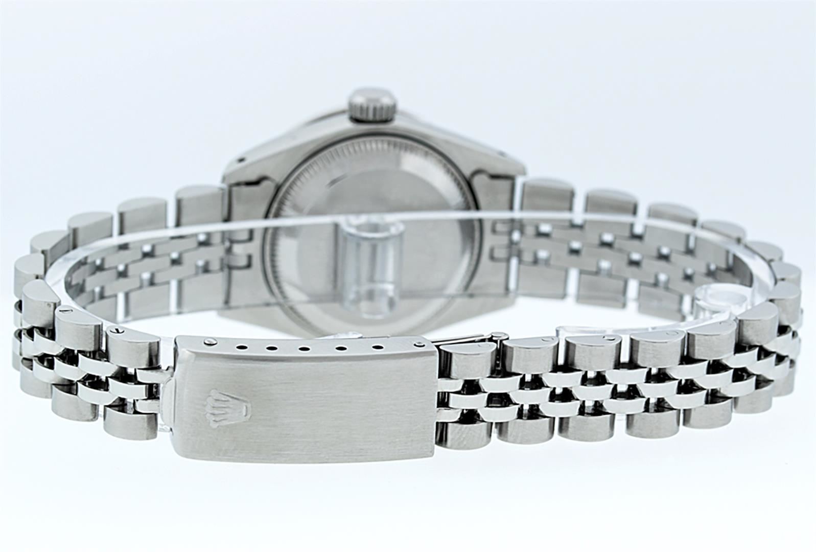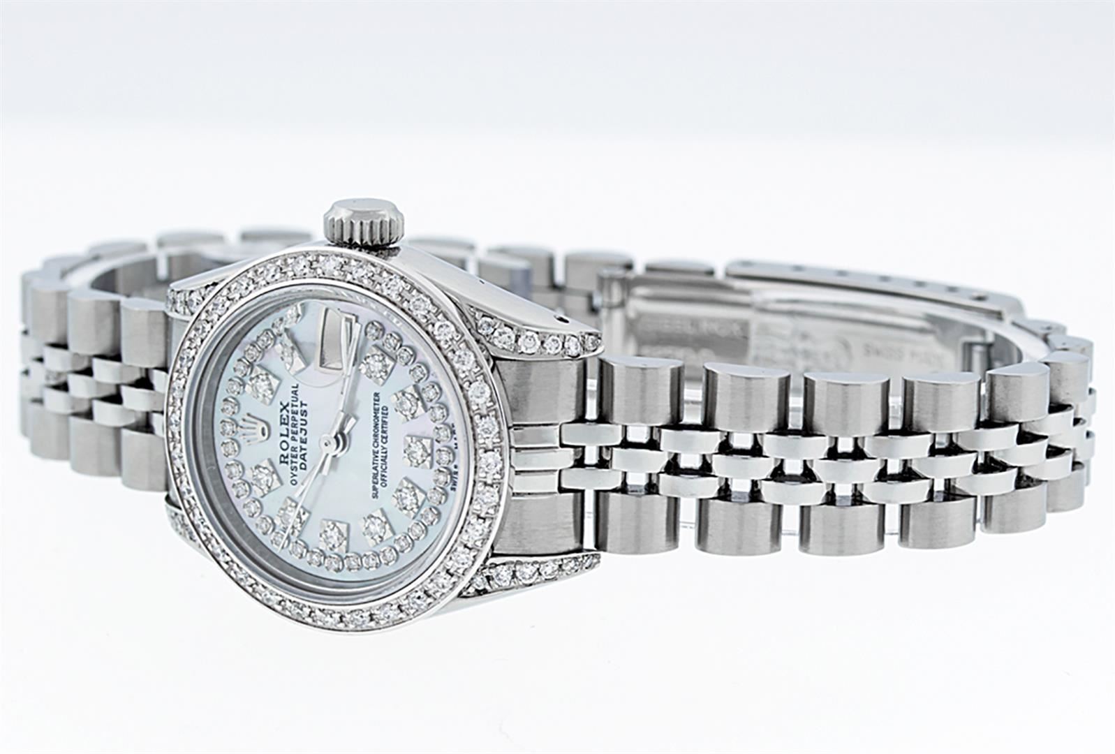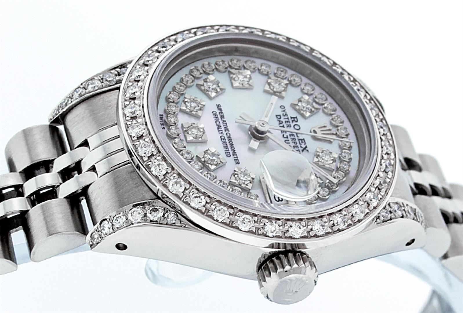 One Ladies Stainless Steel Rolex Datejust Polished Bright with Satin Finish, Serviced & Electronically Tested, Stainless Steel Case: 26mm, Stainless Steel Crown, Diamond Lugs: 24 Diamonds On Lugs, Clarity: SI-VS, Color: G to H. Custom Bezel: New 18K White Gold Diamond Beadset Diamond Bezel, Stone Count: 32 Diamonds, Total Weight .70 Carat, Clarity: SI-VS, Color: G to H. Custom Crystal: New Synthetic Sapphire Cyclops Lens. Custom Hands: New Luminescent Hands. Movement: Automatic Winding Movement. Custom Dial: Refinished Mother Of Pearl String Diamond Dial, 43 Diamonds in Dial G To H In Color, Clarity: VS. Date Window: 3 O'Clock Position Date Display, Model: Datejust. Condition: G-6 Extra Fine. Bracelet: Stainless Steel Jubilee. Bright Polish & Satin Finish. 6.0 Inch Length, Adjustable. Standard Clasp, With Rolex Logo. This Watch Has Been Serviced Time Tested And Is In Excellent Condition It Is Free Of All Scratches And Dents.