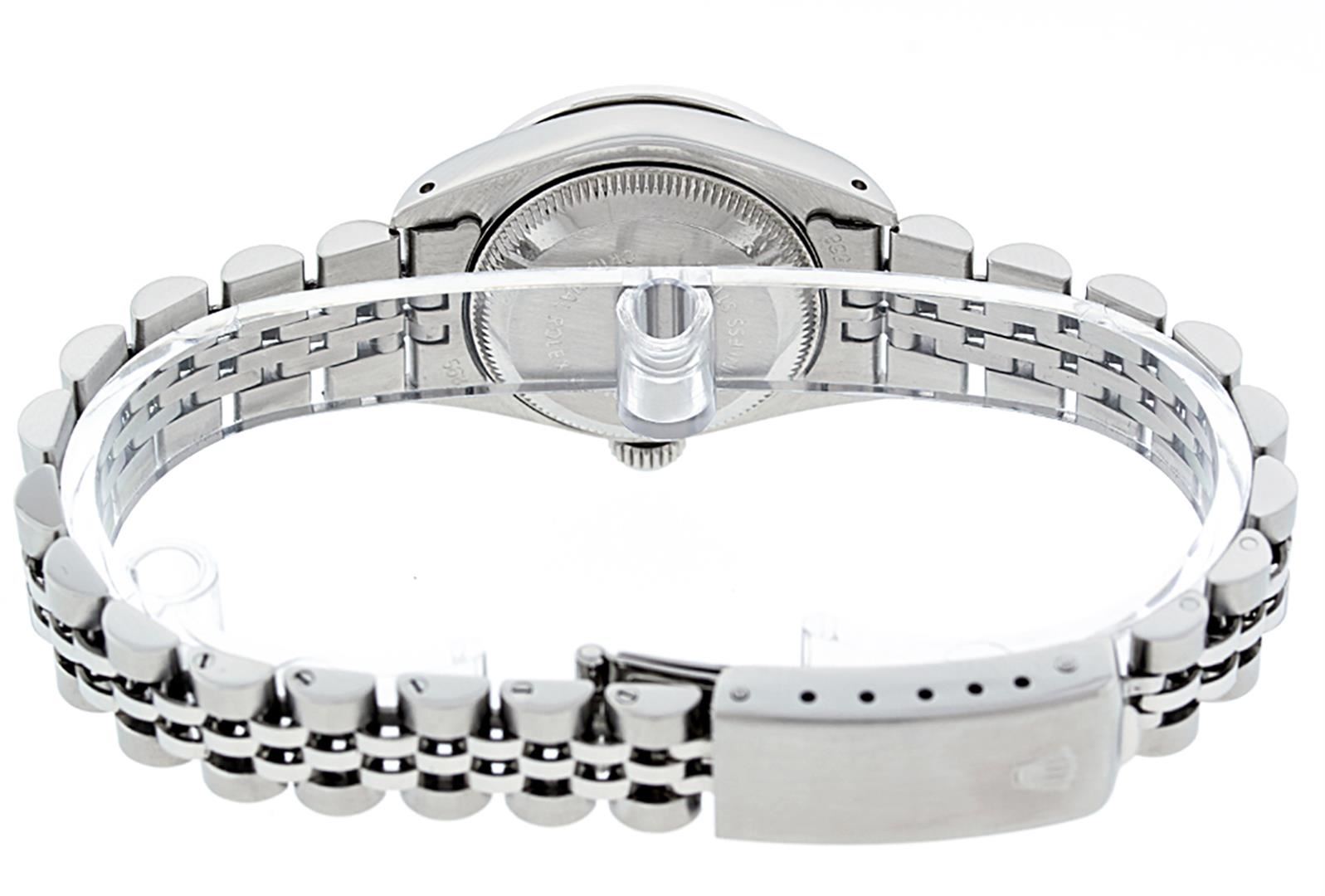 One Ladies Stainless Steel Rolex Datejust Polished Bright with Satin Finish, Serviced & Electronically Tested, Stainless Steel Case: 26mm, Stainless Steel Crown, Custom Diamond Lugs: 24 Diamonds On Lugs, Clarity: SI-VS, Color: G to H. Custom Bezel: New 18K White Gold Diamond Beadset Diamond Bezel, Stone Count: 32 Diamonds In Bezel, Total Weight .70 Carat, Clarity: SI-VS, Color: G to H. Custom Crystal: New Scratch Resistant Synthetic Sapphire Cyclops Lens. Custom Hands: New Luminescent Hands. Movement: Automatic Winding Movement . Custom Dial: Refinished Orange String Diamond Dial, 43 Diamonds in Dial G To H In Color, Clarity: VS. Date Window: 3 O'Clock Position Date Display, Model: Datejust. Condition: G-6 Extra Fine. Bracelet: Stainless Steel Jubilee Band. Bright Polish & Satin Finish. 6.0 Inch Length, Adjustable. Standard Clasp, With Rolex Logo. This Watch Has Been Serviced Time Tested And Is In Excellent Condition It Is Free Of All Scratches And Dents.