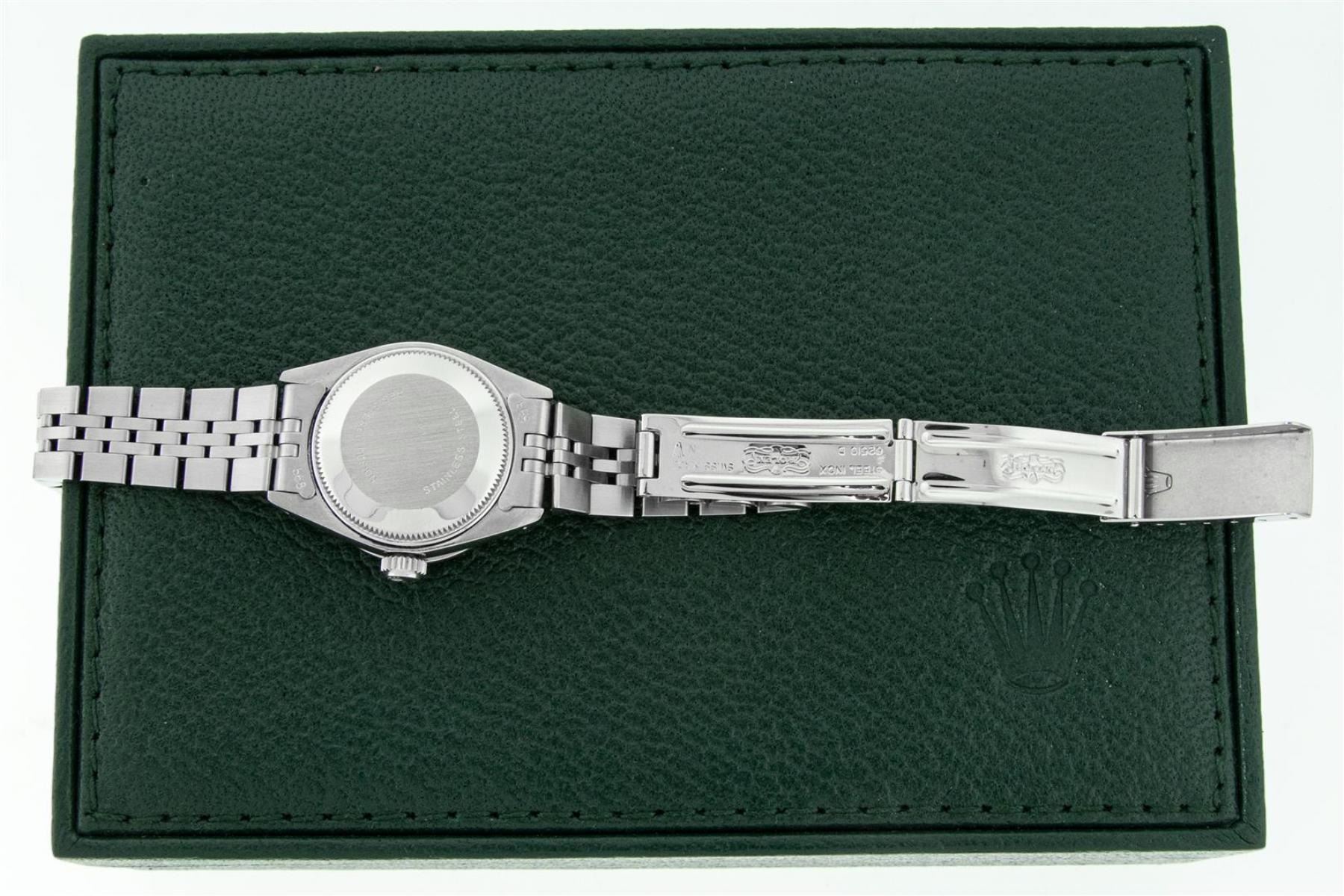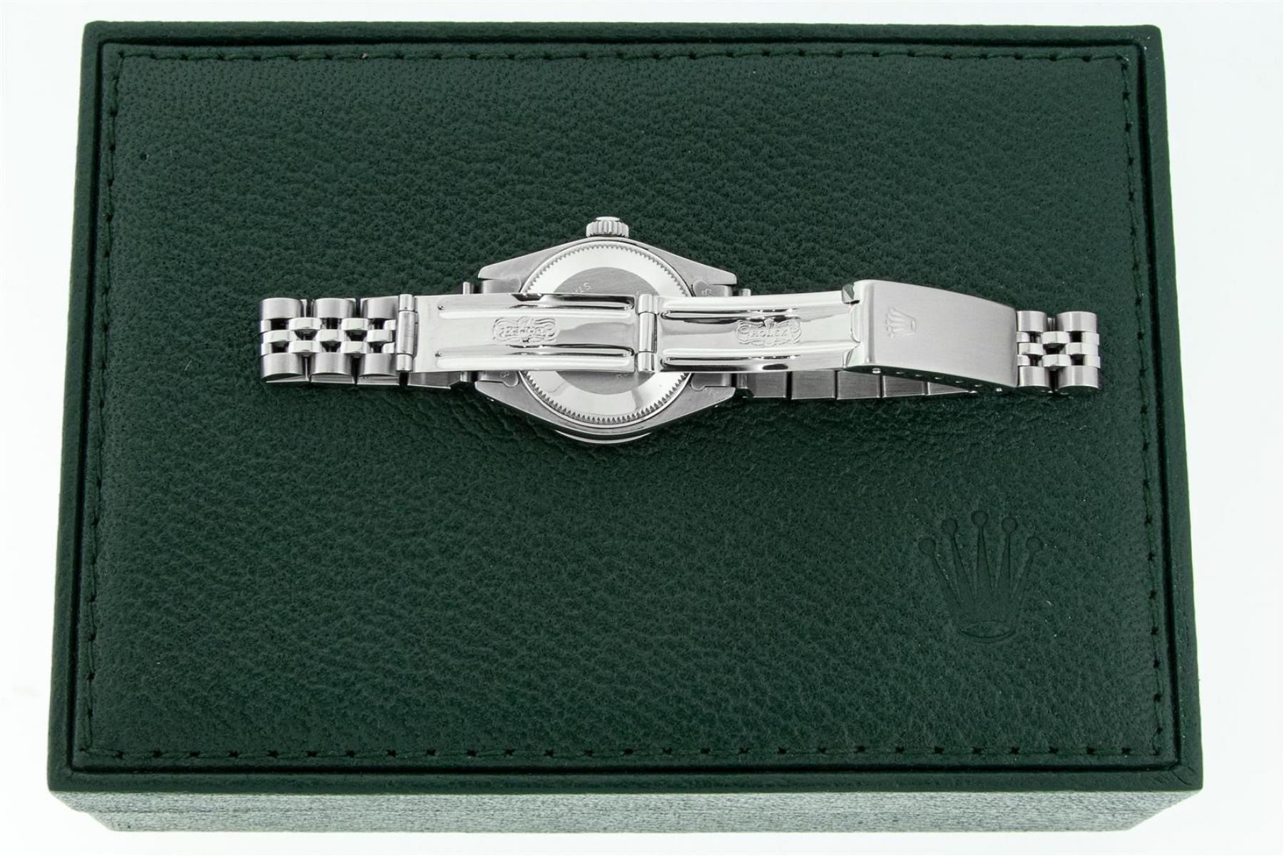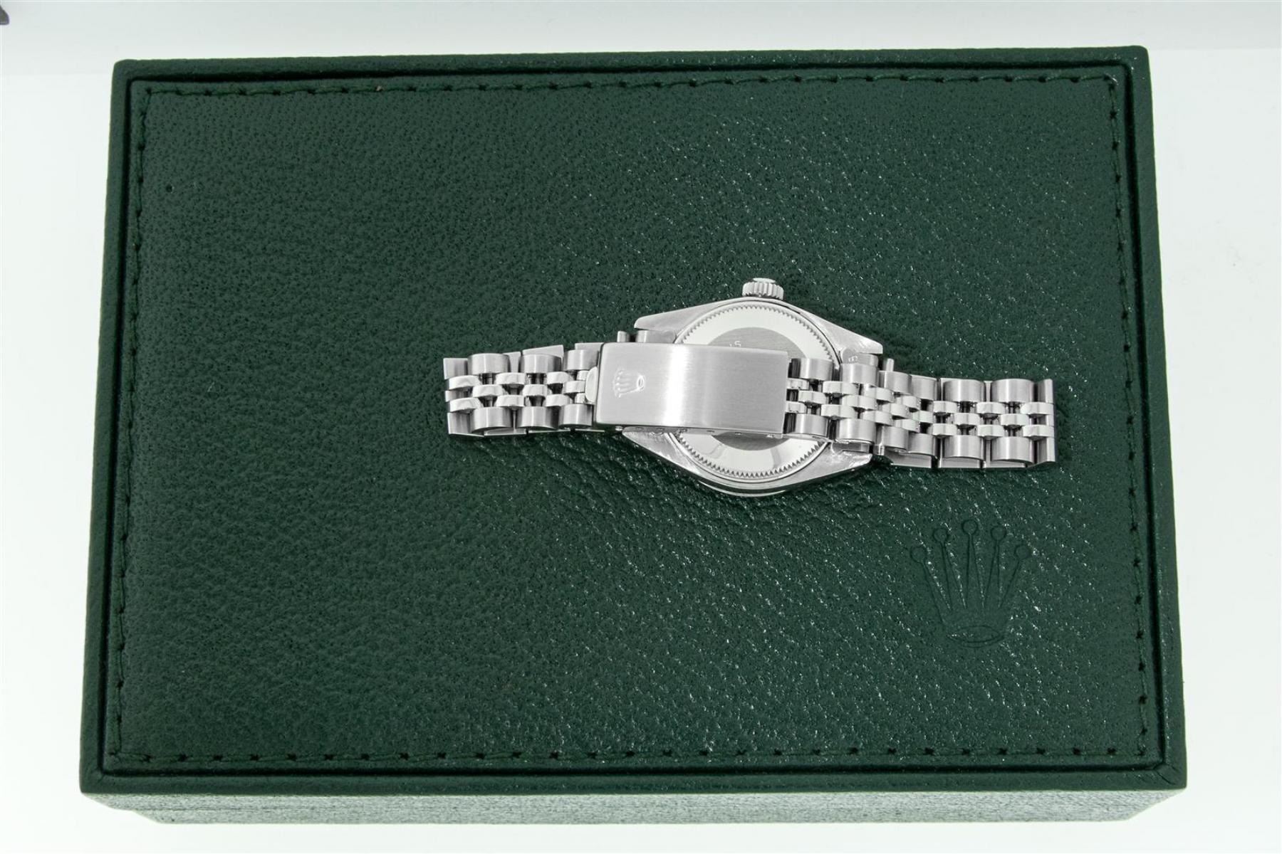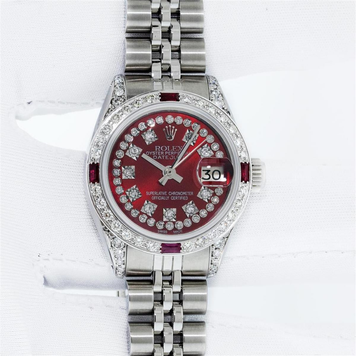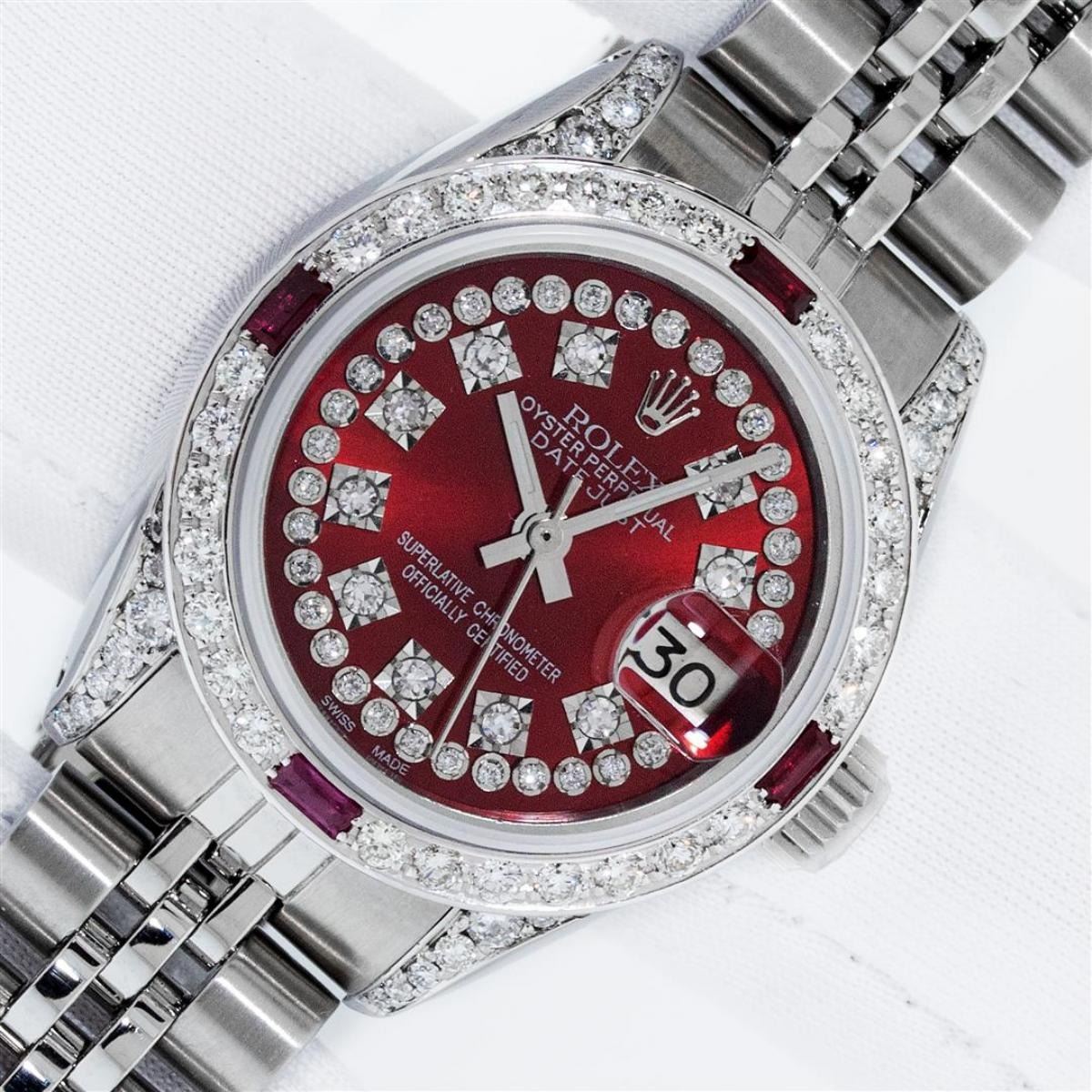One Ladies Stainless Steel Rolex Datejust Polished Bright with Satin Finish, Serviced & Electronically Tested, Stainless Steel Case: 26mm, Stainless Steel Crown, Diamond Lugs: 24 Diamonds On Lugs, Clarity: SI-VS, Color: G to H. Custom Bezel: New 18K White Gold Diamond + Ruby Beadset Diamond Bezel, Stone Count: 28 Diamonds + 4 Rubies, Total Weight .70 Carat, Clarity: SI-VS, Color: G to H. Custom Crystal: New Scratch Resistant Synthetic Sapphire Cyclops Lens. Custom Hands: New Luminescent Hands. Movement: Automatic Winding Movement. Custom Dial: Refinished Red String Diamond Dial, 43 Diamonds in Dial G To H In Color, Clarity: VS. Date Window: 3 O'Clock Position Date Display, Model: Datejust. Condition: G-6 Extra Fine. Bracelet: Stainless Steel Jubilee Band. Bright Polish & Satin Finish. 6.0 Inch Length, Adjustable. Standard Clasp, With Rolex Logo. This Watch Has Been Serviced Time Tested And Is In Excellent Condition It Is Free Of All Scratches And Dents.