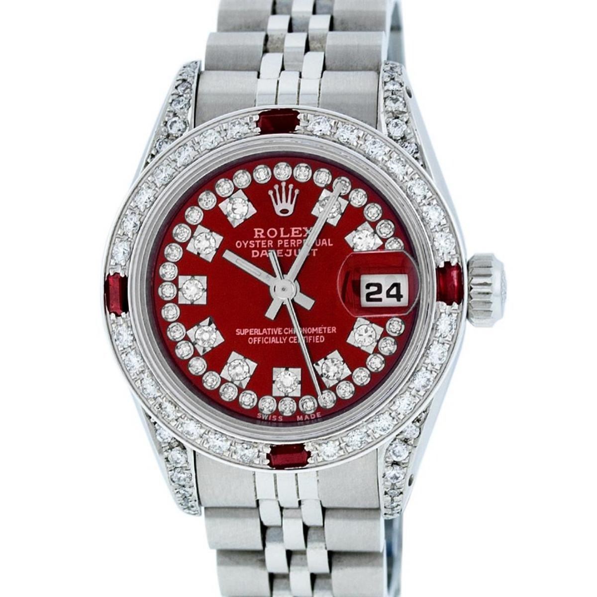 One Ladies Stainless Steel Rolex Datejust Polished Bright with Satin Finish, Serviced & Electronically Tested, Stainless Steel Case: 26mm, Stainless Steel Crown, Diamond Lugs: 24 Diamonds On Lugs, Clarity: SI-VS, Color: G to H. Custom Bezel: New 18K White Gold Diamond + Ruby Beadset Diamond Bezel, Stone Count: 28 Diamonds + 4 Rubies, Total Weight .70 Carat, Clarity: SI-VS, Color: G to H. Custom Crystal: New Scratch Resistant Synthetic Sapphire Cyclops Lens. Custom Hands: New Luminescent Hands. Movement: Automatic Winding Movement. Custom Dial: Refinished Red String Diamond Dial, 43 Diamonds in Dial G To H In Color, Clarity: VS. Date Window: 3 O'Clock Position Date Display, Model: Datejust. Condition: G-6 Extra Fine. Bracelet: Stainless Steel Jubilee Band. Bright Polish & Satin Finish. 6.0 Inch Length, Adjustable. Standard Clasp, With Rolex Logo. This Watch Has Been Serviced Time Tested And Is In Excellent Condition It Is Free Of All Scratches And Dents.