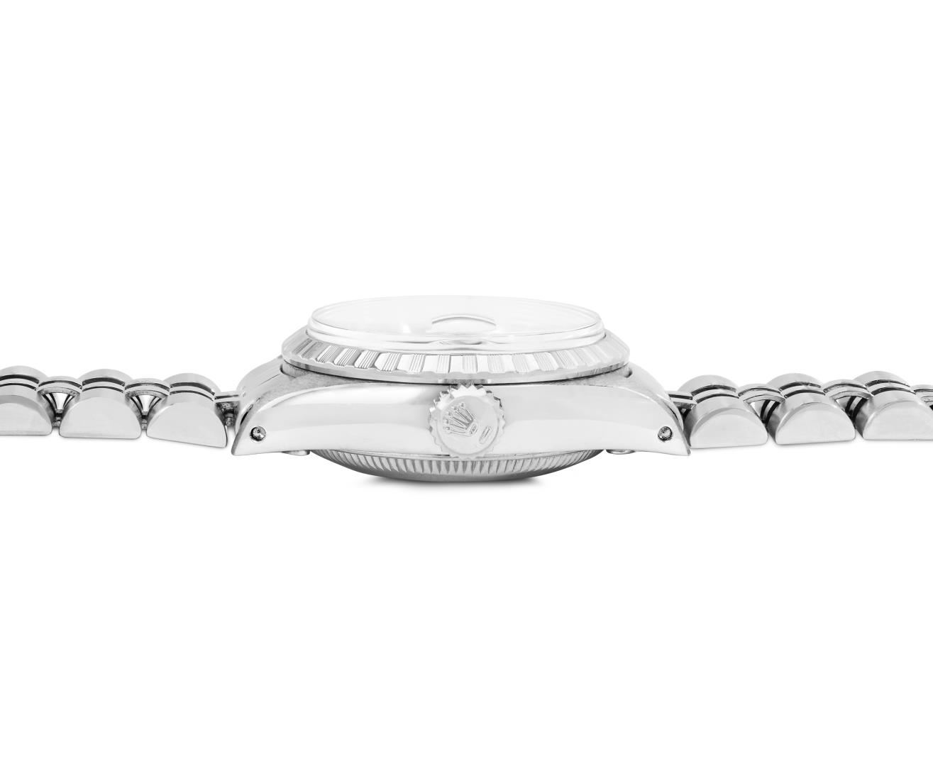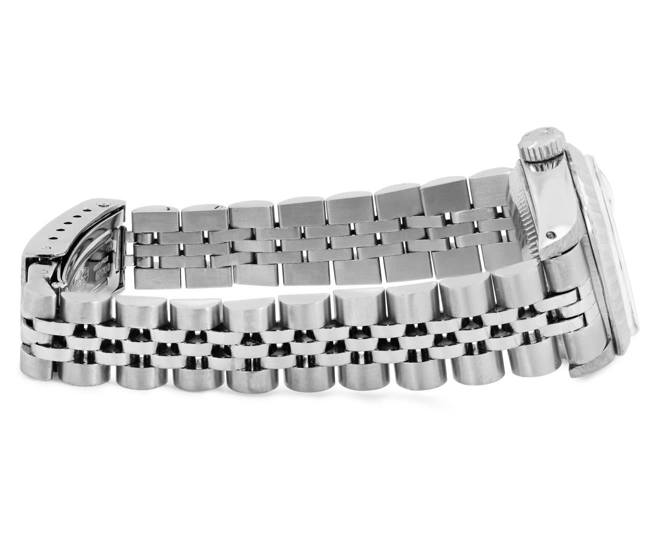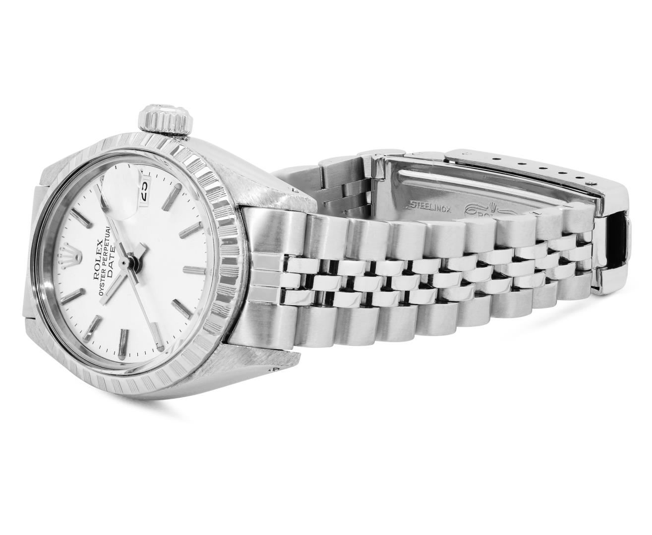 One Rolex Ladies Pre Owned Stainless Steel Date Wristwatch Polished Bright with Satin Finish, Serviced And Electronically Tested, Stainless Steel Case: 26mm, Stainless Steel Crown, Stainless Steel Engine Turn Bezel, Custom Crystal: New Acrylic With Magnifying Date Window. Custom Hands: New Luminescent Hands. Rolex Movement: Automatic Winding Movement 2035. Rolex Dial: Factory Silver With Index Hour Markers And Lumi Dots. Date Window: 3 O'Clock Position Date Display, Model: Datejust. Condition: G-6 Extra Fine. Rolex Bracelet: Stainless Steel Jubilee Band. Bright Polish & Satin Finish. 6.0 Inch Length, Adjustable. Standard Clasp, With Rolex Logo. This Watch Has Been Serviced Time Tested And Is In Excellent Condition. It Is Free Of All Scratches And Dents. This Watch Comes With A Rolex Box.