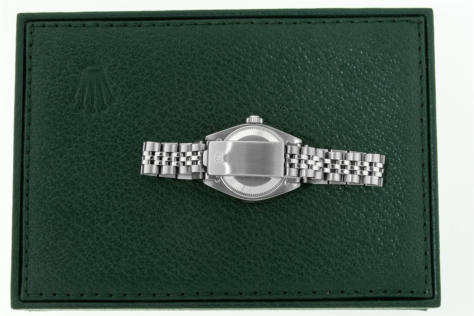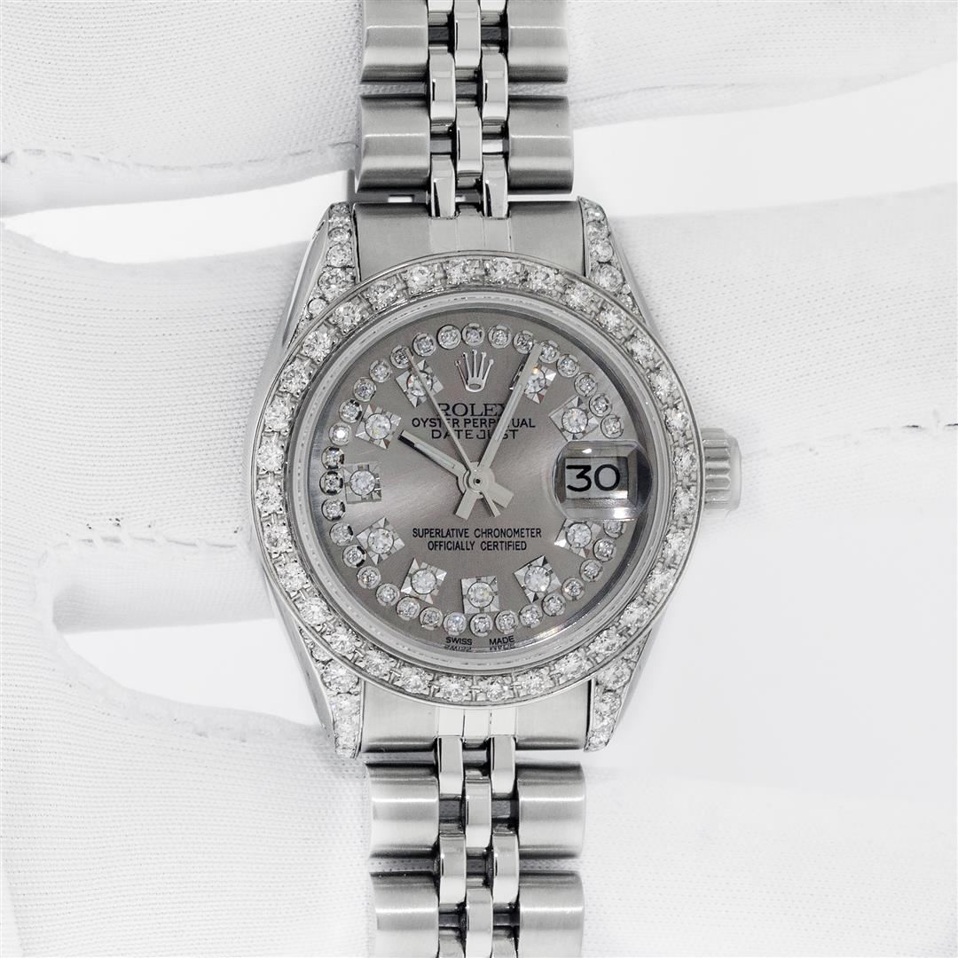One Ladies Stainless Steel Rolex Datejust Polished Bright with Satin Finish, Serviced & Electronically Tested, Stainless Steel Case: 26mm, Stainless Steel Crown, Custom Diamond Lugs: 24 Diamonds On Lugs, Clarity: SI-VS, Color: G to H. Custom Bezel: New 18K White Gold Beadset Diamond Bezel, Stone Count: 32 Diamonds, Total Weight .70 Carat, Clarity: SI-VS, Color: G to H. Custom Crystal: New Scratch Resistant Synthetic Sapphire Cyclops Lens. Custom Hands: New Luminescent Hands. Movement: Automatic Winding Movement . Custom Dial: Refinished Slate Grey String Diamond Dial, 43 Diamonds in Dial, G To H In Color, Clarity: VS. Date Window: 3 O'Clock Position Date Display, Model: Datejust. Condition: G-6 Extra Fine. Bracelet: Stainless Steel Jubilee Band. Bright Polish & Satin Finish. 6.0 Inch Length, Adjustable. Standard Clasp, With Rolex Logo. This Watch Has Been Serviced Time Tested And Is In Excellent Condition It Is Free Of All Scratches And Dents. This Watch Comes With A Rolex Box.