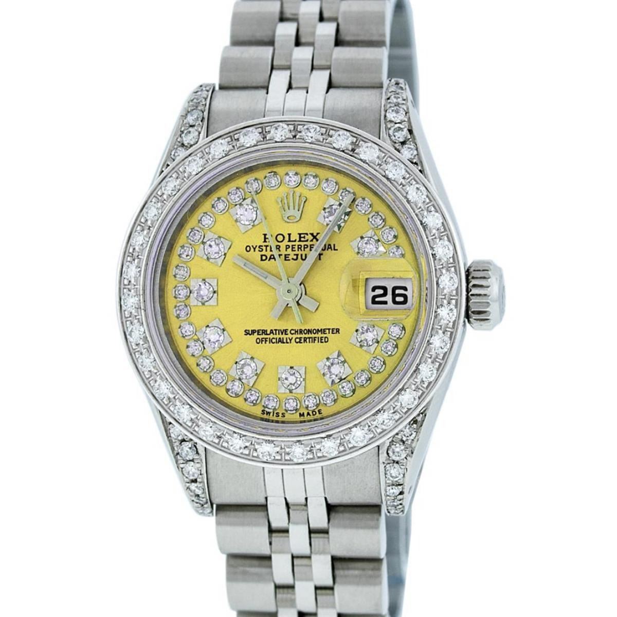 One Ladies Stainless Steel Rolex Datejust Polished Bright with Satin Finish, Serviced & Electronically Tested, Stainless Steel Case: 26mm, Stainless Steel Crown, Custom Diamond Lugs: 24 Diamonds On Lugs, Clarity: SI-VS, Color: G to H. Custom Bezel: New 18K White Gold Beadset Diamond Bezel, Stone Count: 32 Diamonds, Total Weight .70 Carat, Clarity: SI-VS, Color: G to H. Custom Crystal: New Scratch Resistant Synthetic Sapphire Cyclops Lens. Custom Hands: New Luminescent Hands. Movement: Automatic Winding Movement. Custom Dial: Refinished Yellow String Diamond Dial, 43 Diamonds in Dial G To H In Color, Clarity: VS. Date Window: 3 O'Clock Position Date Display, Model: Datejust. Condition: G-6 Extra Fine. Bracelet: Stainless Steel Jubilee Band. Bright Polish & Satin Finish. 6.0 Inch Length, Adjustable. Standard Clasp, With Rolex Logo. This Watch Has Been Serviced Time Tested And Is In Excellent Condition It Is Free Of All Scratches And Dents.