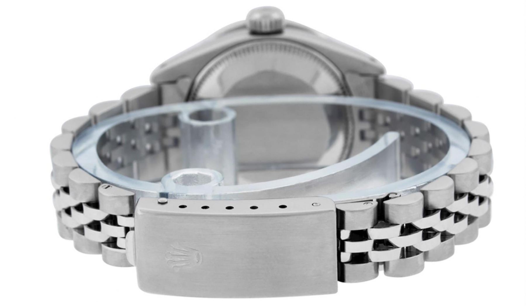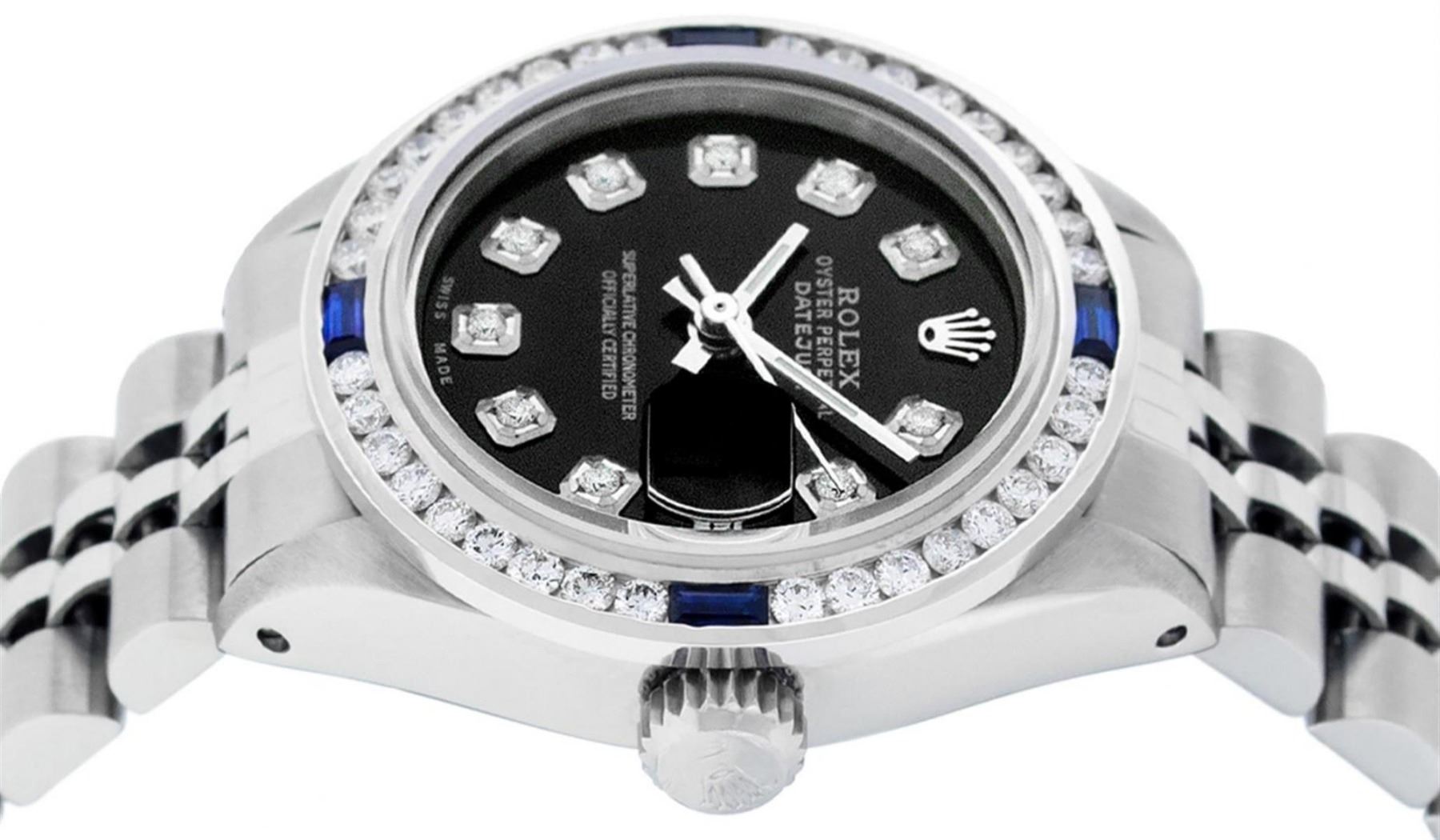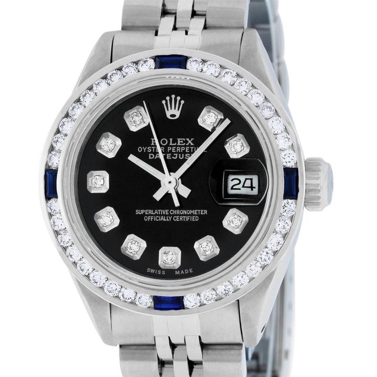 One Ladies Stainless Steel Rolex Oyster Perpetual Datejust Polished Bright with Satin Finish, Serviced & Electronically Tested, Stainless Steel Case: 26mm, Stainless Steel Crown, Custom Bezel: New 18K 1.0ctw White Gold Sapphire Channel Set Diamond Bezel, Diamond + Gem Count: 36 Diamonds + 4 Sapphires, Total Weight 1.00 Carat, Clarity: SI-VS, Color: G to H. Custom Crystal: New Synthetic Sapphire Cyclops Lens. Custom Hands: New Luminescent Hands. Movement: Automatic Winding Movement. Custom Dial: Refinished Black With Diamond Hour Markers. Date Window: 3 O'Clock Position Date Display, Model: Datejust. Condition: G-6 Extra Fine. Bracelet: Stainless Steel Jubilee Band. Bright Polish & Satin Finish. 6.0 Inch Length, Adjustable. Standard Clasp, With Rolex Logo. This Watch Has Been Serviced Time Tested And Is In Excellent Condition It Is Free Of All Scratches And Dents.
