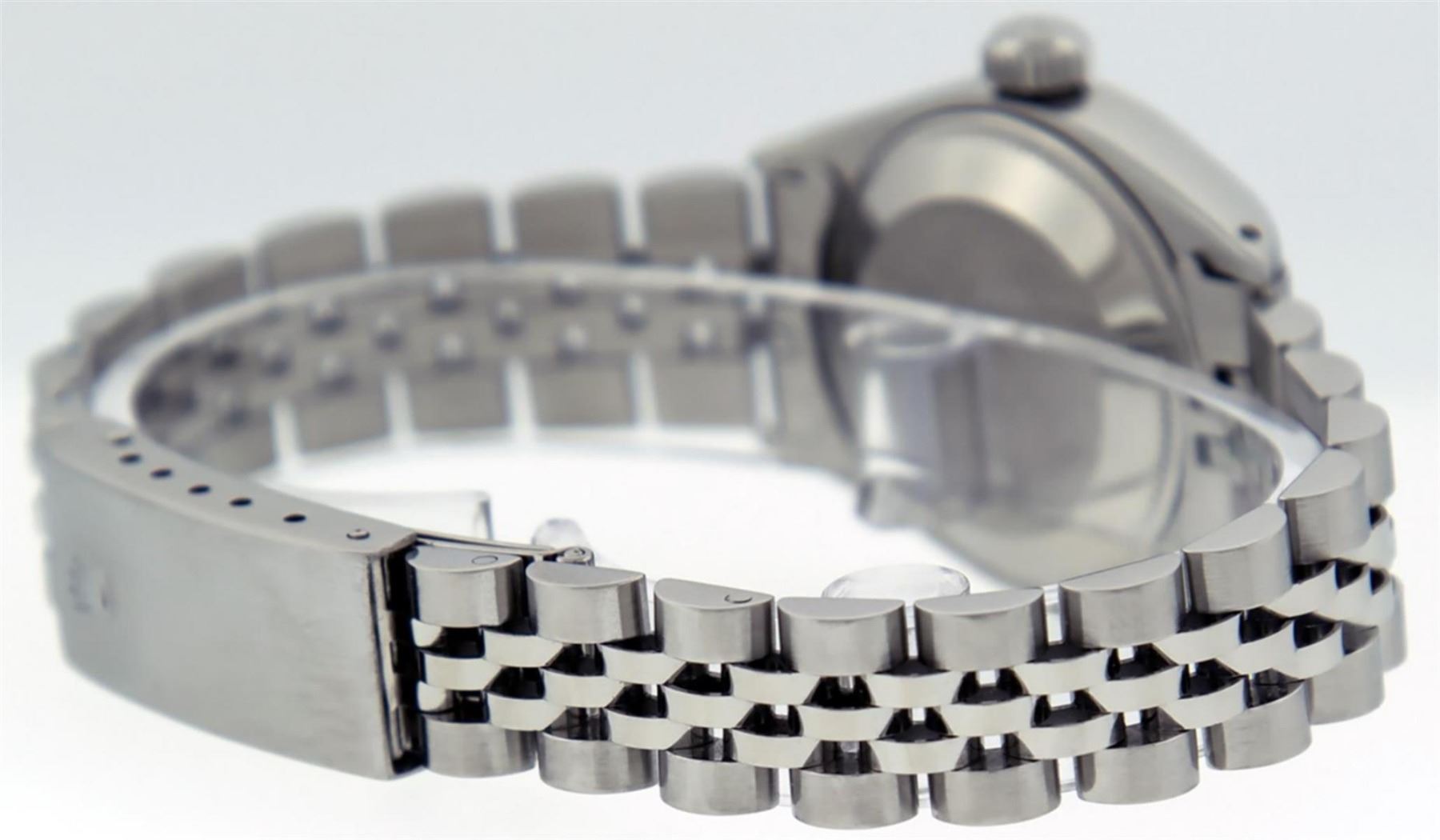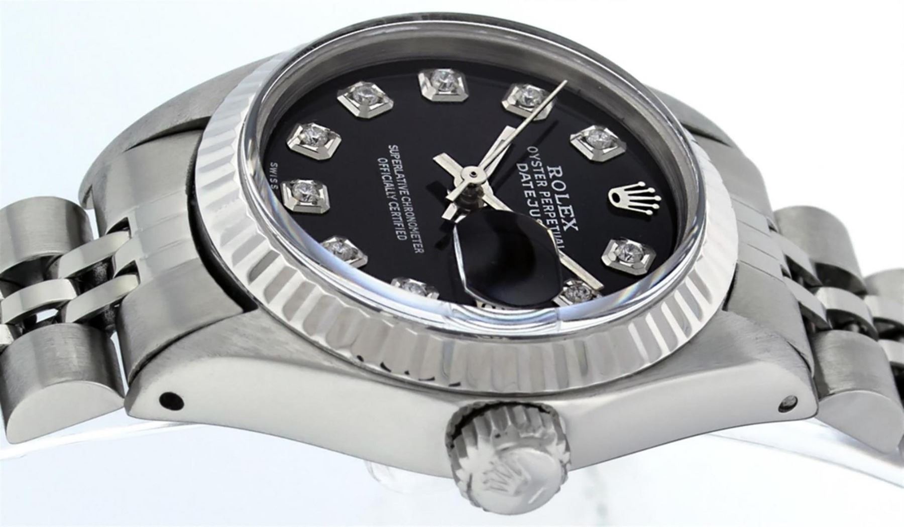One Ladies Stainless Steel Rolex Datejust Polished Bright with Satin Finish, Serviced & Electronically Tested, Stainless Steel Case: 26mm, Stainless Steel Crown, Bezel: 14K White Gold Fluted Bezel. Custom Crystal: New Acrylic Cyclops Lens. Custom Hands: New Luminescent Hands. Movement: Automatic Winding Movement Caliber 2030. Dial: Black Diamond Dial, Diamond Count: 10 Diamonds In Dial, Color: G to H, Clarity: SI-VS. Date Window: 3 O'Clock Position Date Display, Model: Datejust. Condition: G-6 Extra Fine. Bracelet: Stainless Steel Jubilee Band. Bright Polish & Satin Finish. 6.0 Inch Length, Adjustable. Standard Clasp, With Rolex Logo. This Watch Has Been Serviced Time Tested And Is In Excellent Condition It Is Free Of All Scratches And Dents.