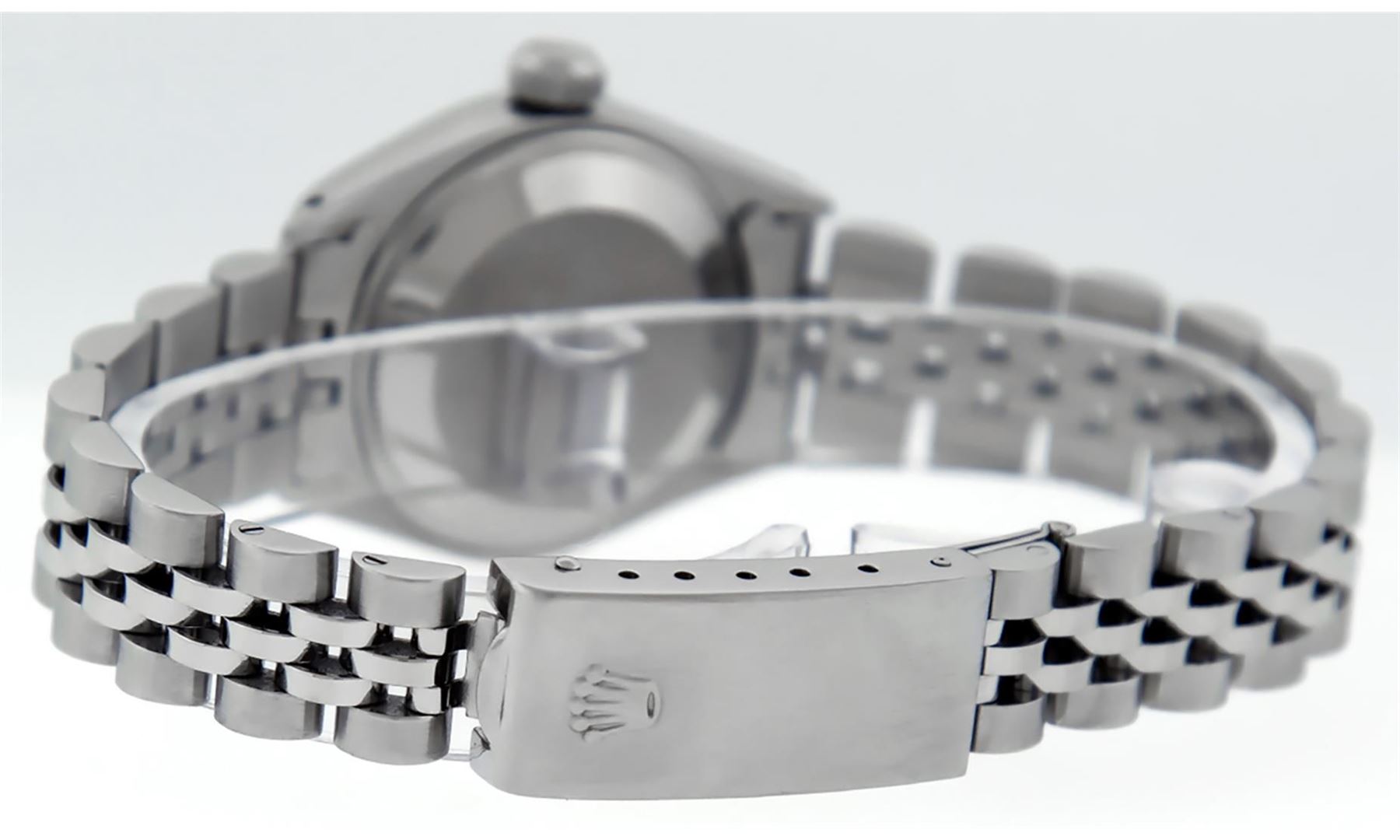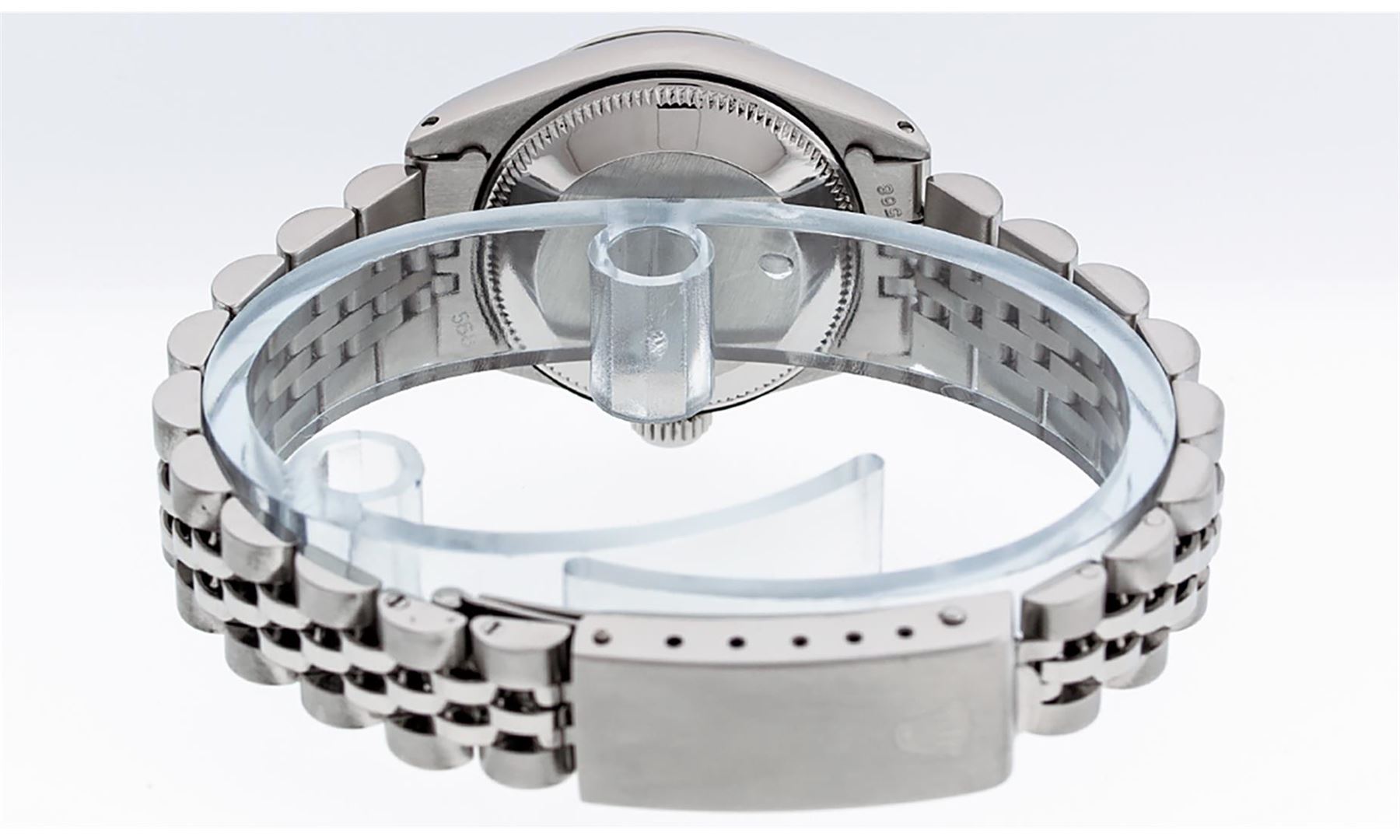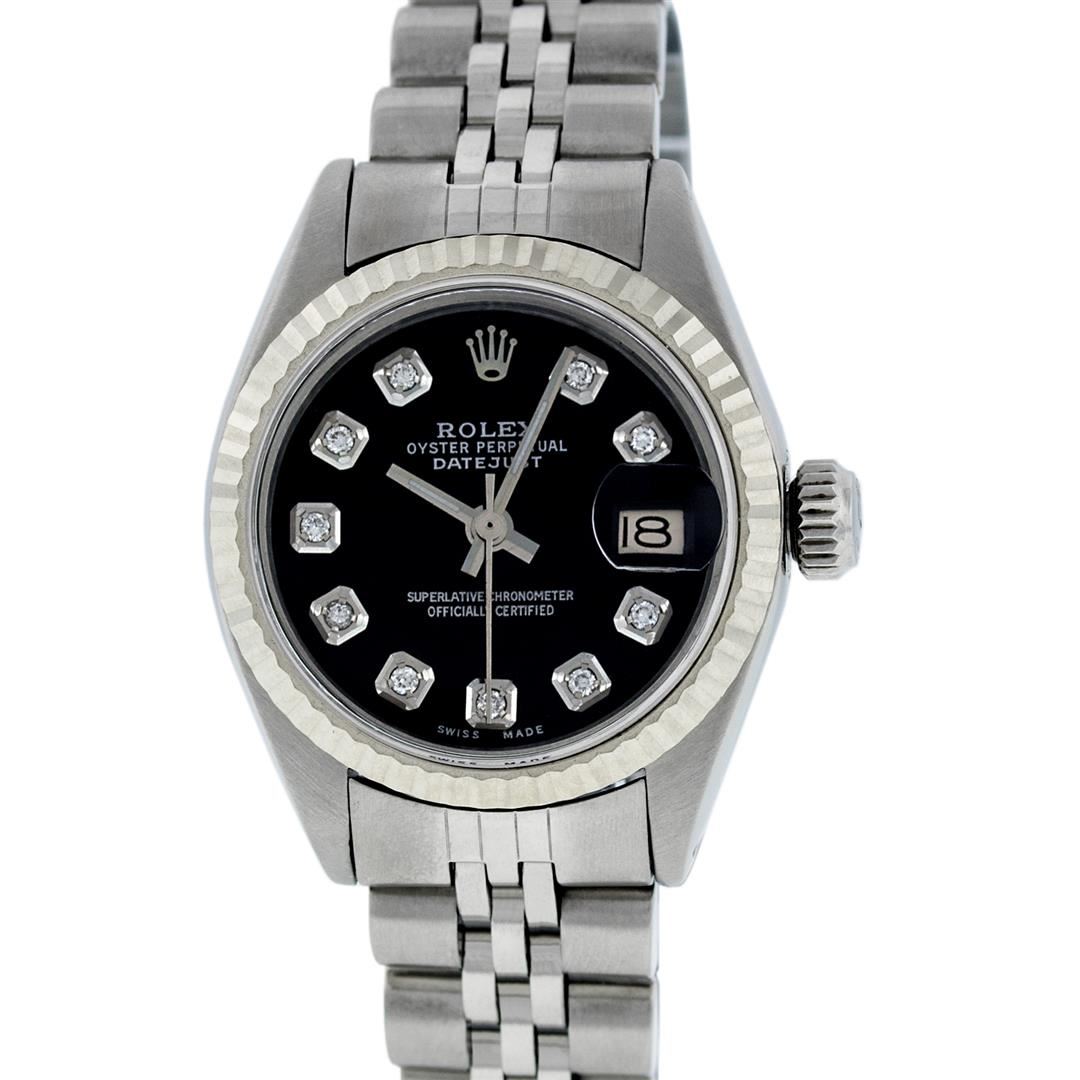 One Ladies Stainless Steel Rolex Datejust Polished Bright with Satin Finish, Serviced & Electronically Tested, Stainless Steel Case: 26mm, Stainless Steel Crown, Bezel: 14K White Gold Fluted Bezel. Custom Crystal: New Acrylic Cyclops Lens. Custom Hands: New Luminescent Hands. Movement: Automatic Winding Movement. Dial: Black Diamond Dial, Diamond Count: 10 Diamonds In Dial, Color: G to H, Clarity: SI-VS. Date Window: 3 O'Clock Position Date Display, Model: Datejust. Condition: G-6 Extra Fine. Bracelet: Stainless Steel Jubilee Band. Bright Polish & Satin Finish. 6.0 Inch Length, Adjustable. Standard Clasp, With Rolex Logo. This Watch Has Been Serviced Time Tested And Is In Excellent Condition It Is Free Of All Scratches And Dents.