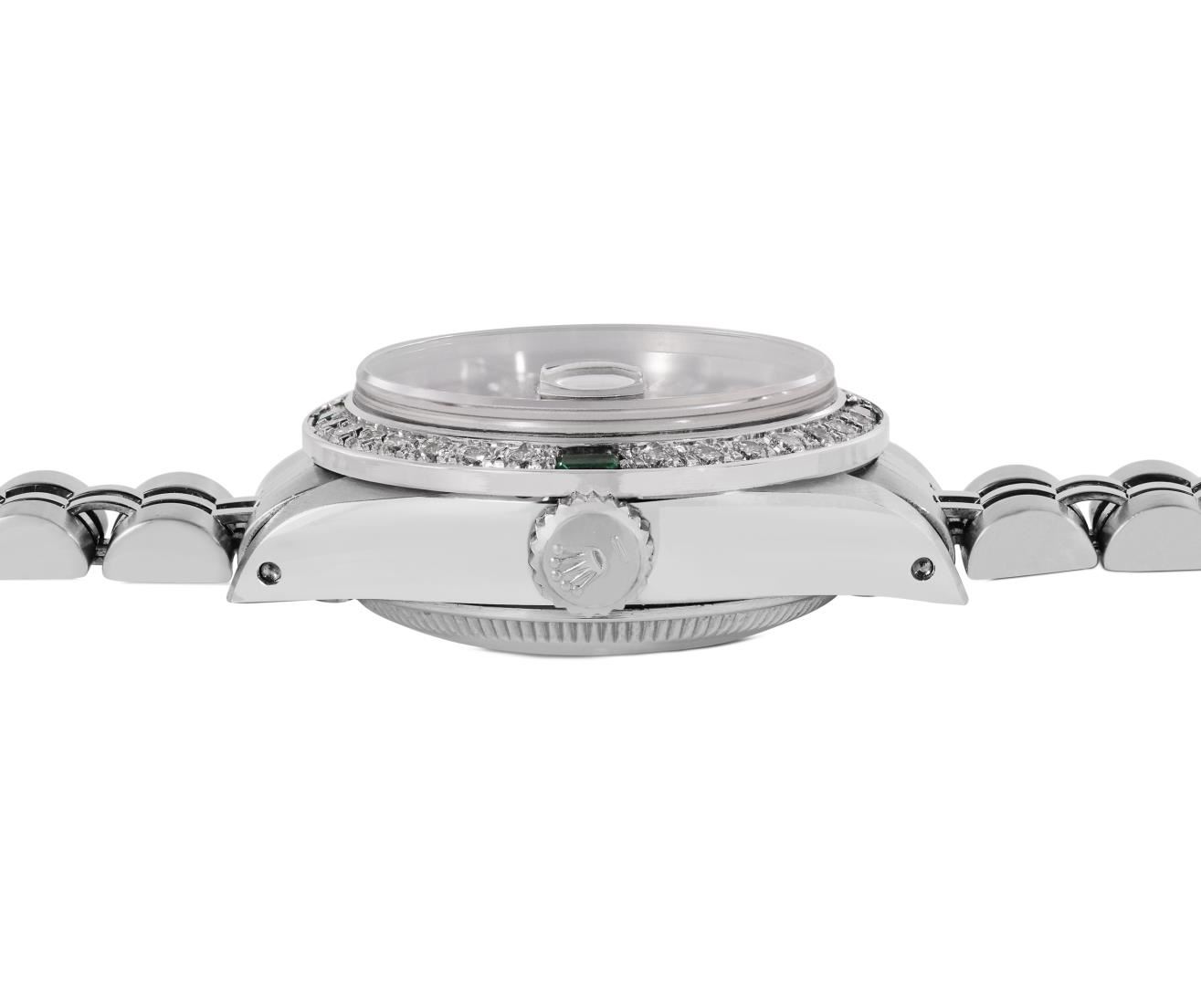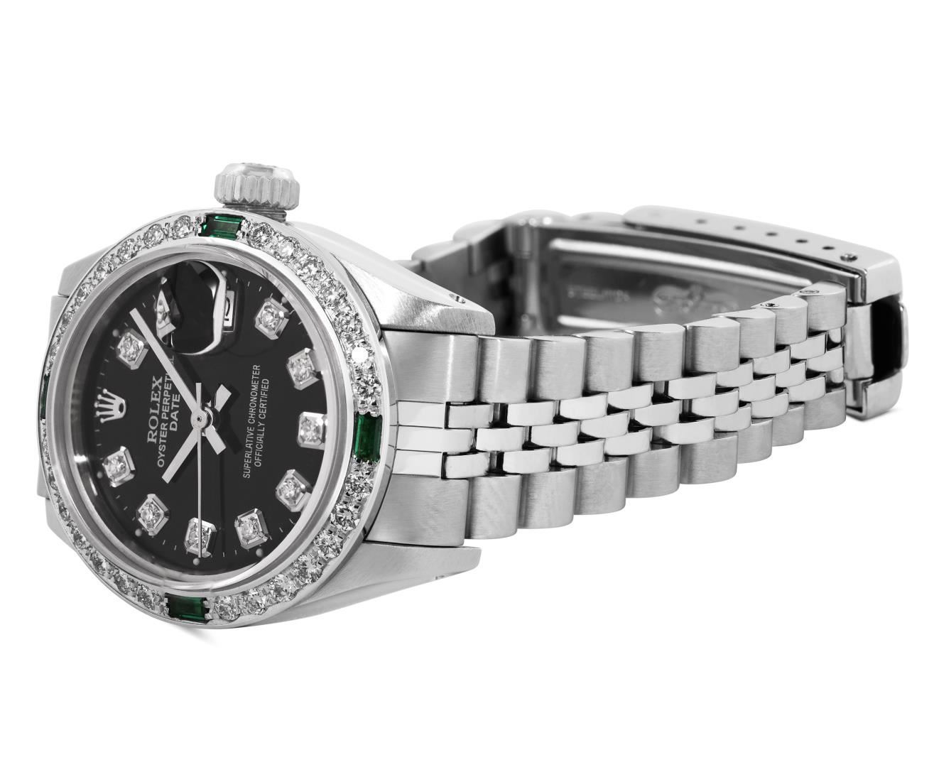 One Rolex Ladies Pre Owned Stainless Steel Date Wristwatch Polished Bright with Satin Finish, Serviced and Electronically Tested, Stainless Steel Case: 26mm, Stainless Steel Crown, Custom Bezel: New 18K White Gold Emerald Beadset Diamond Bezel, Diamond + Gem Count: 36 Diamonds + 4 Emeralds. Custom Crystal: New Sapphire With Magnified Date Window. Rolex Movement: Automatic Winding Movement 2035. Custom Dial: Custom Black Dial With Added Diamond Hour Markers, Dash Tracks, And Lumi Dots. Date Window: 3 O'Clock Position Date Display, Model: Date. Condition: G-6 Extra Fine. Rolex Bracelet: Stainless Steel Jubilee Band. Bright Polish and Satin Finish. 6.0 Inch Length, Adjustable. Standard Clasp, With Rolex Logo. This Watch Has Been Serviced Time Tested And Is In Excellent Condition. It Is Free Of All Scratches And Dents.