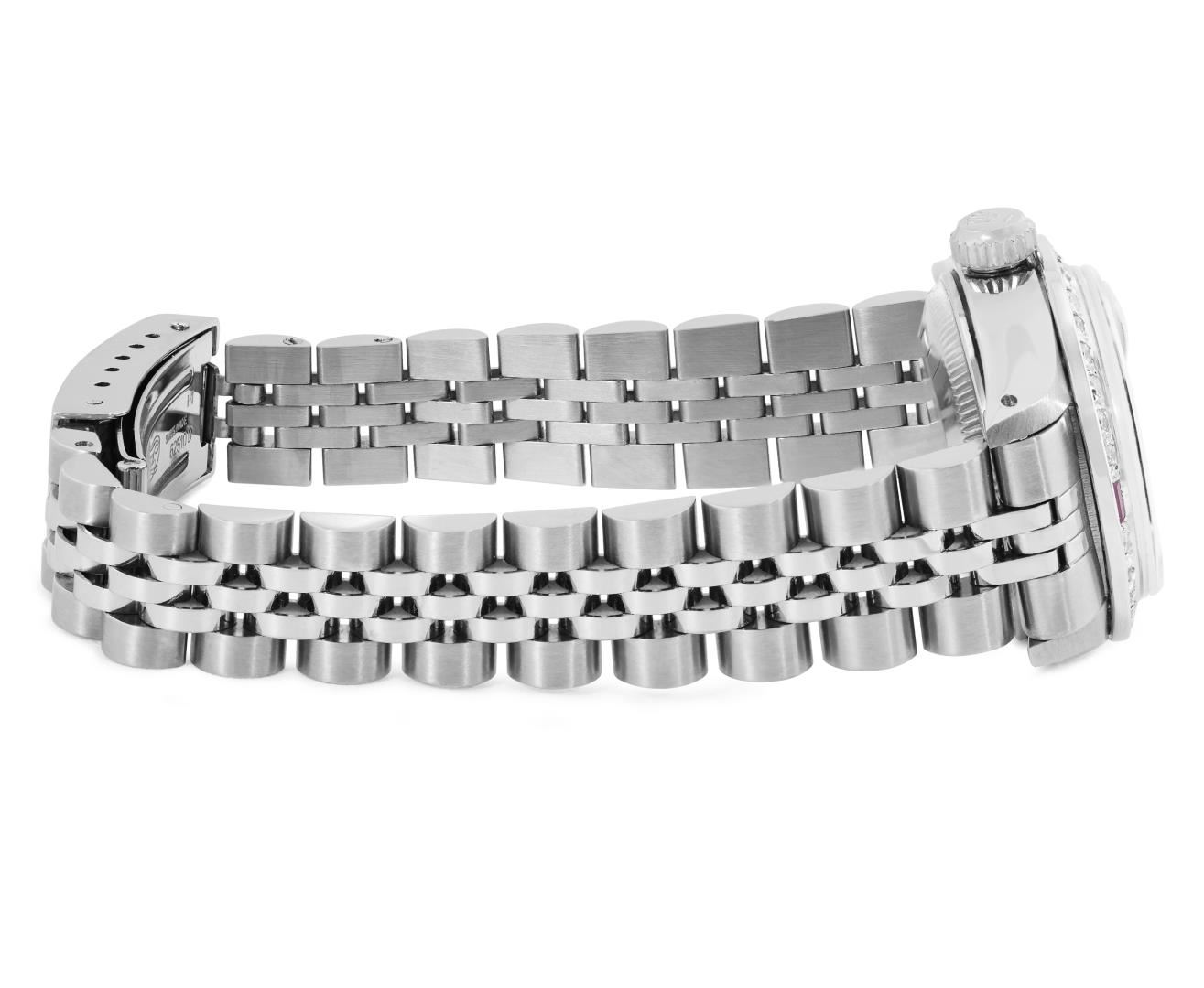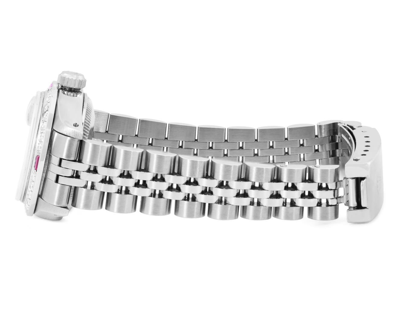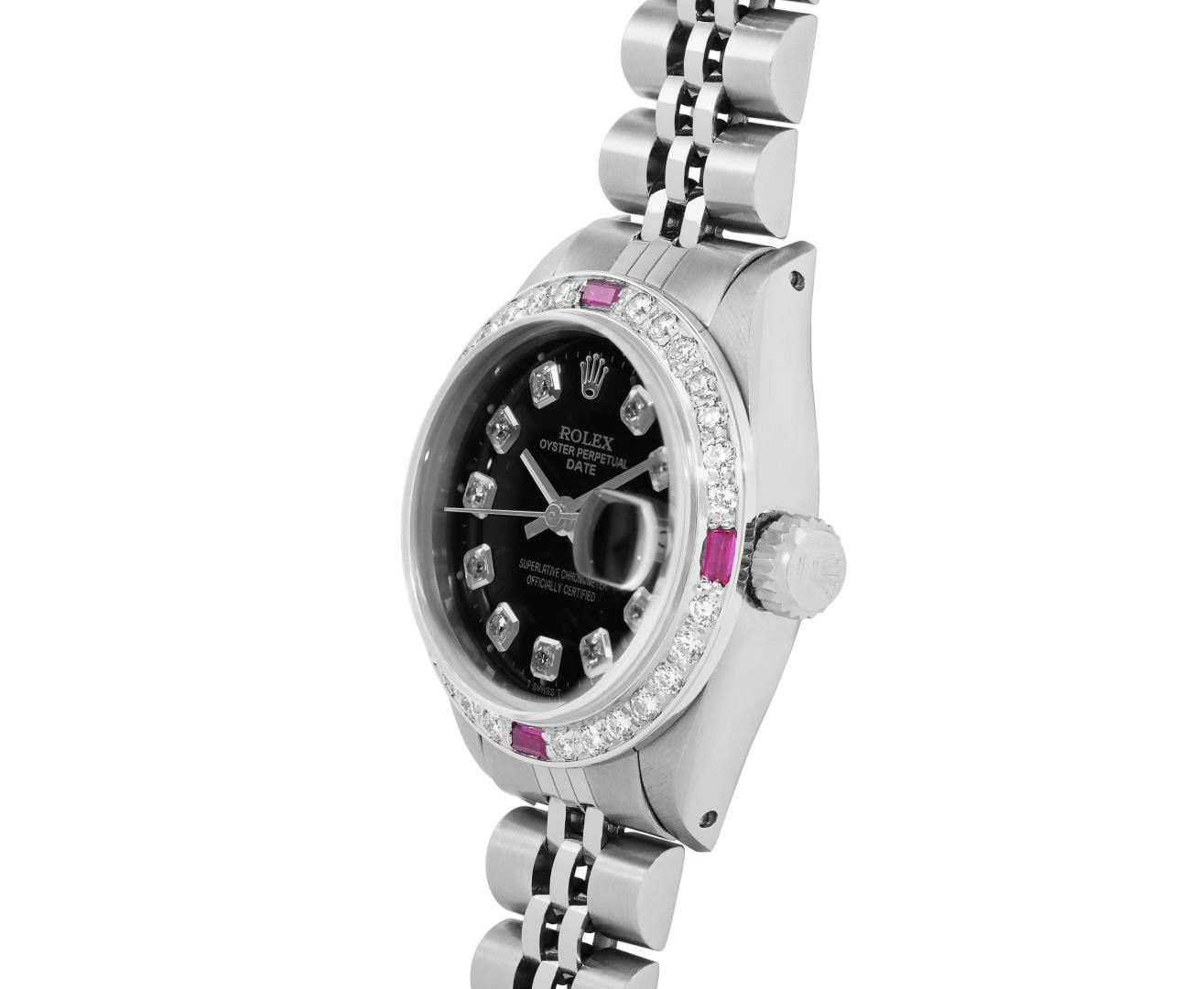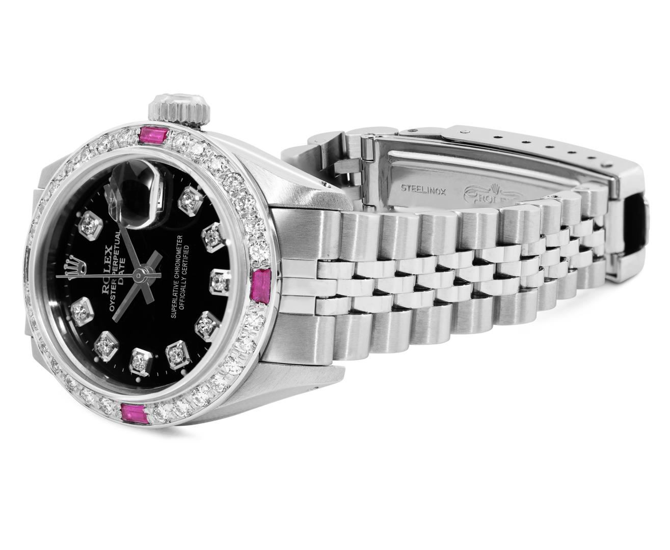One Rolex Ladies Pre Owned Stainless Steel Date Wristwatch Polished Bright with Satin Finish, Serviced and Electronically Tested, Stainless Steel Case: 26mm, Stainless Steel Crown, Custom Bezel: New 18K White Gold Ruby Beadset Diamond Bezel, Diamond + Gem Count: 36 Diamonds + 4 Rubies. Custom Crystal: New Sapphire With Magnified Date Window. Rolex Movement: Automatic Winding Movement 2035. Custom Dial: Custom Black Dial With Added Diamond Hour Markers, Dash Tracks, And Lumi Dots. Date Window: 3 O'Clock Position Date Display, Model: Date. Condition: G-6 Extra Fine. Rolex Bracelet: Stainless Steel Jubilee Band. Bright Polish and Satin Finish. 6.0 Inch Length, Adjustable. Standard Clasp, With Rolex Logo. This Watch Has Been Serviced Time Tested And Is In Excellent Condition. It Is Free Of All Scratches And Dents.