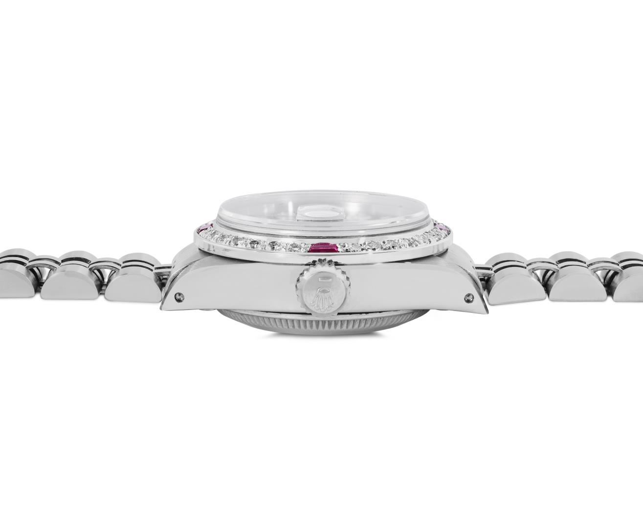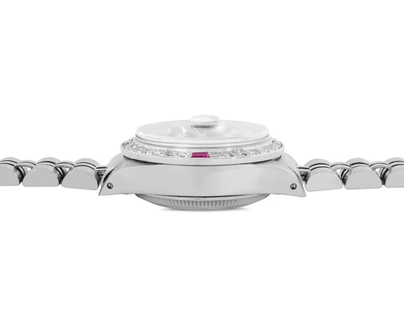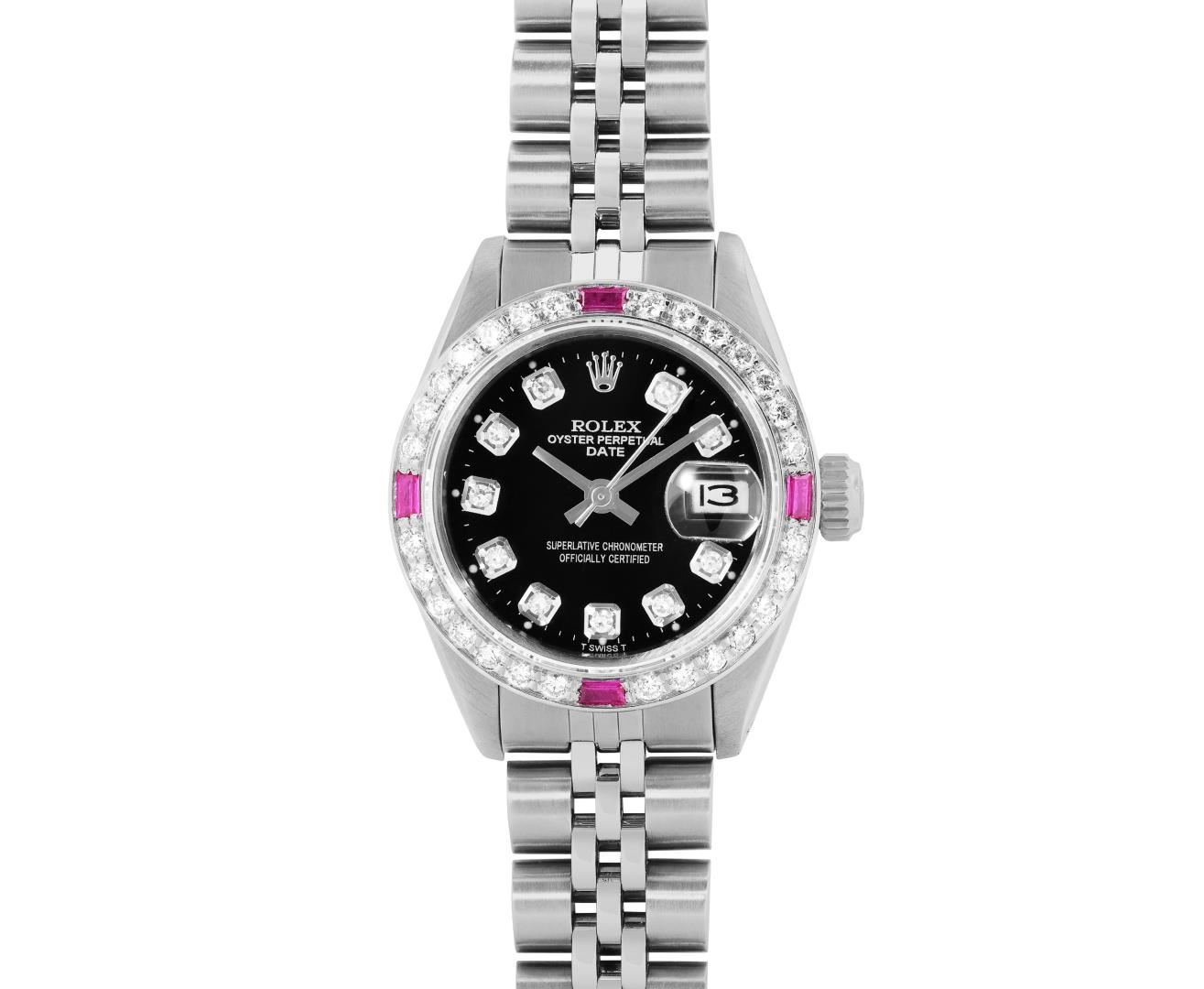 One Rolex Ladies Pre Owned Stainless Steel Date Wristwatch Polished Bright with Satin Finish, Serviced and Electronically Tested, Stainless Steel Case: 26mm, Stainless Steel Crown, Custom Bezel: New 18K White Gold Ruby Beadset Diamond Bezel, Diamond + Gem Count: 36 Diamonds + 4 Rubies. Custom Crystal: New Sapphire With Magnified Date Window. Rolex Movement: Automatic Winding Movement 2035. Custom Dial: Custom Black Dial With Added Diamond Hour Markers, Dash Tracks, And Lumi Dots. Date Window: 3 O'Clock Position Date Display, Model: Date. Condition: G-6 Extra Fine. Rolex Bracelet: Stainless Steel Jubilee Band. Bright Polish and Satin Finish. 6.0 Inch Length, Adjustable. Standard Clasp, With Rolex Logo. This Watch Has Been Serviced Time Tested And Is In Excellent Condition. It Is Free Of All Scratches And Dents.