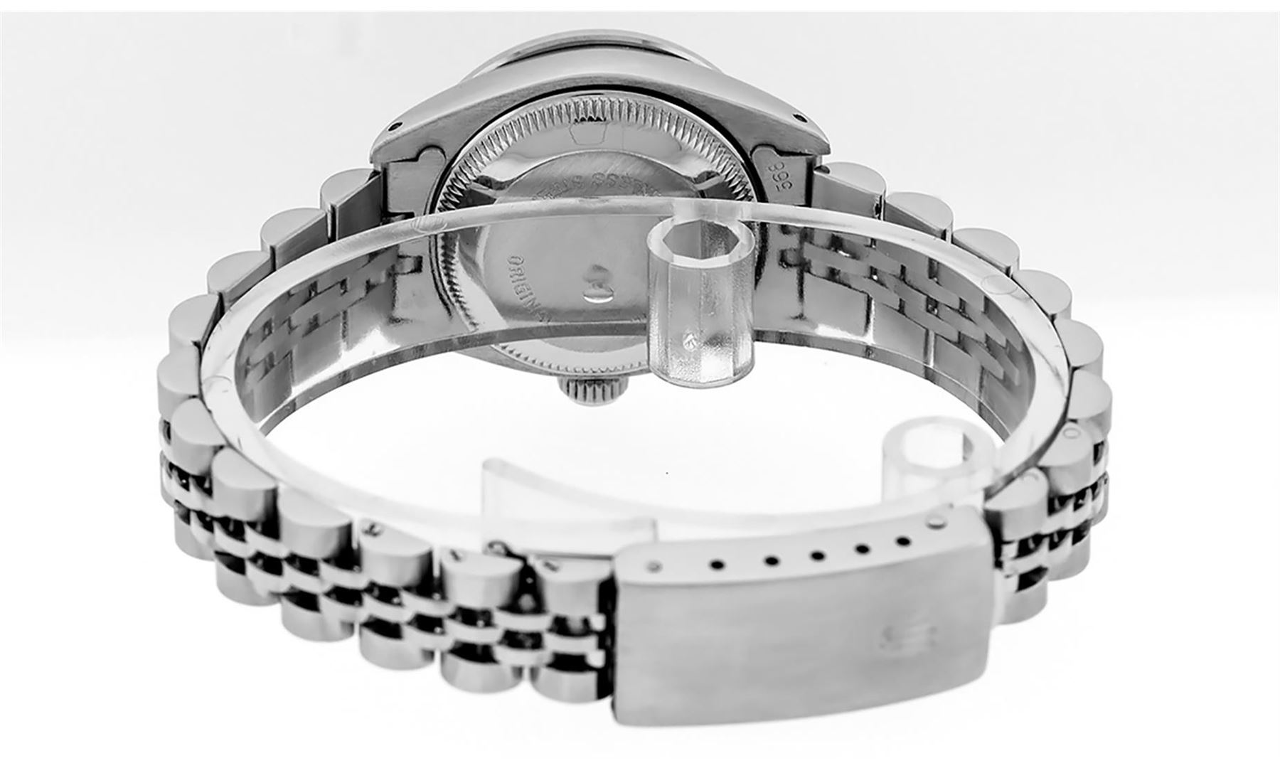 One Ladies Rolex Pre Owned Stainless Steel Wristwatch Polished Bright with Satin Finish, Serviced And Electronically Tested, Stainless Steel Case: 26mm, Stainless Steel Crown, Custom Bezel: New 18K White Gold Sapphire Beadset Diamond Bezel, Diamond + Gem Count: 28 Diamonds + 4 Sapphires. Custom Crystal: New Sapphire With Date Window. Custom Hands: New Luminescent Hands. Rolex Movement: Automatic Winding Movement. Custom Dial: Custom Black Dial With Added Diamonds, Diamond Count: 10 Diamond On Dial. Date Window: 3 O'Clock Position Date Display, Model: Datejust. Condition: G-6 Extra Fine. Rolex Bracelet: Stainless Steel Jubilee Band. Bright Polish & Satin Finish. 6.0 Inch Length, Adjustable. Standard Clasp, With Rolex Logo. This Watch Has Been Serviced Time Tested And Is In Excellent Condition It Is Free Of All Scratches And Dents.