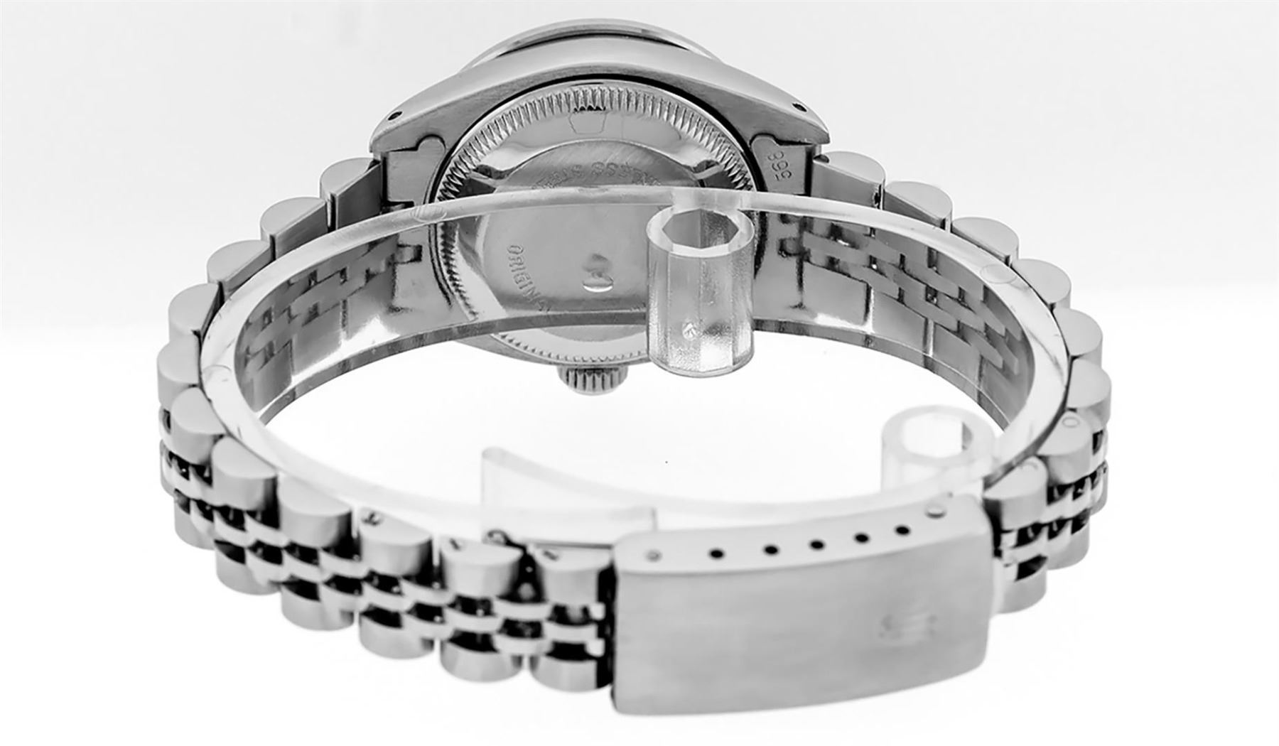 One Ladies Rolex Pre Owned Stainless Steel Wristwatch Polished Bright with Satin Finish, Serviced And Electronically Tested, Stainless Steel Case: 26mm, Stainless Steel Crown, Custom Bezel: New 18K White Gold Sapphire Beadset Diamond Bezel, Diamond + Gem Count: 28 Diamonds + 4 Sapphires. Custom Crystal: New Sapphire With Date Window. Custom Hands: New Luminescent Hands. Rolex Movement: Automatic Winding Movement. Custom Dial: Custom Black Dial With Added Diamonds, Diamond Count: 10 Diamond On Dial. Date Window: 3 O'Clock Position Date Display, Model: Datejust. Condition: G-6 Extra Fine. Rolex Bracelet: Stainless Steel Jubilee Band. Bright Polish & Satin Finish. 6.0 Inch Length, Adjustable. Standard Clasp, With Rolex Logo. This Watch Has Been Serviced Time Tested And Is In Excellent Condition It Is Free Of All Scratches And Dents.