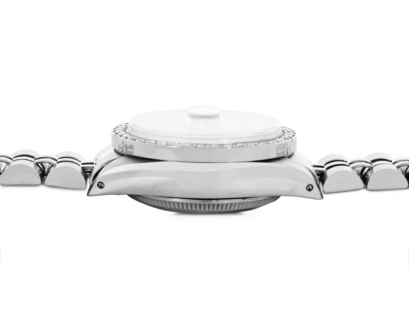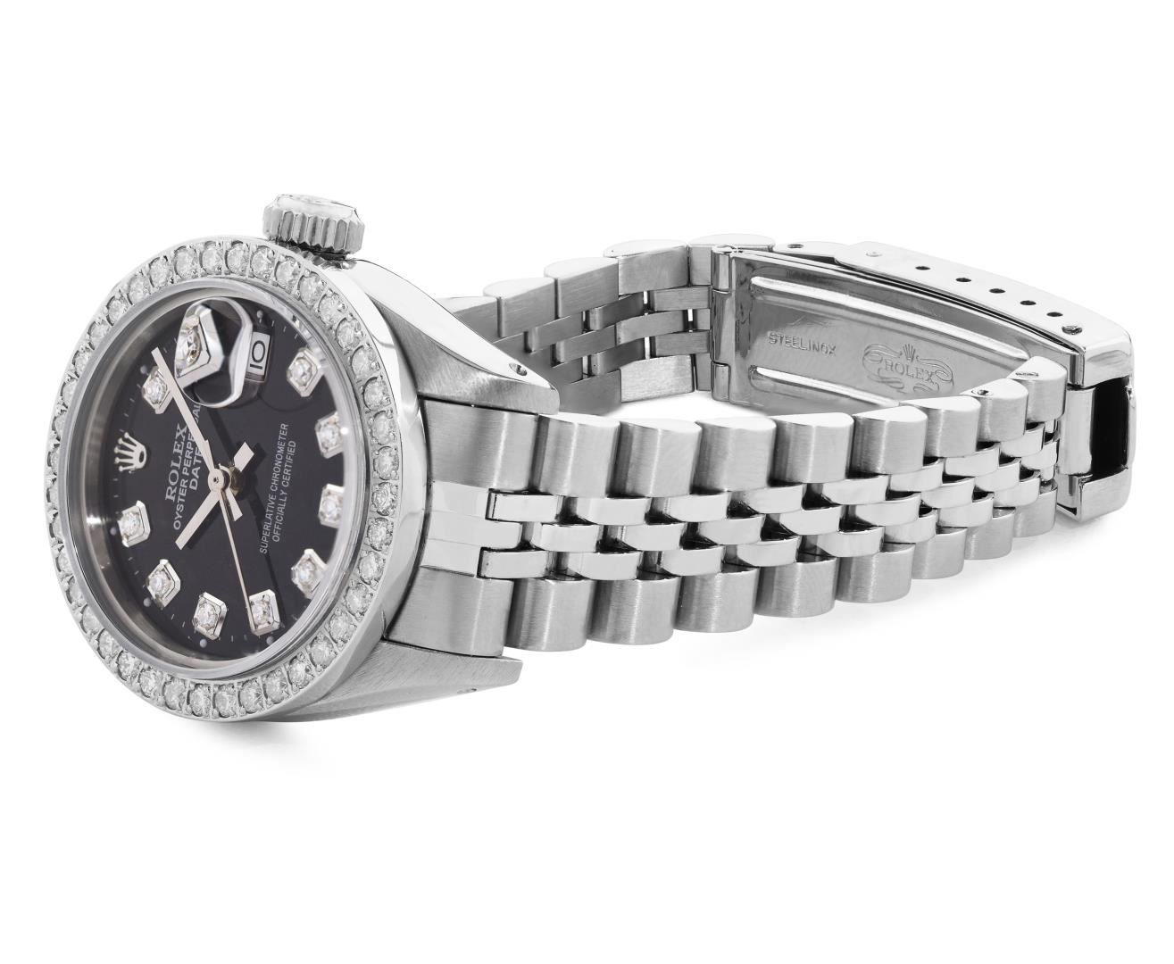 One Rolex Ladies Pre Owned Stainless Steel Date Wristwatch Polished Bright with Satin Finish, Serviced And Electronically Tested, Stainless Steel Case: 26mm, Stainless Steel Crown, Custom Bezel: New Stainless Steel Beadset Diamond Bezel, Diamond Count: 40 Diamonds. Custom Crystal: New Sapphire With Magnified Date Window. Custom Hands: New Solid Hands. Rolex Movement: Automatic Winding Movement 2035. Custom Dial: Custom Black Dial With Added Diamond Hour Markers And Lumi Dots, Diamond Count: 10 Diamonds On Dial. Date Window: 3 O'Clock Position Date Display, Model: Date. Condition: G-6 Extra Fine. Rolex Bracelet: Stainless Steel Jubilee Band. Bright Polish And Satin Finish. 6.0 Inch Length, Adjustable. Standard Clasp, With Rolex Logo. This Watch Has Been Serviced And Time Tested. It Is In Excellent Condition, Free Of All Scratches And Dents.