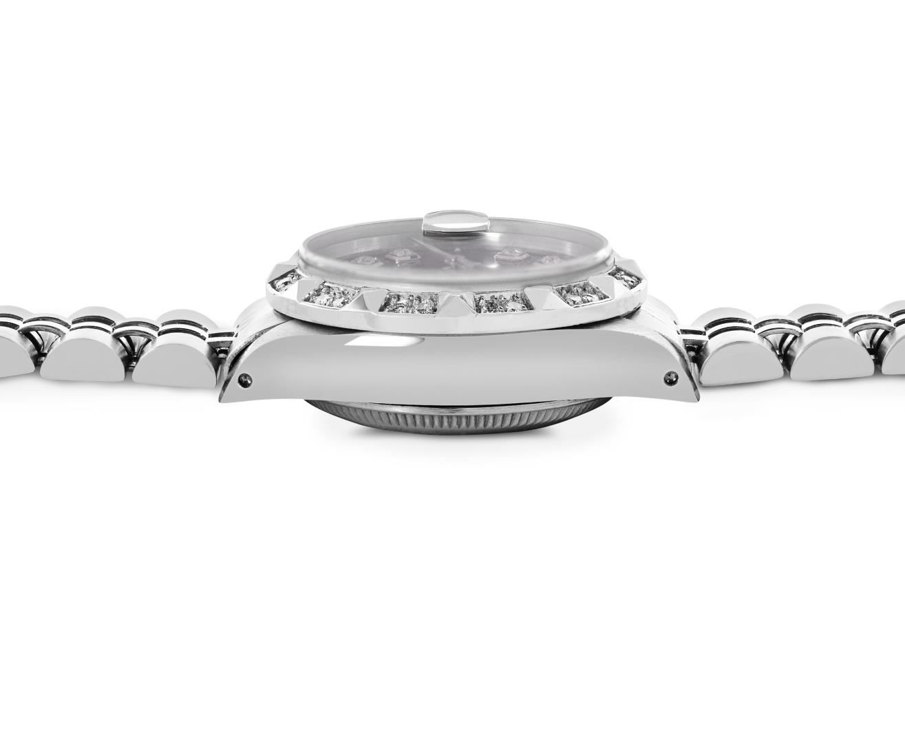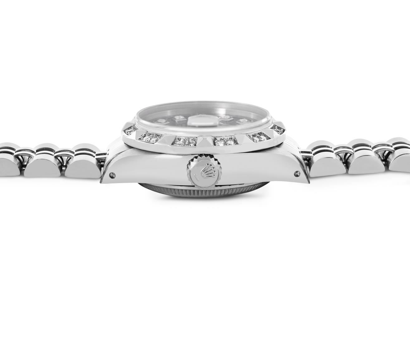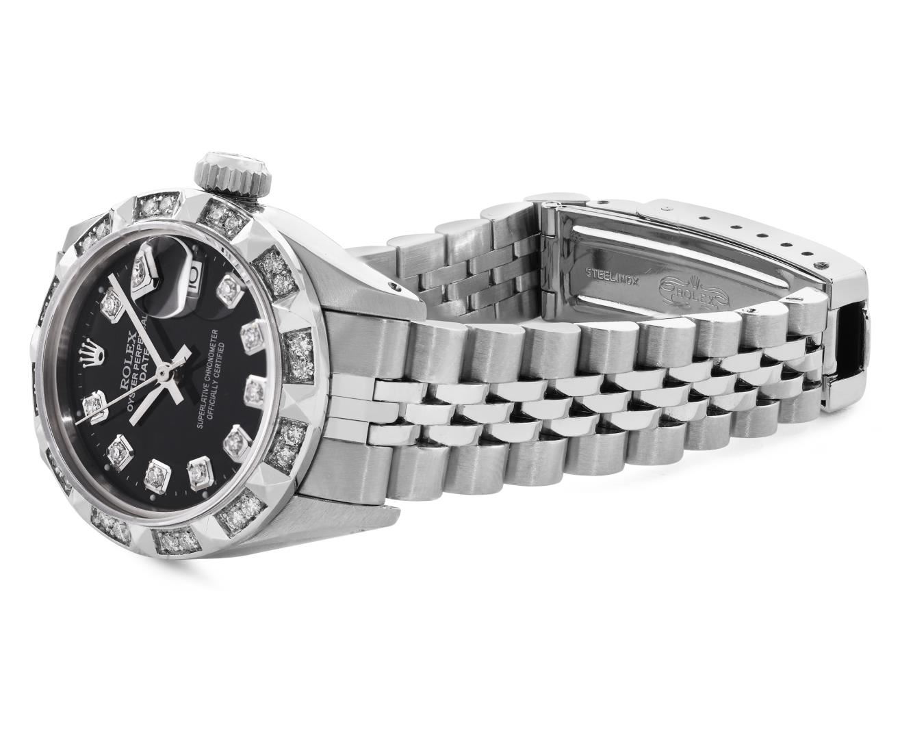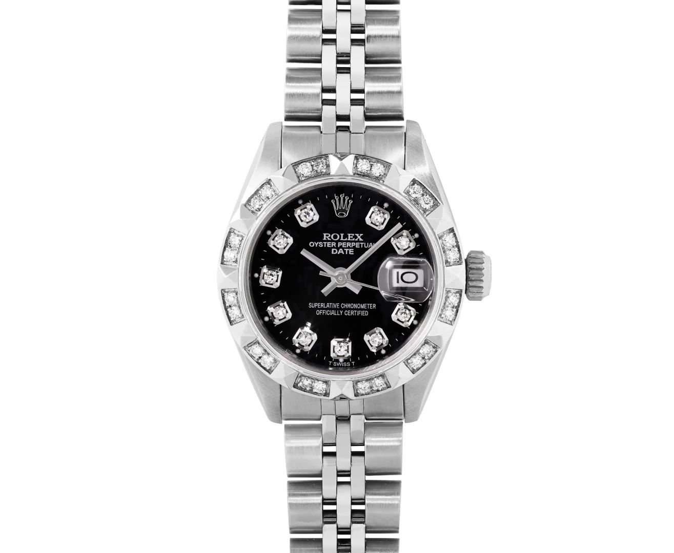 One Rolex Ladies Pre Owned Stainless Steel Date Wristwatch Polished Bright with Satin Finish, Serviced And Electronically Tested, Stainless Steel Case: 26mm, Stainless Steel Crown, Custom Bezel: New 18K White Gold Pyramid Diamond Bezel, Diamond Count: 24 Diamonds On Bezel. Custom Crystal: New Sapphire With Magnified Date Window. Custom Hands: New Non Luminescent Hands. Rolex Movement: Automatic Winding Movement 2035. Custom Dial: Custom Black Dial With Added Diamond Hour Markers Dash Track, and Lumi Dots. Date Window: 3 O'Clock Position Date Display, Model: Date. Condition: G-6 Extra Fine. Rolex Bracelet: Stainless Steel Jubilee Band. Bright Polish And Satin Finish. 6.0 Inch Length, Adjustable. Standard Clasp, With Rolex Logo. This Watch Has Been Serviced Time Tested And Is In Excellent Condition. It Is Free Of All Scratches And Dents.