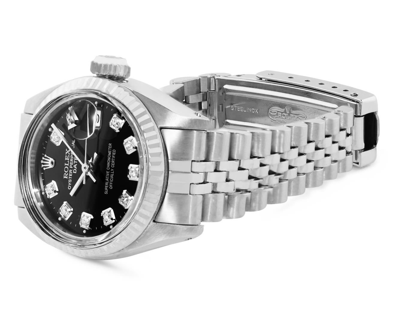One Rolex Ladies Pre Owned Stainless Steel Date Wristwatch Polished Bright with Satin Finish, Serviced and Electronically Tested, Stainless Steel Case: 26mm, Stainless Steel Crown, 14K White Gold Fluted Bezel, Custom Crystal: New Acrylic With Magnifying Date Window. Custom Hands: New Solid Hands. Rolex Movement: Automatic Winding Movement 2035. Custom Dial: Custom Black Dial With Added Diamond Hour Markers, Dash Tracks, And Lumi Dots, Diamond Count: 10 Diamonds On Dial. Date Window: 3 O'Clock Position Date Display, Model: Date. Condition: G-6 Extra Fine. Rolex Bracelet: Stainless Steel Jubilee Band. Bright Polish and Satin Finish. 6.0 Inch Length, Adjustable. Standard Clasp, With Rolex Logo. This Watch Has Been Serviced Time Tested And Is In Excellent Condition. It Is Free Of All Scratches And Dents.