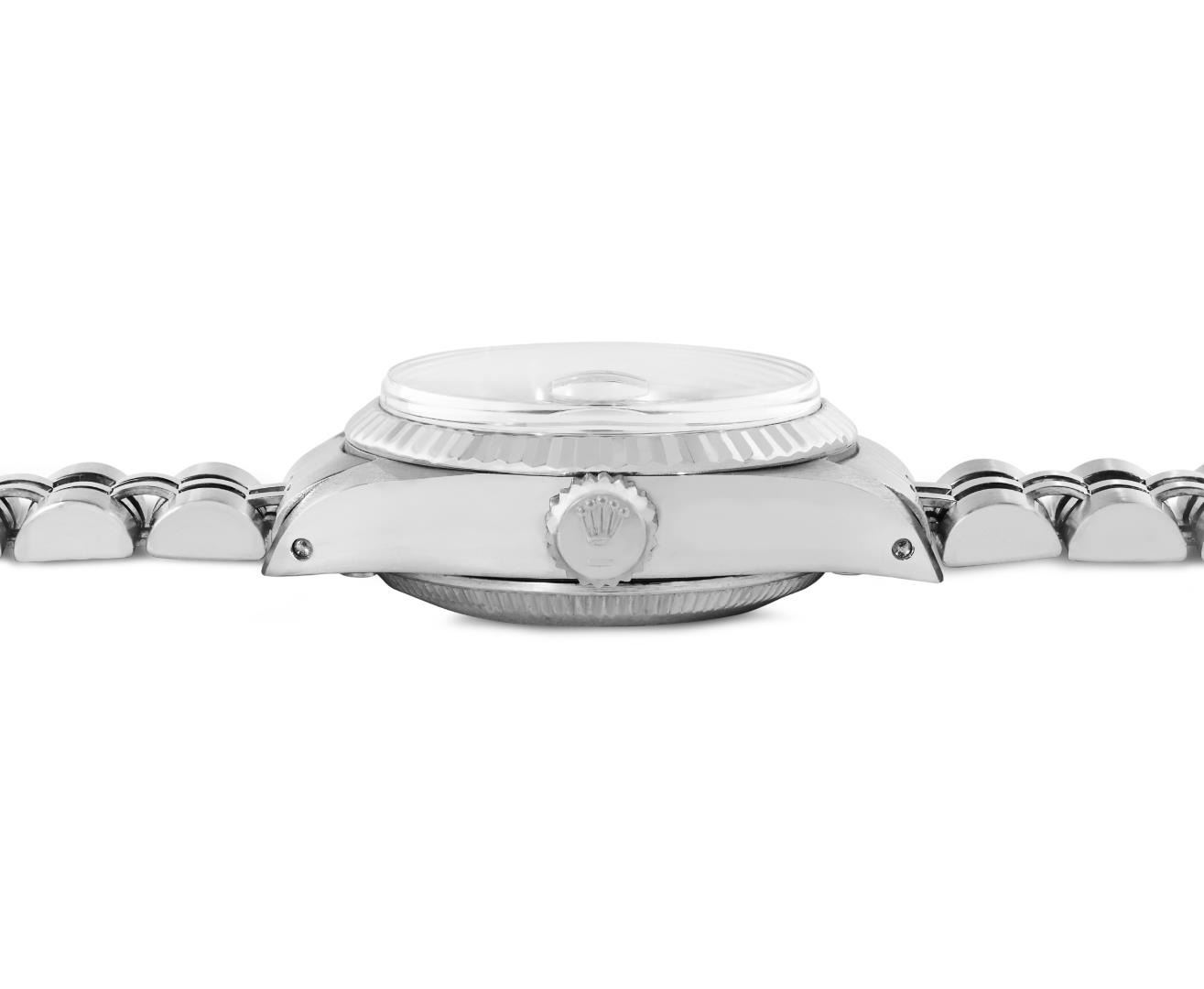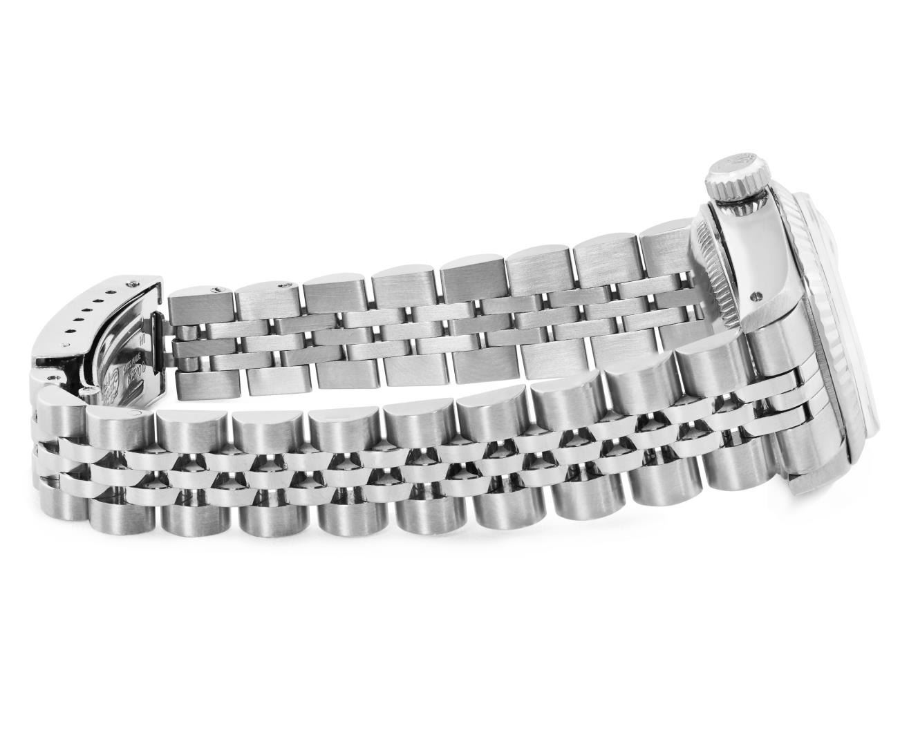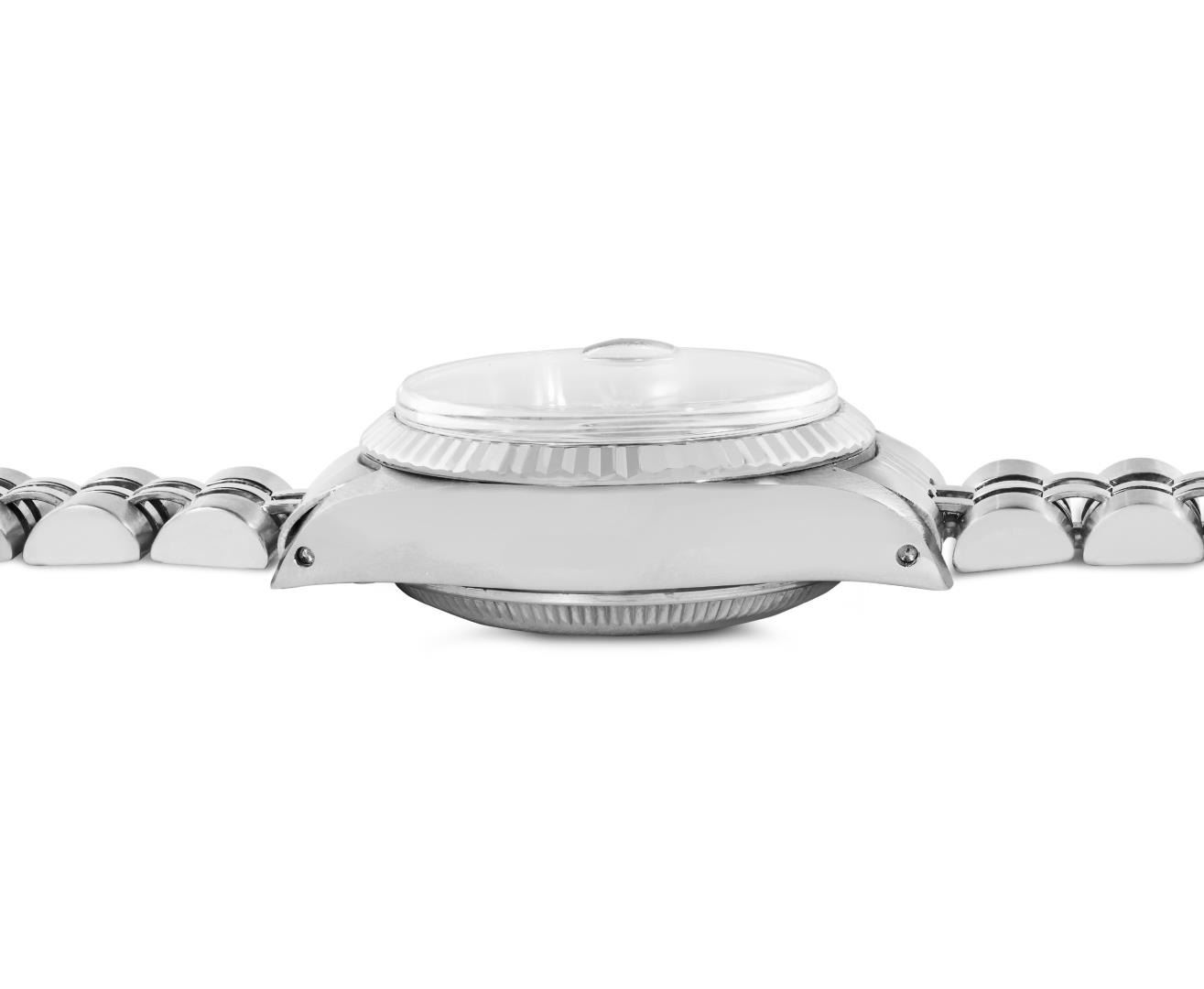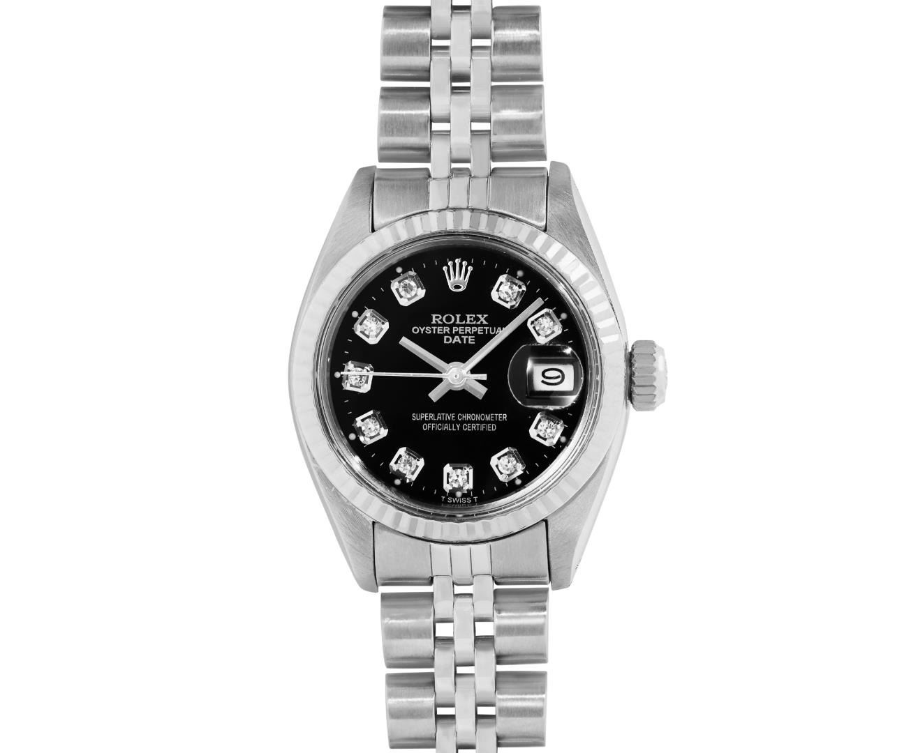 One Rolex Ladies Pre Owned Stainless Steel Date Wristwatch Polished Bright with Satin Finish, Serviced and Electronically Tested, Stainless Steel Case: 26mm, Stainless Steel Crown, 14K White Gold Fluted Bezel, Custom Crystal: New Acrylic With Magnifying Date Window. Custom Hands: New Solid Hands. Rolex Movement: Automatic Winding Movement 2035. Custom Dial: Custom Black Dial With Added Diamond Hour Markers, Dash Tracks, And Lumi Dots, Diamond Count: 10 Diamonds On Dial. Date Window: 3 O'Clock Position Date Display, Model: Date. Condition: G-6 Extra Fine. Rolex Bracelet: Stainless Steel Jubilee Band. Bright Polish and Satin Finish. 6.0 Inch Length, Adjustable. Standard Clasp, With Rolex Logo. This Watch Has Been Serviced Time Tested And Is In Excellent Condition. It Is Free Of All Scratches And Dents.