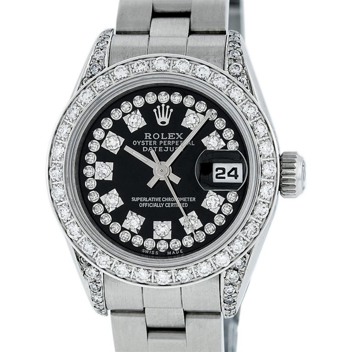 One Quickset Ladies Stainless Steel Rolex Datejust Polished Bright with Satin Finish, Serviced & Electronically Tested, Stainless Steel Case: 26mm, Stainless Steel Crown, Custom Diamond Lugs: 24 Diamonds On Lugs, Clarity: SI-VS, Color: G to H. Custom Bezel: New 18K White Gold Beadset Diamond Bezel, Stone Count: 32 Diamonds On Bezel, Total Bezel Weight .70 Carat, Clarity: SI-VS, Color: G to H. Custom Crystal: New Scratch Resistant Synthetic Sapphire Cyclops Lens. Custom Hands: New Luminescent Hands. Movement: Automatic Winding Movement Caliber 2235. Custom Dial: Refinished Single Cut Black String Diamond Dial, 43 Diamonds in Dial G To H In Color, Clarity: VS. Date Window: 3 O'Clock Position Date Display, Model: Quickset Datejust. Condition: G-6 Extra Fine. Bracelet: Stainless Steel Oyster Band. Bright Polish & Satin Finish. 6.0 Inch Length, Adjustable. Standard Clasp, With Rolex Logo. This Watch Has Been Serviced Time Tested And Is In Excellent Condition It Is Free Of All Scratches And Dents.
