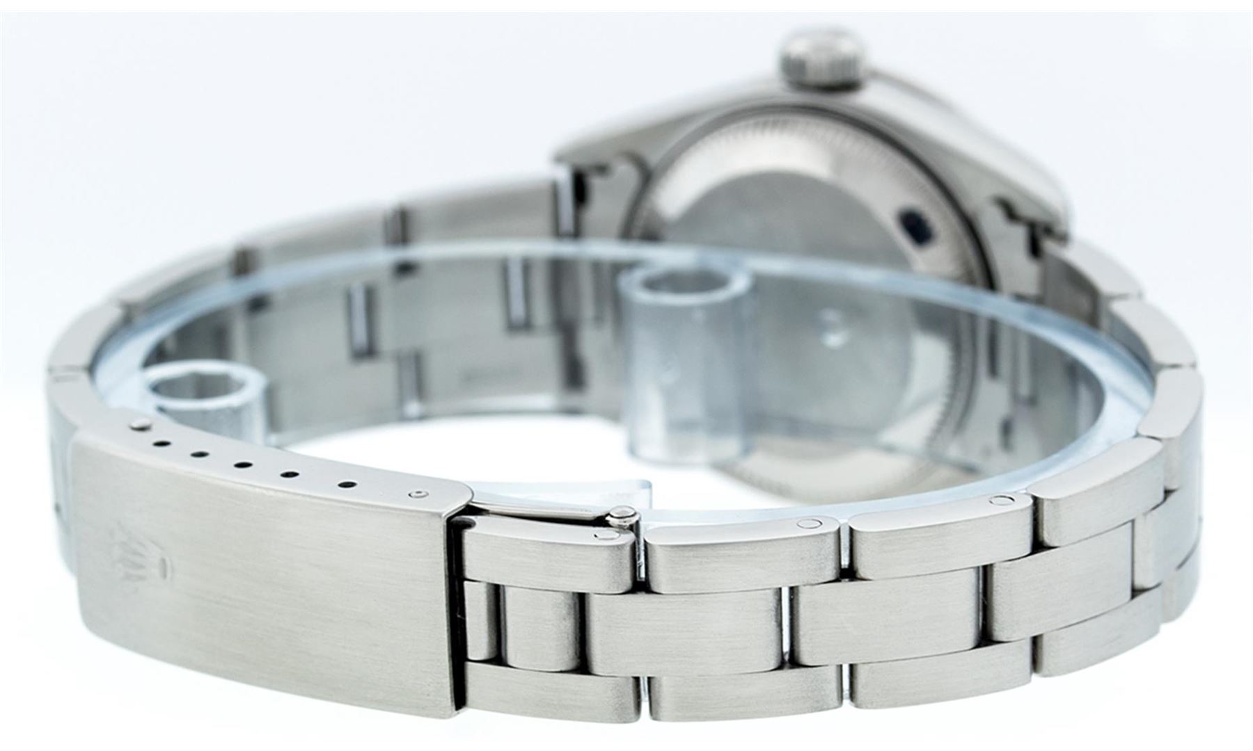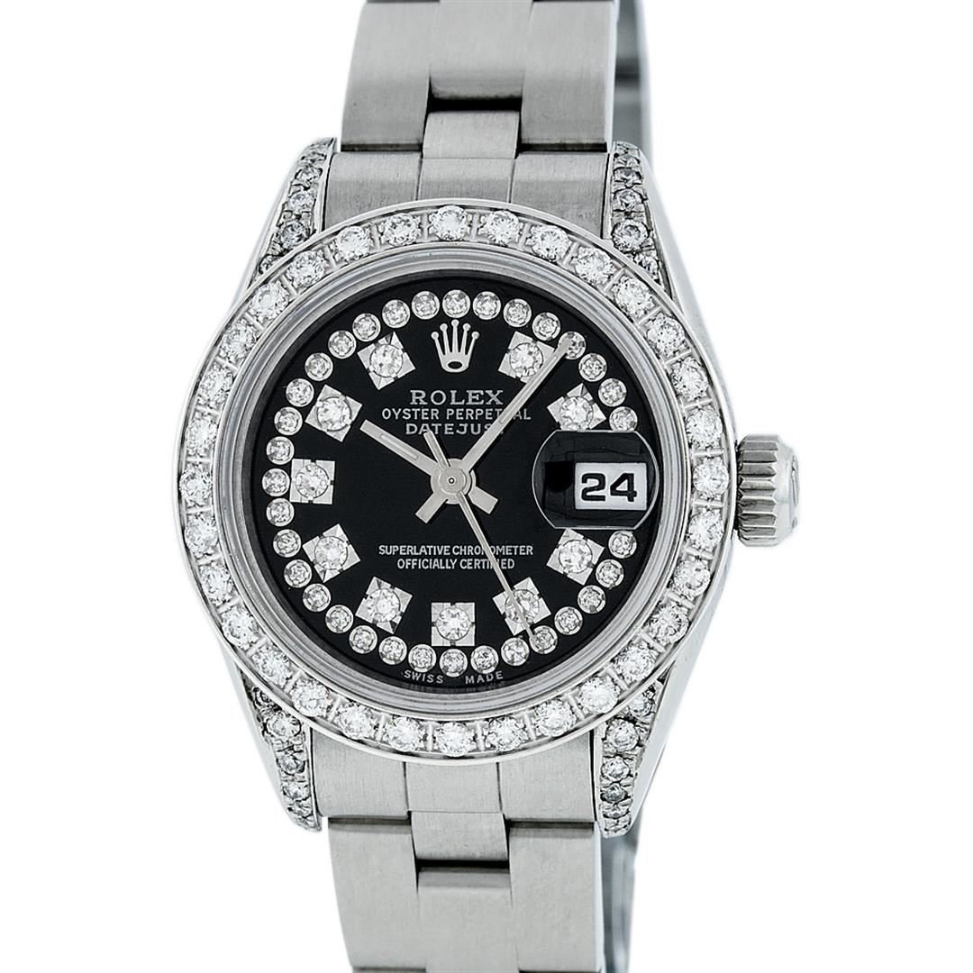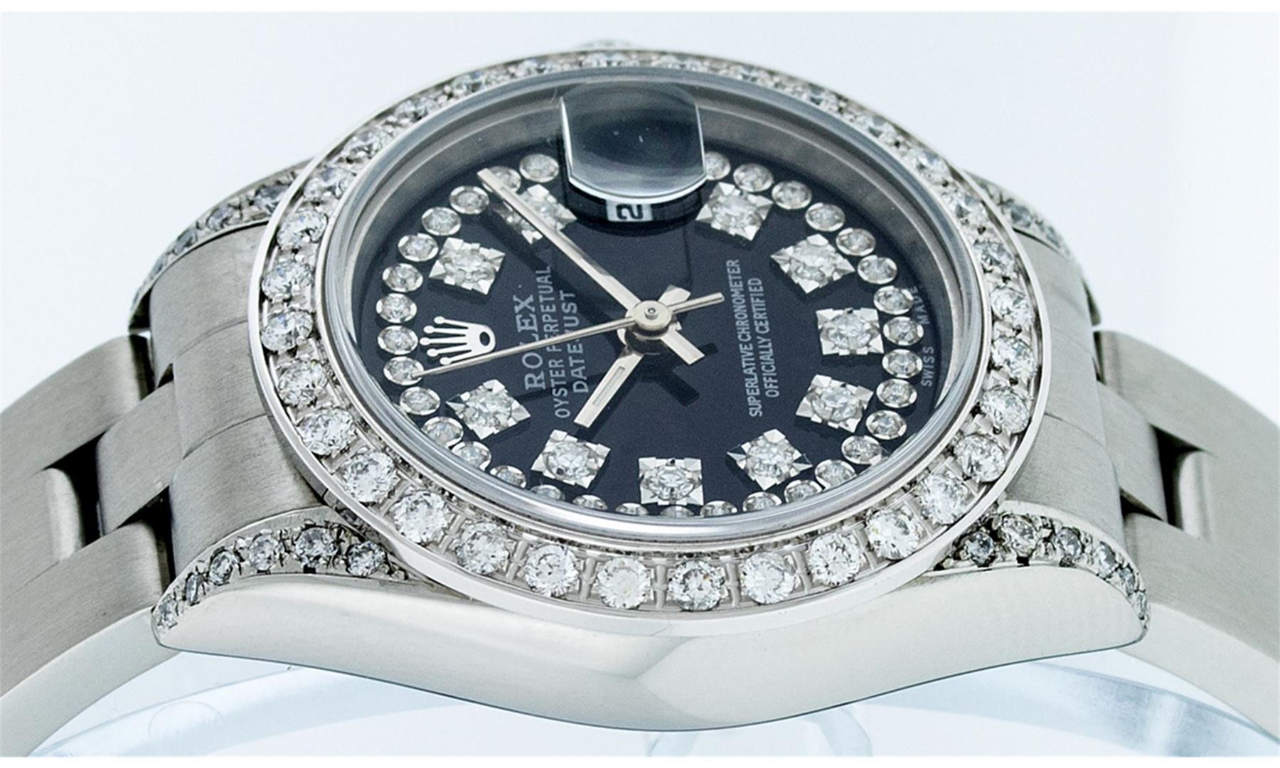 One Quickset Ladies Stainless Steel Rolex Datejust Polished Bright with Satin Finish, Serviced & Electronically Tested, Stainless Steel Case: 26mm, Stainless Steel Crown, Custom Diamond Lugs: 24 Diamonds On Lugs, Clarity: SI-VS, Color: G to H. Custom Bezel: New 18K White Gold Beadset Diamond Bezel, Stone Count: 32 Diamonds On Bezel, Total Bezel Weight .70 Carat, Clarity: SI-VS, Color: G to H. Custom Crystal: New Scratch Resistant Synthetic Sapphire Cyclops Lens. Custom Hands: New Luminescent Hands. Movement: Automatic Winding Movement. Custom Dial: Refinished Single Cut Black String Diamond Dial, 43 Diamonds in Dial G To H In Color, Clarity: VS. Date Window: 3 O'Clock Position Date Display, Model: Quickset Datejust Caliber 2230. Condition: G-6 Extra Fine. Bracelet: Stainless Steel Oyster Band. Bright Polish & Satin Finish. 6.0 Inch Length, Adjustable. Standard Clasp, With Rolex Logo. This Watch Has Been Serviced Time Tested And Is In Excellent Condition It Is Free Of All Scratches And Dents.