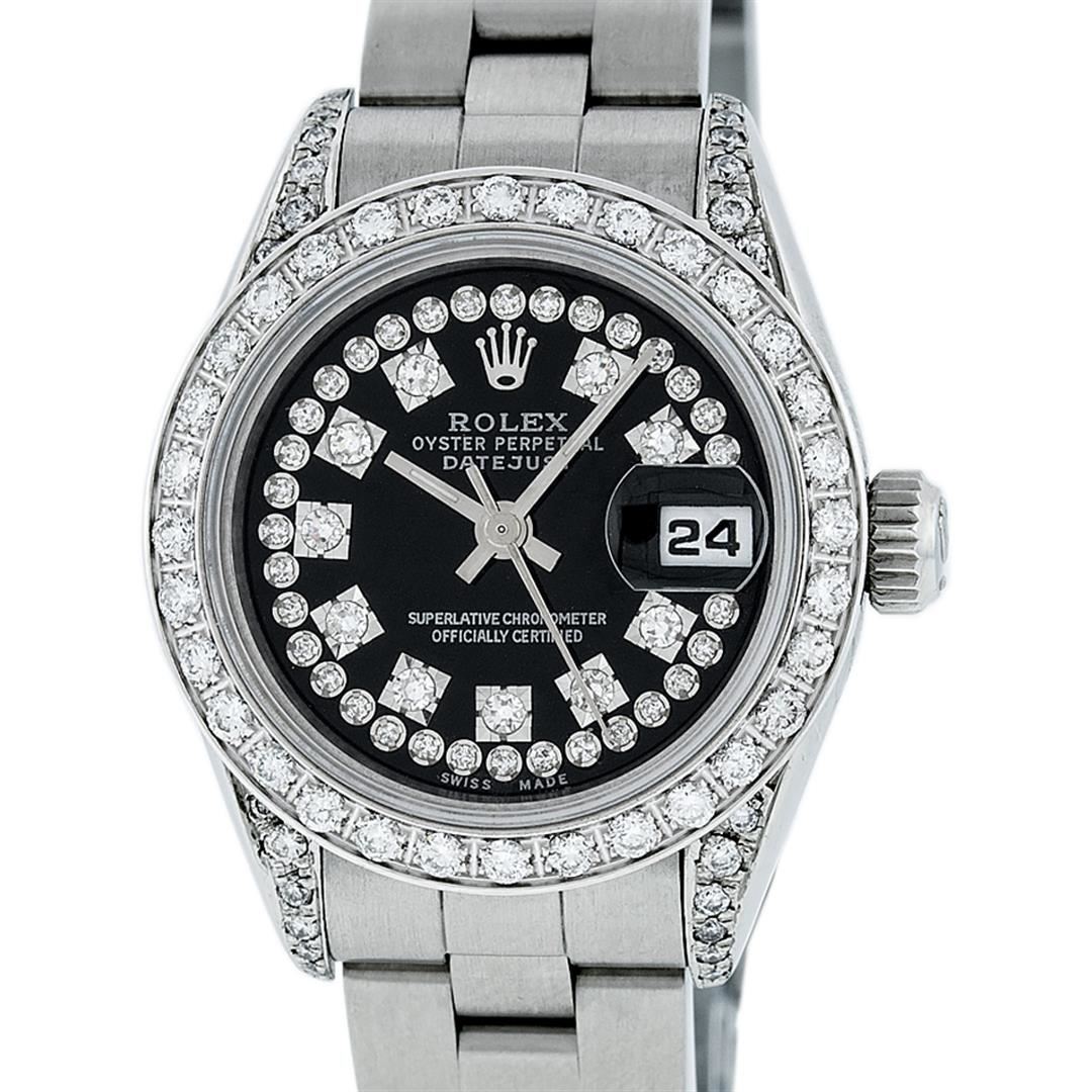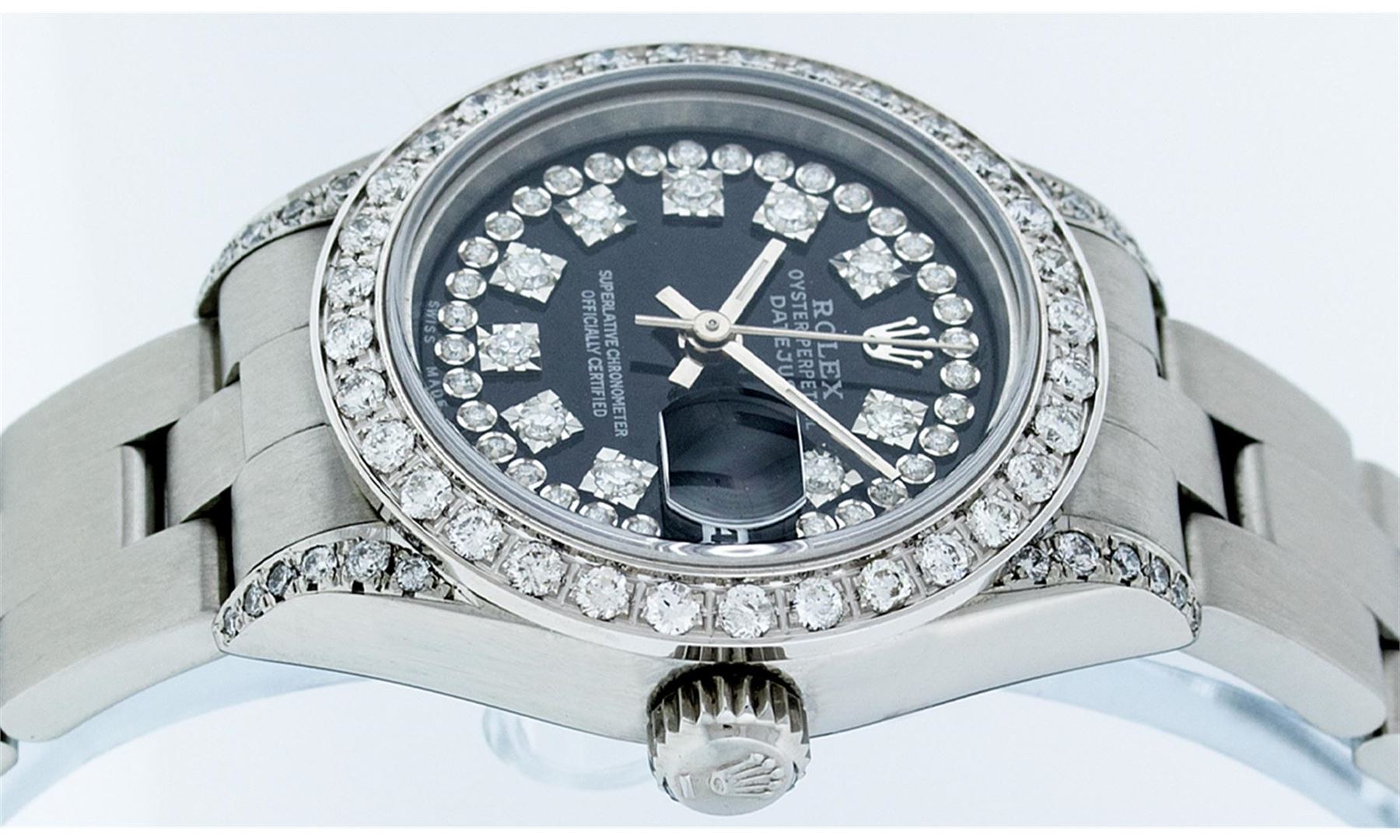 One Quickset Ladies Stainless Steel Rolex Datejust Polished Bright with Satin Finish, Serviced & Electronically Tested, Stainless Steel Case: 26mm, Stainless Steel Crown, Custom Diamond Lugs: 24 Diamonds On Lugs, Clarity: SI-VS, Color: G to H. Custom Bezel: New 18K White Gold Beadset Diamond Bezel, Stone Count: 32 Diamonds On Bezel, Total Bezel Weight .70 Carat, Clarity: SI-VS, Color: G to H. Custom Crystal: New Scratch Resistant Synthetic Sapphire Cyclops Lens. Custom Hands: New Luminescent Hands. Movement: Automatic Winding Movement. Custom Dial: Refinished Single Cut Black String Diamond Dial, 43 Diamonds in Dial G To H In Color, Clarity: VS. Date Window: 3 O'Clock Position Date Display, Model: Quickset Datejust Caliber 2230. Condition: G-6 Extra Fine. Bracelet: Stainless Steel Oyster Band. Bright Polish & Satin Finish. 6.0 Inch Length, Adjustable. Standard Clasp, With Rolex Logo. This Watch Has Been Serviced Time Tested And Is In Excellent Condition It Is Free Of All Scratches And Dents.