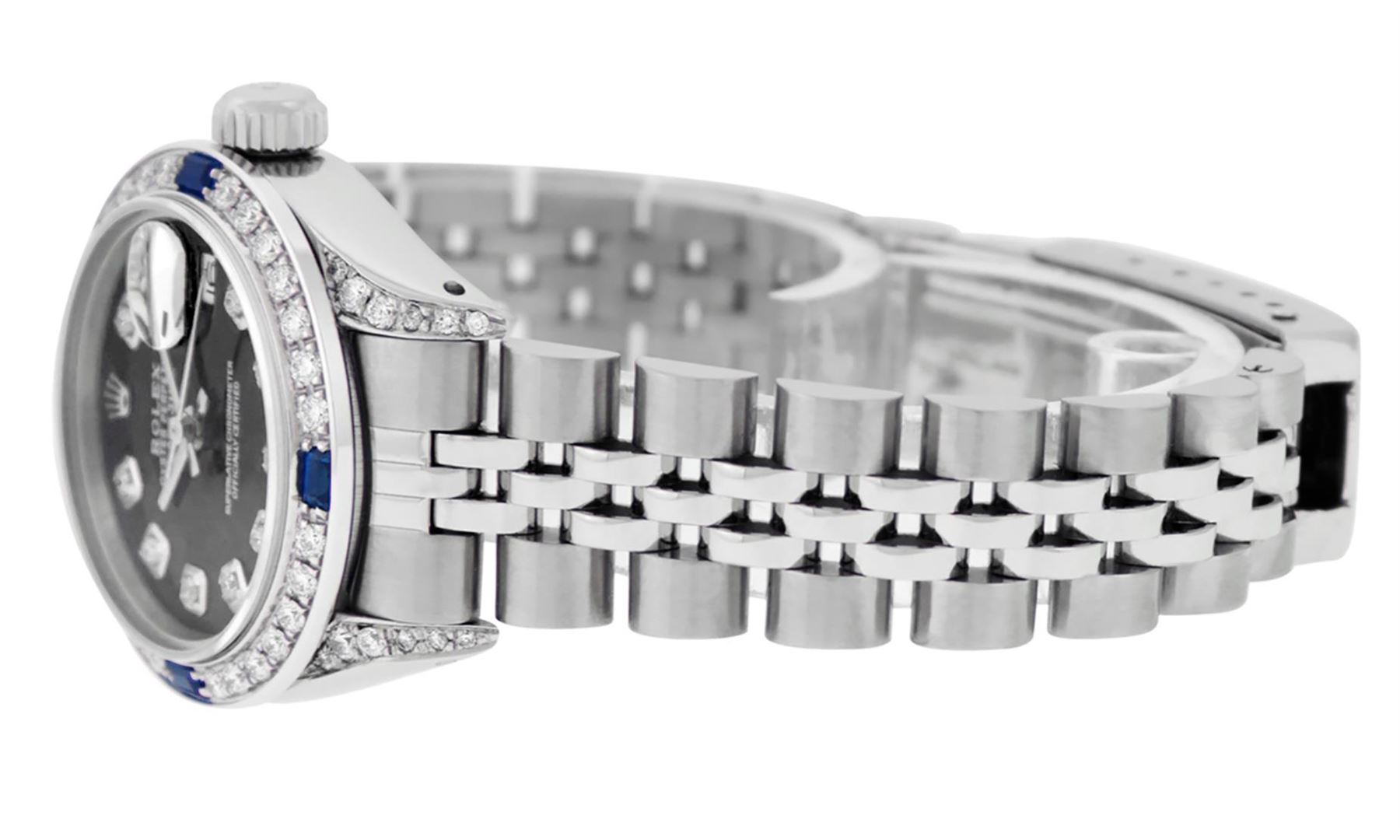 One Ladies Stainless Steel Rolex Datejust Polished Bright with Satin Finish, Serviced & Electronically Tested, Stainless Steel Case: 26mm, Stainless Steel Crown, Diamond Lugs: 24 Diamonds On Lugs, Clarity: SI-VS, Color: G to H. Custom Bezel: New 18K White Gold Diamond & Sapphire Beadset Bezel, Diamond Count: 28 Diamonds + 4 Sapphires, Total Weight .70 Carats, Clarity: SI-VS, Color: G to H. Custom Crystal: New Scratch Resistant Synthetic Sapphire Cyclops Lens. Custom Hands: New Luminescent Hands. Movement: Automatic Winding Movement. Custom Dial: Refinished Black Diamond Dial, 10 Diamonds in Dial, G To H In Color, Clarity: SI-VS. Date Window: 3 O'Clock Position Date Display, Model: Datejust Condition: G-6 Extra Fine. Bracelet: Stainless Steel Jubilee Band. Bright Polish & Satin Finish. 6.0 Inch Length, Adjustable. Standard Clasp, With Rolex Logo. This Watch Has Been Serviced Time Tested And Is In Excellent Condition It Is Free Of All Scratches And Dents.