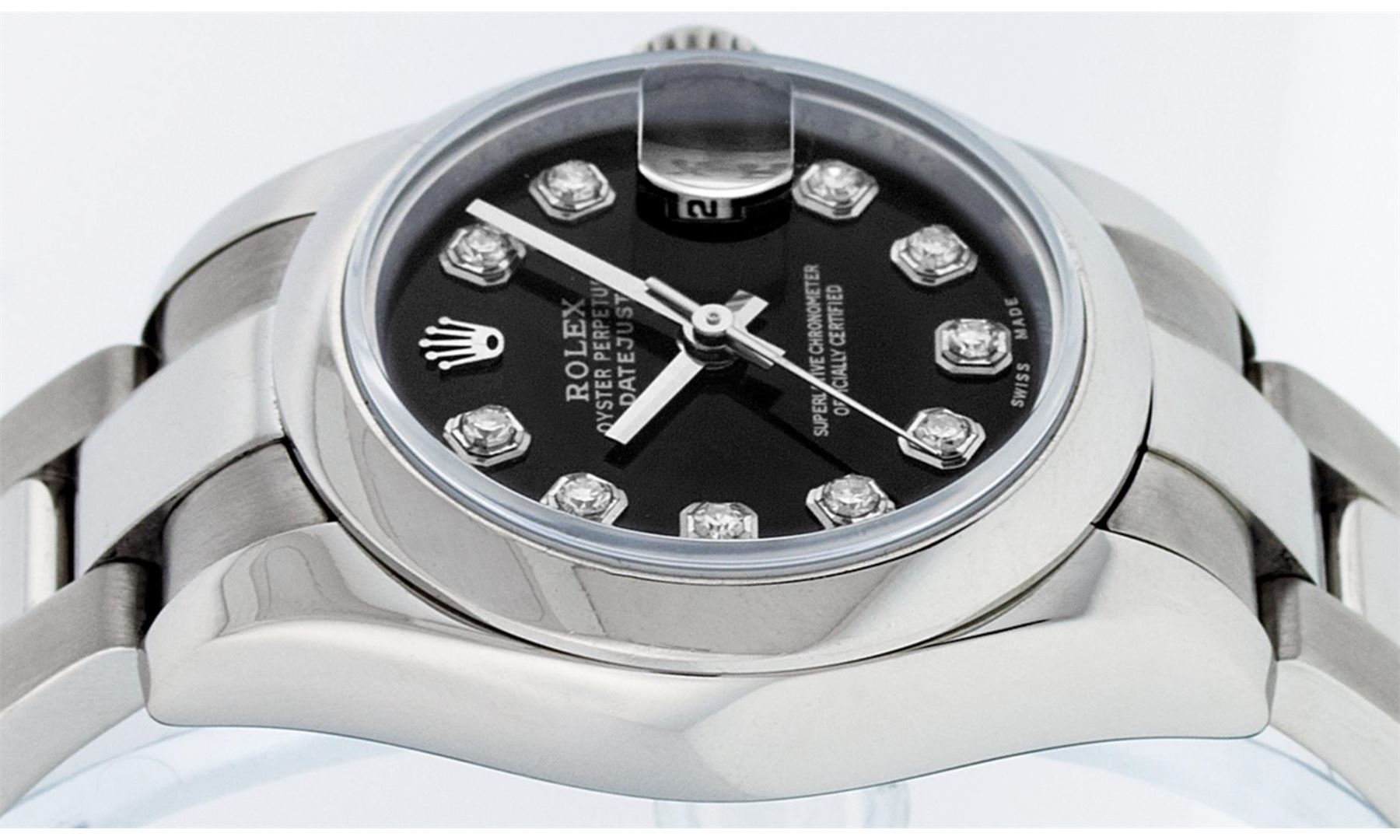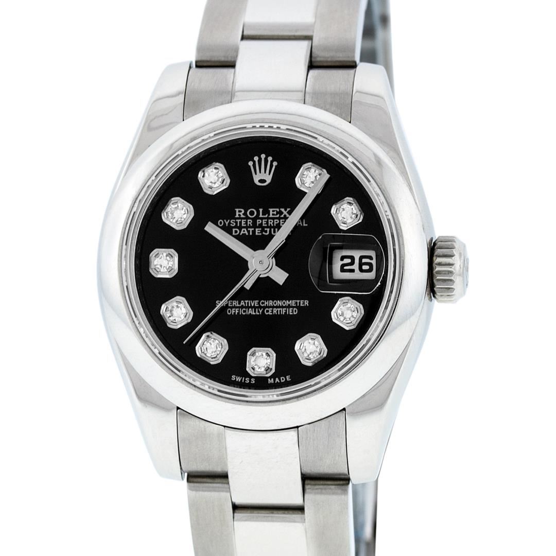 One Ladies Pre Owned Quickset Stainless Steel Rolex Datejust Polished Bright with Satin Finish, Serviced And Electronically Tested, Rolex Stainless Steel Case: 26mm, Rolex Stainless Steel Crown, Rolex Bezel: Stainless Steel Smooth Bezel. Crystal: Sapphire With Magnified Date Window. Hands: Luminescent Hands. Rolex Movement: Automatic Winding 2235 Rolex Movement. Custom Dial: Custom Black Dial With Added Diamonds, Diamond Count: 10 Diamonds On Dial. Date Window: 3 O'Clock Position Date Display, Model: Caliber 2235 Quickset Datejust. Condition: G-6 Extra Fine. Rolex Bracelet: Stainless Steel Oyster Band. Bright Polish And Satin Finish. 6.0 Inch Length, Adjustable. Standard Clasp, With Rolex Logo. This Watch Has Been Serviced Time Tested And Is In Excellent Condition It Is Free Of All Scratches And Dents.