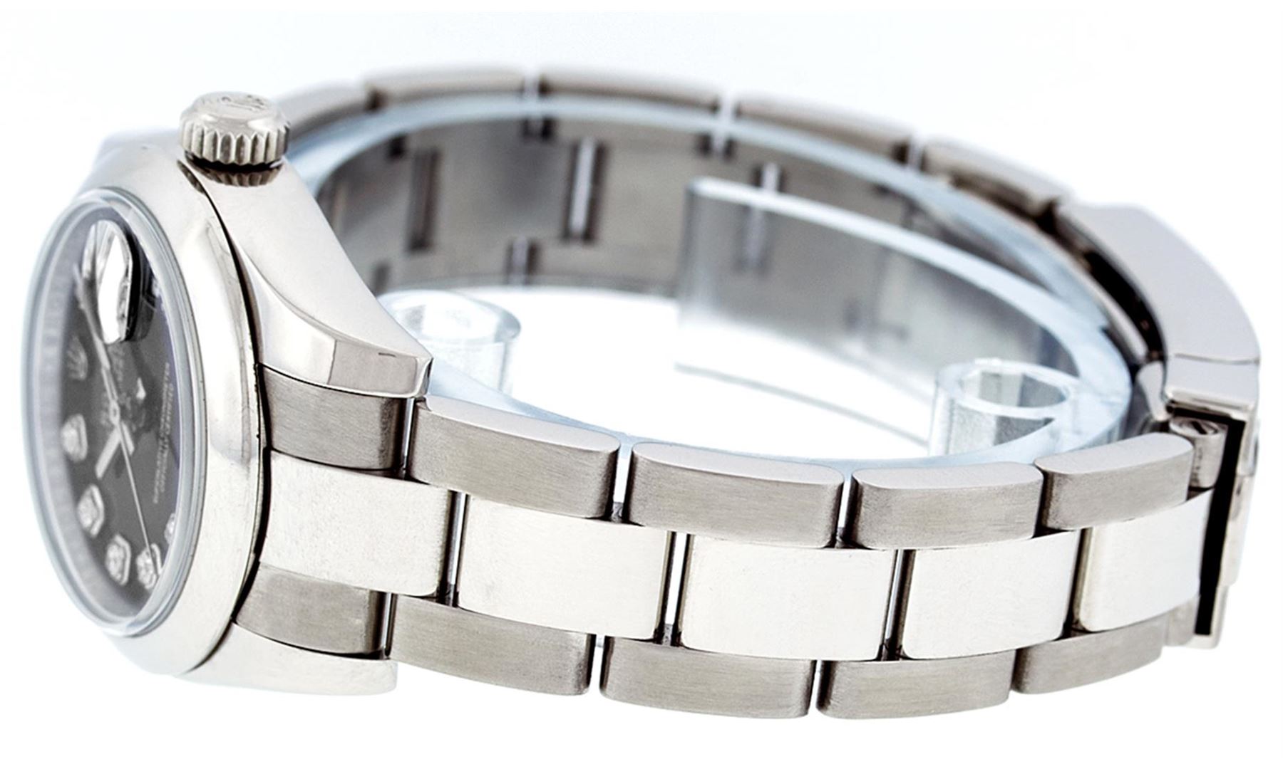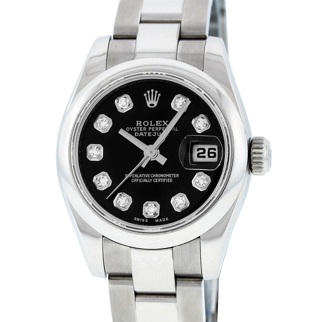 One Ladies Quickset Stainless Steel Rolex Datejust Polished Bright with Satin Finish, Serviced & Electronically Tested, Stainless Steel Case: 26mm, Stainless Steel Crown, Bezel: Stainless Steel Smooth Bezel. Custom Crystal: New Scratch Resistant Sapphire Cyclops Lens. Custom Hands: New Luminescent Hands. Movement: Automatic Winding Movement. Custom Dial: Black Single Cut VS Diamond Dial, Diamond Count: 10 Single Cut Diamonds In Dial, Color: G to H, Clarity: VS. Date Window: 3 O'Clock Position Date Display, Model: Caliber 2230 Quickset Datejust. Condition: G-6 Extra Fine. Bracelet: Stainless Steel Oyster Band. Bright Polish & Satin Finish. 6.0 Inch Length, Adjustable. Standard Clasp, With Rolex Logo. This Watch Has Been Serviced Time Tested And Is In Excellent Condition It Is Free Of All Scratches And Dents.