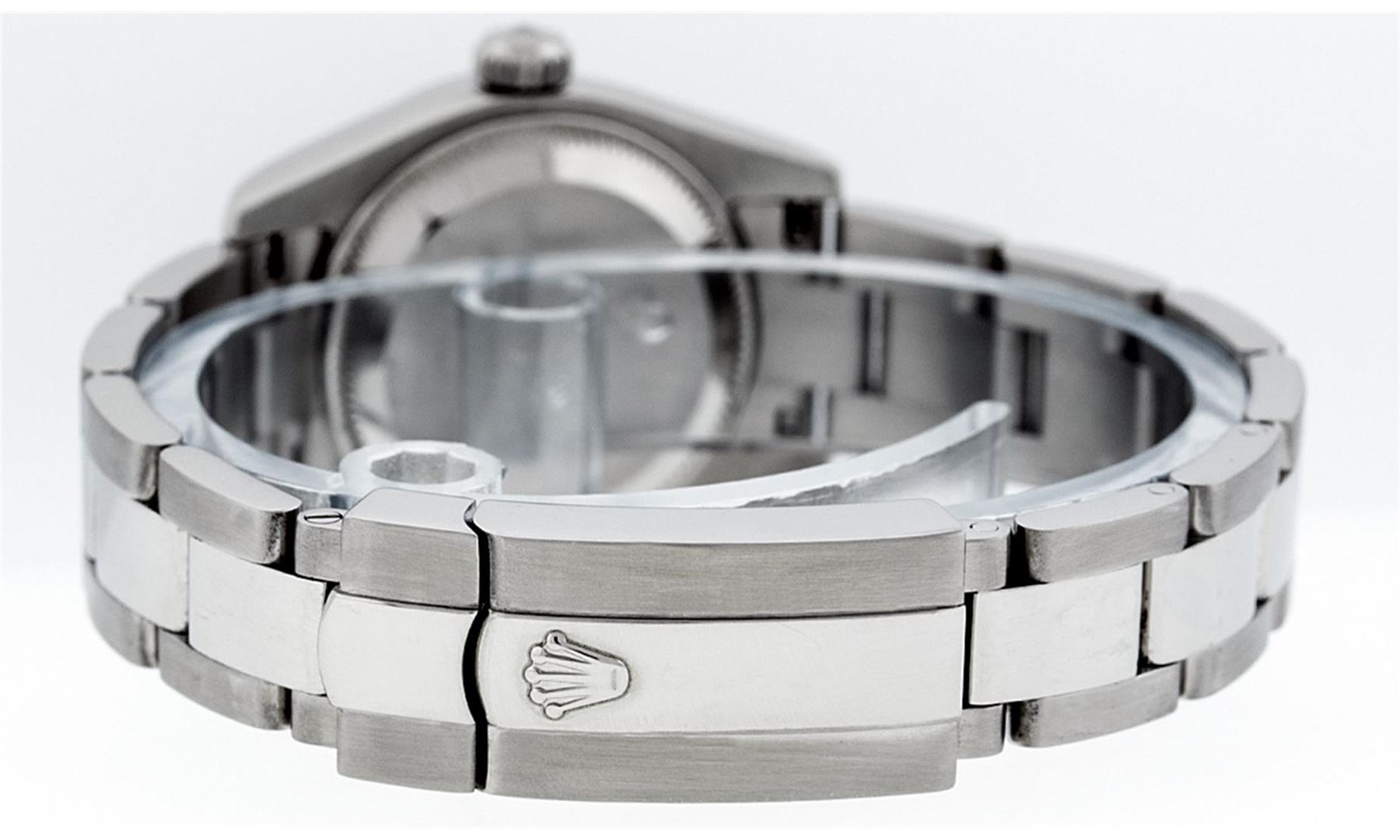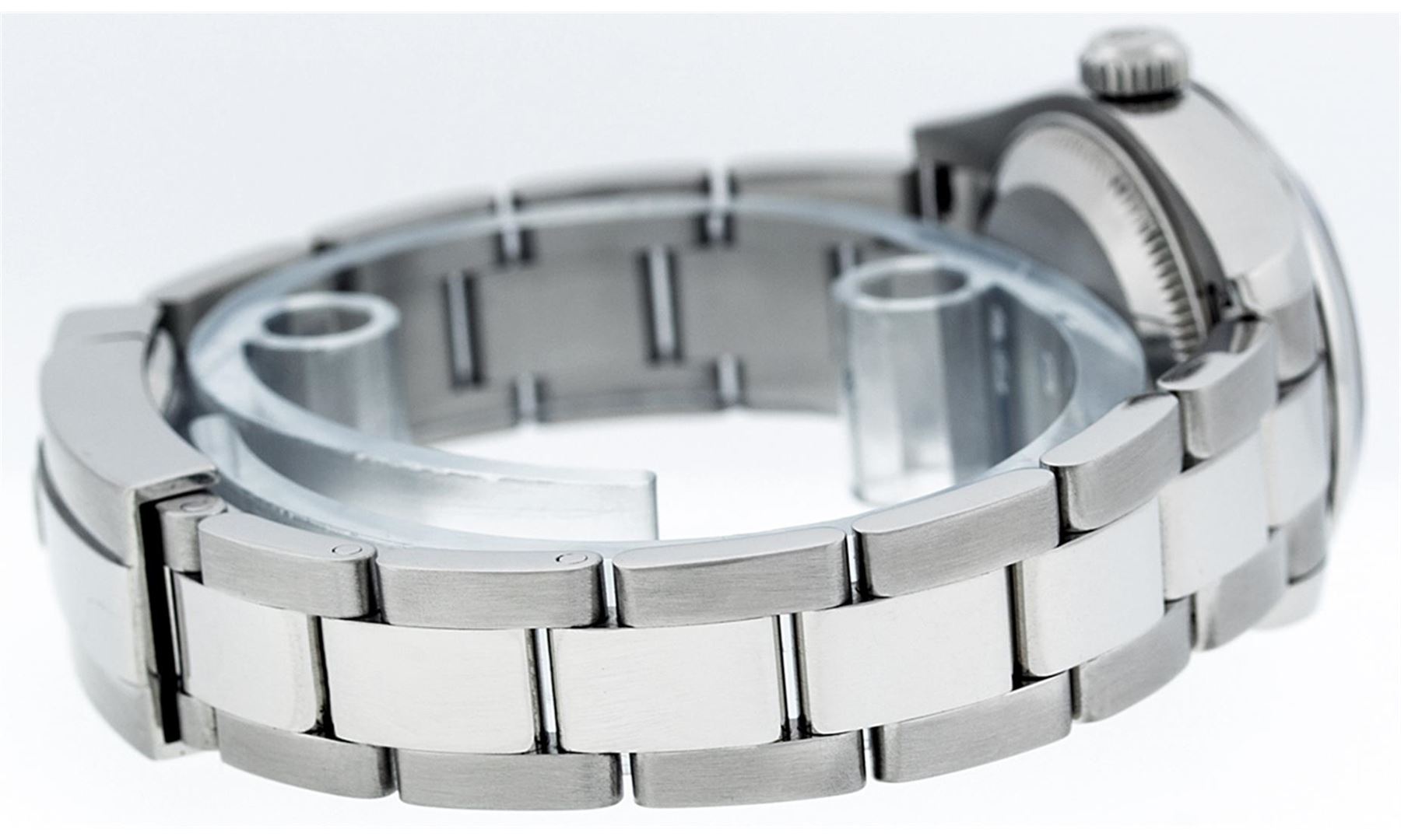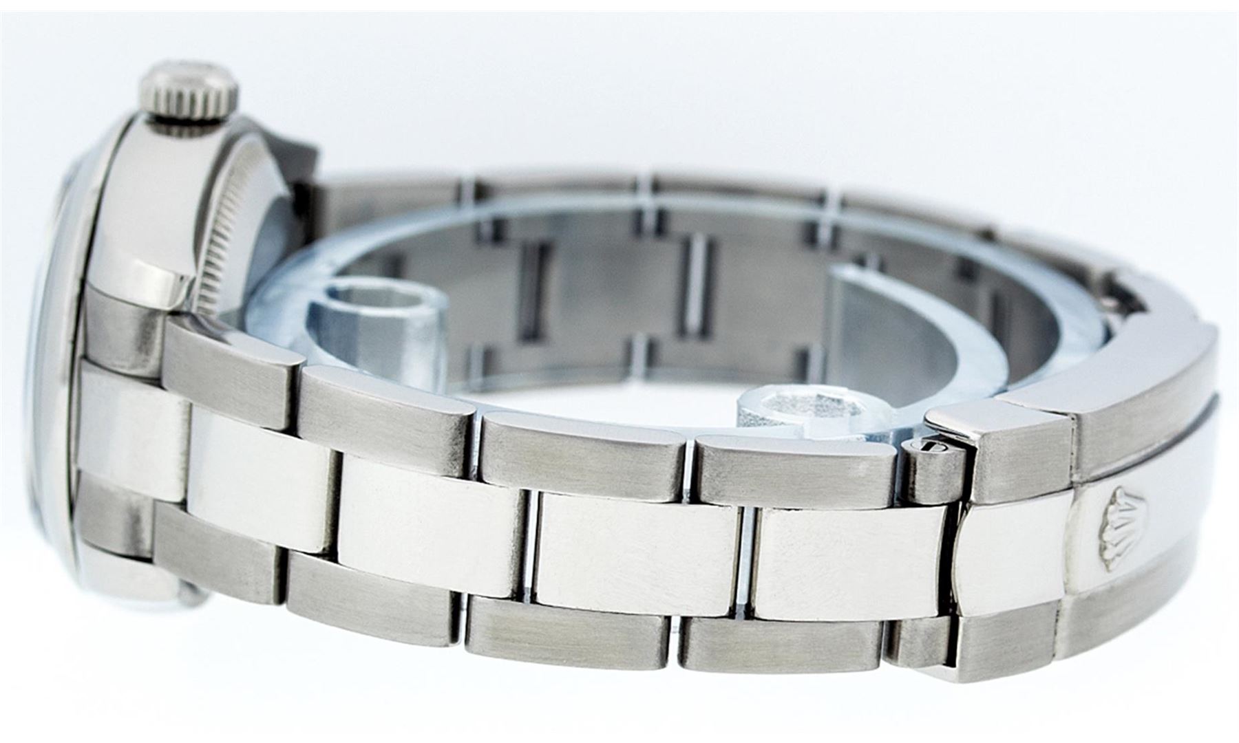 One Ladies Quickset Stainless Steel Rolex Datejust Polished Bright with Satin Finish, Serviced & Electronically Tested, Stainless Steel Case: 26mm, Stainless Steel Crown, Bezel: Stainless Steel Smooth Bezel. Custom Crystal: New Scratch Resistant Sapphire Cyclops Lens. Custom Hands: New Luminescent Hands. Movement: Automatic Winding Movement. Custom Dial: Black Single Cut VS Diamond Dial, Diamond Count: 10 Single Cut Diamonds In Dial, Color: G to H, Clarity: VS. Date Window: 3 O'Clock Position Date Display, Model: Caliber 2230 Quickset Datejust. Condition: G-6 Extra Fine. Bracelet: Stainless Steel Oyster Band. Bright Polish & Satin Finish. 6.0 Inch Length, Adjustable. Standard Clasp, With Rolex Logo. This Watch Has Been Serviced Time Tested And Is In Excellent Condition It Is Free Of All Scratches And Dents.