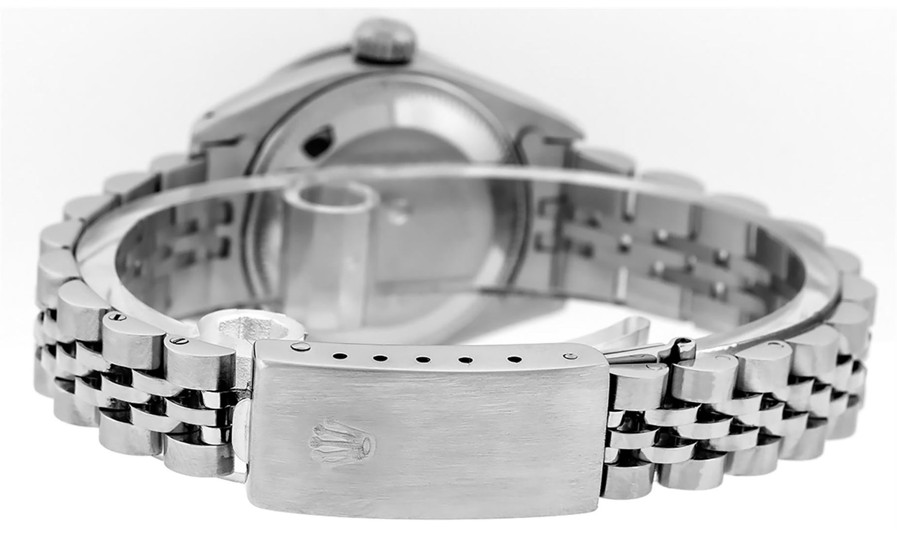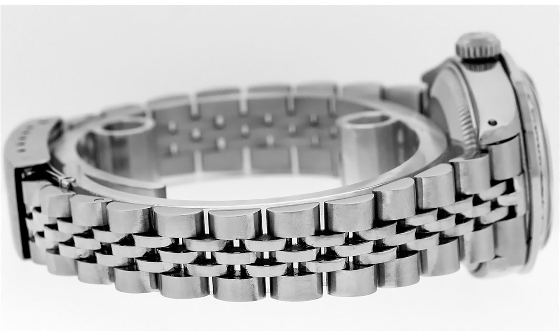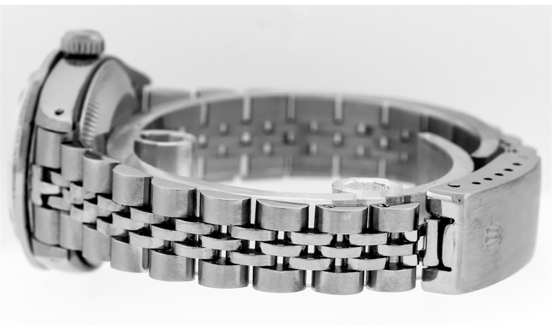 One Ladies Stainless Steel Rolex Datejust Polished Bright with Satin Finish, Serviced & Electronically Tested, Stainless Steel Case: 26mm, Stainless Steel Crown, Custom Bezel: New 18K White Gold Sapphire Beadset Diamond Bezel, Diamond + Gem Count: 28 Diamonds + 4 Sapphires. Total Weight .70 Carat, Clarity: SI-VS, Color: G to H. Custom Crystal: New Scratch Resistant Synthetic Sapphire Cyclops Lens. Custom Hands: New Luminescent Hands. Movement: Automatic Winding Movement. Custom Dial: Refinished Black With Diamond Hour Markers, Diamond Count: 10 Diamond in Dial, G To H In Color, Clarity: SI-VS. Date Window: 3 O'Clock Position Date Display, Model: Datejust. Condition: G-6 Extra Fine. Bracelet: Stainless Steel Jubilee. Bright Polish & Satin Finish. 6.0 Inch Length, Adjustable. Standard Clasp, With Rolex Logo. This Watch Has Been Serviced Time Tested And Is In Excellent Condition It Is Free Of All Scratches And Dents.