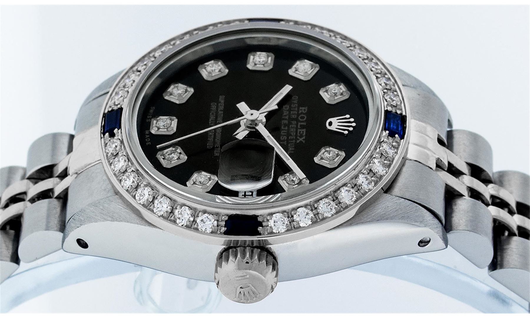 One Ladies Stainless Steel Rolex Datejust Polished Bright with Satin Finish, Serviced & Electronically Tested, Stainless Steel Case: 26mm, Stainless Steel Crown, Custom Bezel: New 18K White Gold Sapphire Beadset Diamond Bezel, Diamond + Gem Count: 28 Diamonds + 4 Sapphires. Total Weight .70 Carat, Clarity: SI-VS, Color: G to H. Custom Crystal: New Synthetic Sapphire Cyclops Lens. Custom Hands: New Luminescent Hands. Movement: Automatic Winding Movement. Custom Dial: Refinished Black With Diamond Hour Markers, Diamond Count: 10 Diamond in Dial, G To H In Color, Clarity: SI-VS. Date Window: 3 O'Clock Position Date Display, Model: Datejust. Condition: G-6 Extra Fine. Bracelet: Stainless Steel Jubilee. Bright Polish & Satin Finish. 6.0 Inch Length, Adjustable. Standard Clasp, With Rolex Logo. This Watch Has Been Serviced Time Tested And Is In Excellent Condition It Is Free Of All Scratches And Dents.