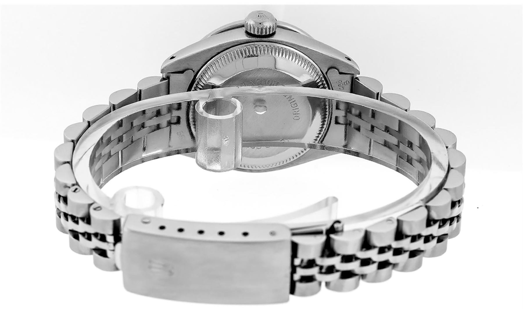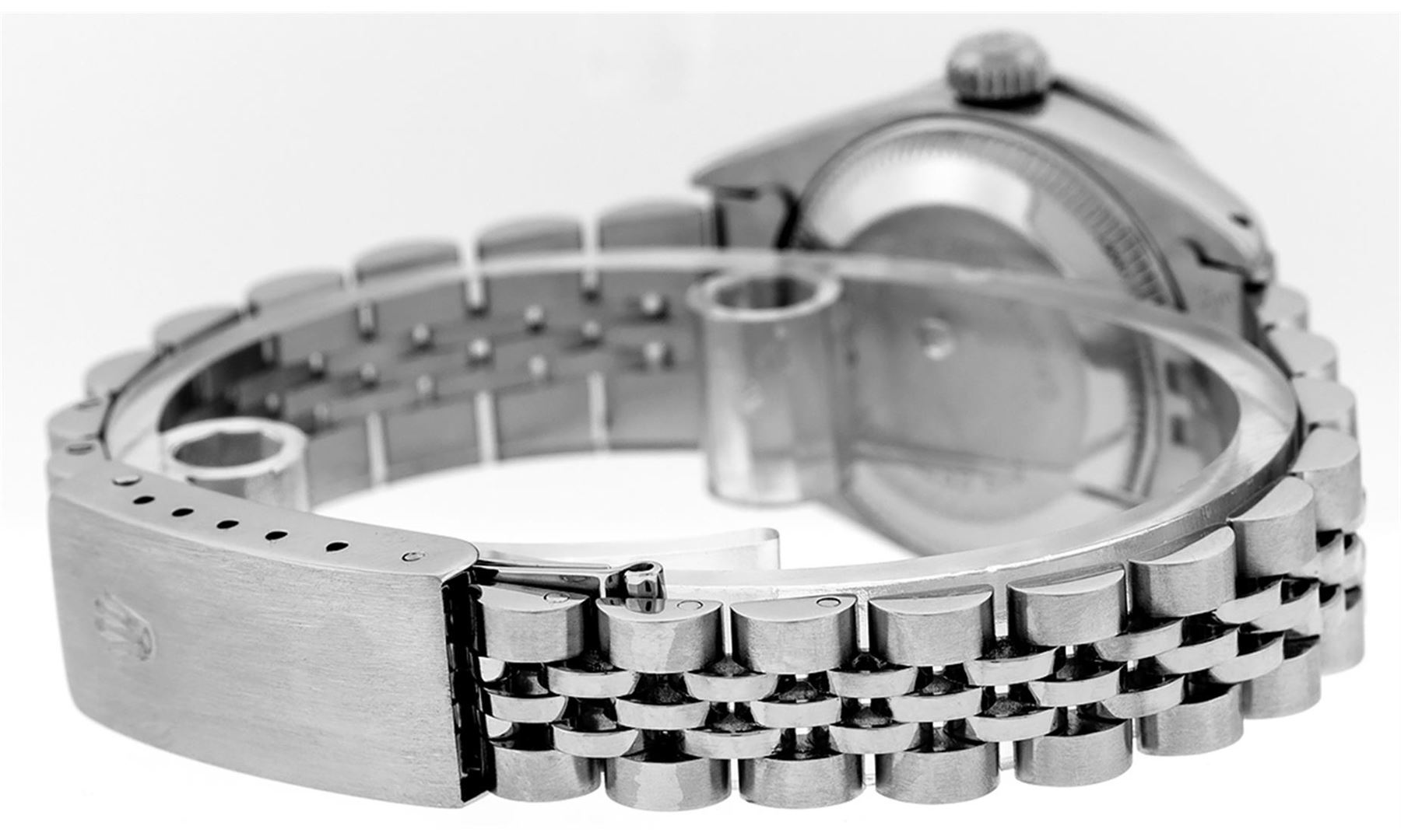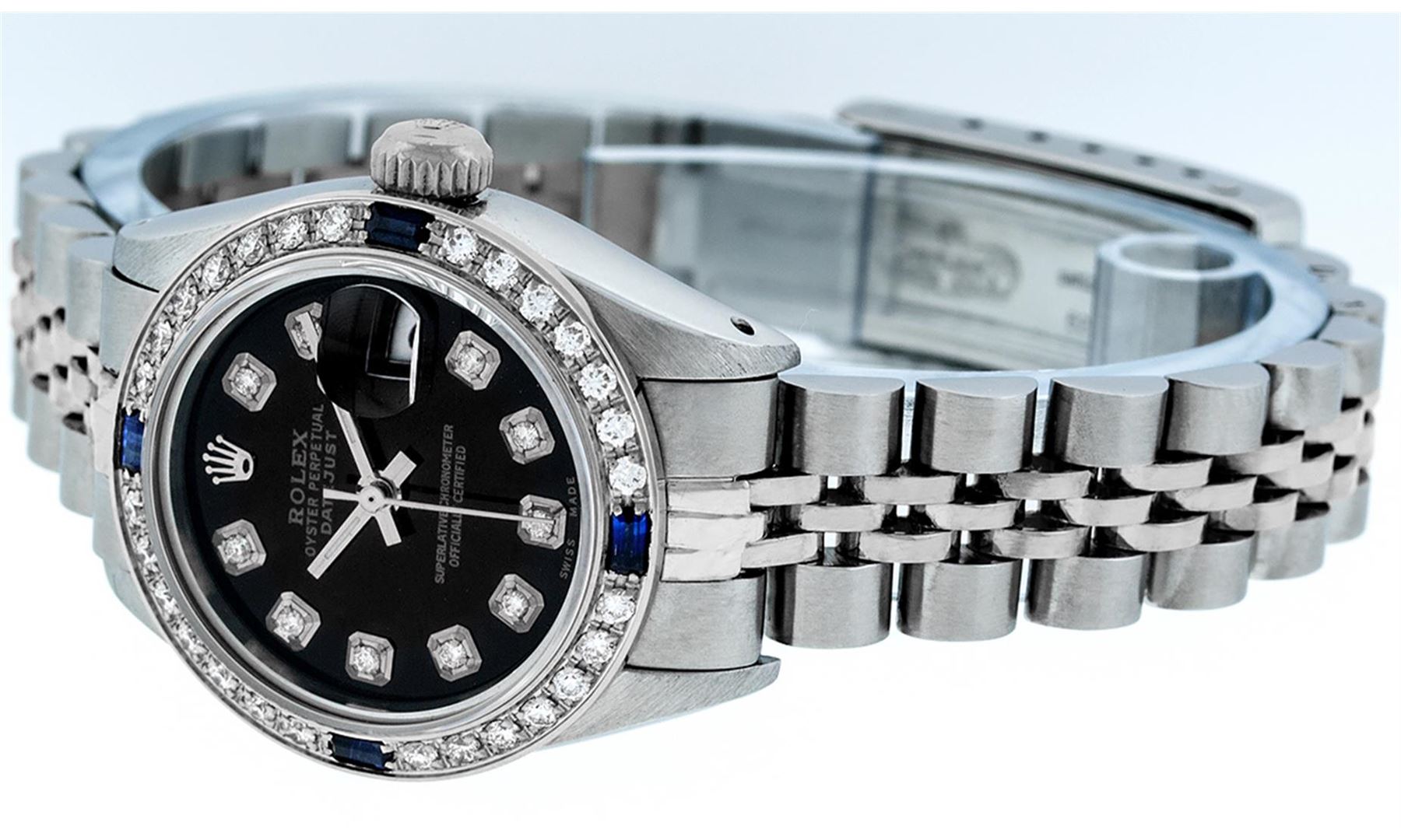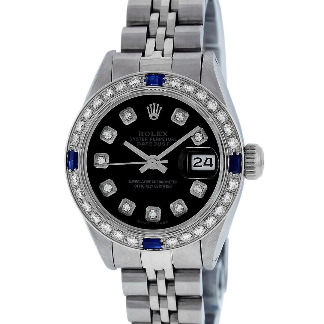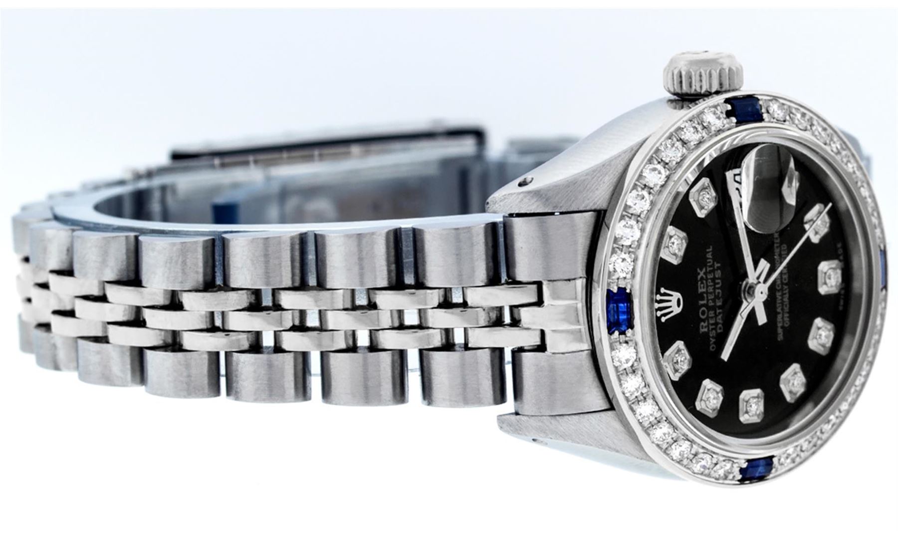 One Ladies Stainless Steel Rolex Datejust Polished Bright with Satin Finish, Serviced & Electronically Tested, Stainless Steel Case: 26mm, Stainless Steel Crown, Custom Bezel: New 18K White Gold Sapphire Beadset Diamond Bezel, Diamond + Gem Count: 28 Diamonds + 4 Sapphires. Total Weight .70 Carat, Clarity: SI-VS, Color: G to H. Custom Crystal: New Synthetic Sapphire Cyclops Lens. Custom Hands: New Luminescent Hands. Movement: Automatic Winding Movement. Custom Dial: Refinished Black With Diamond Hour Markers, Diamond Count: 10 Diamond in Dial, G To H In Color, Clarity: SI-VS. Date Window: 3 O'Clock Position Date Display, Model: Datejust. Condition: G-6 Extra Fine. Bracelet: Stainless Steel Jubilee. Bright Polish & Satin Finish. 6.0 Inch Length, Adjustable. Standard Clasp, With Rolex Logo. This Watch Has Been Serviced Time Tested And Is In Excellent Condition It Is Free Of All Scratches And Dents.