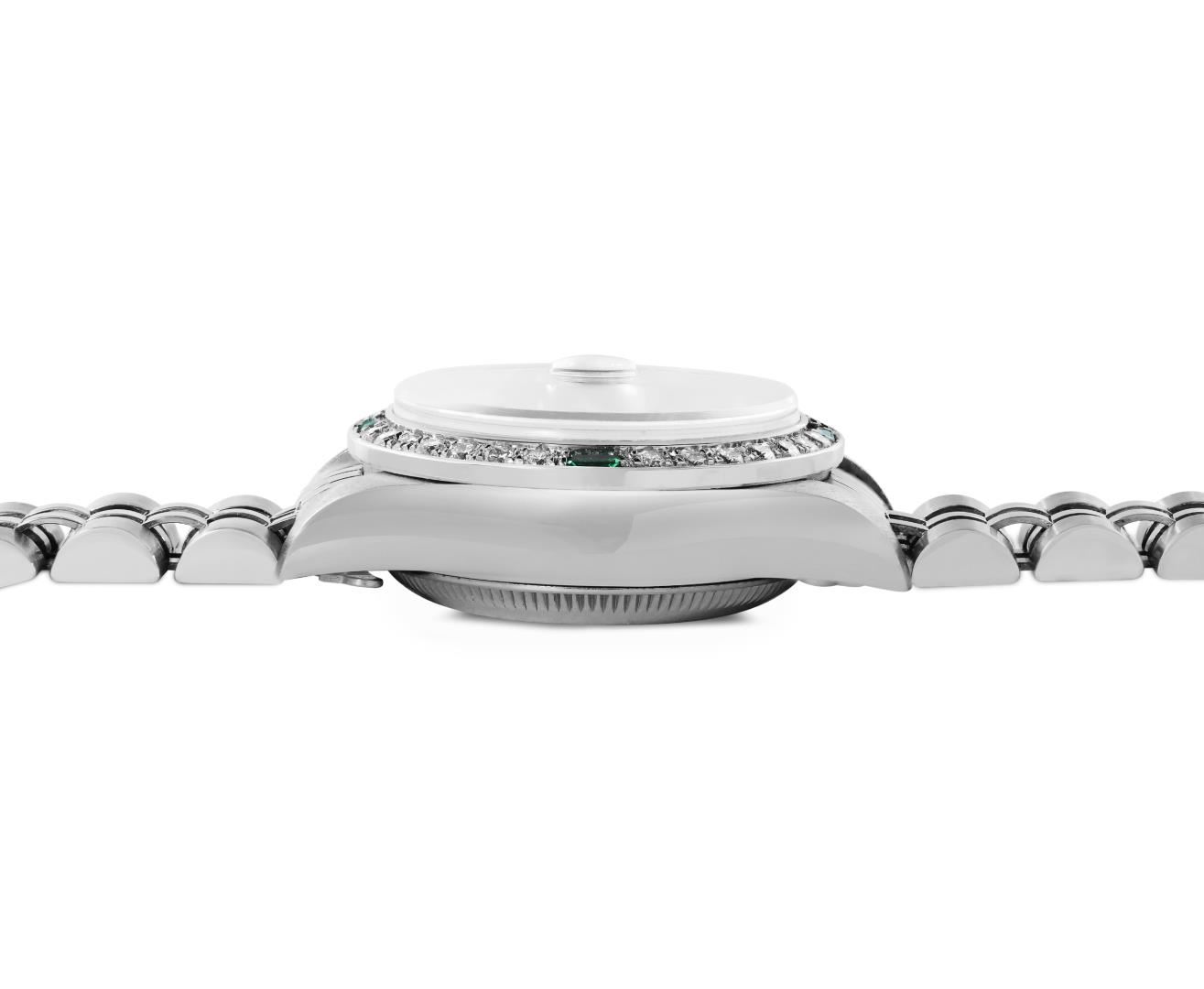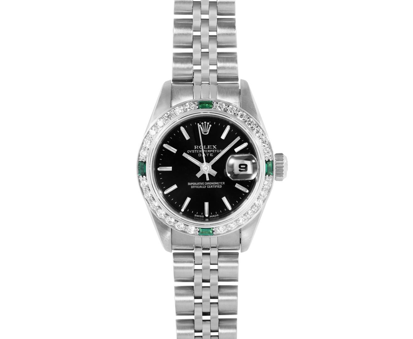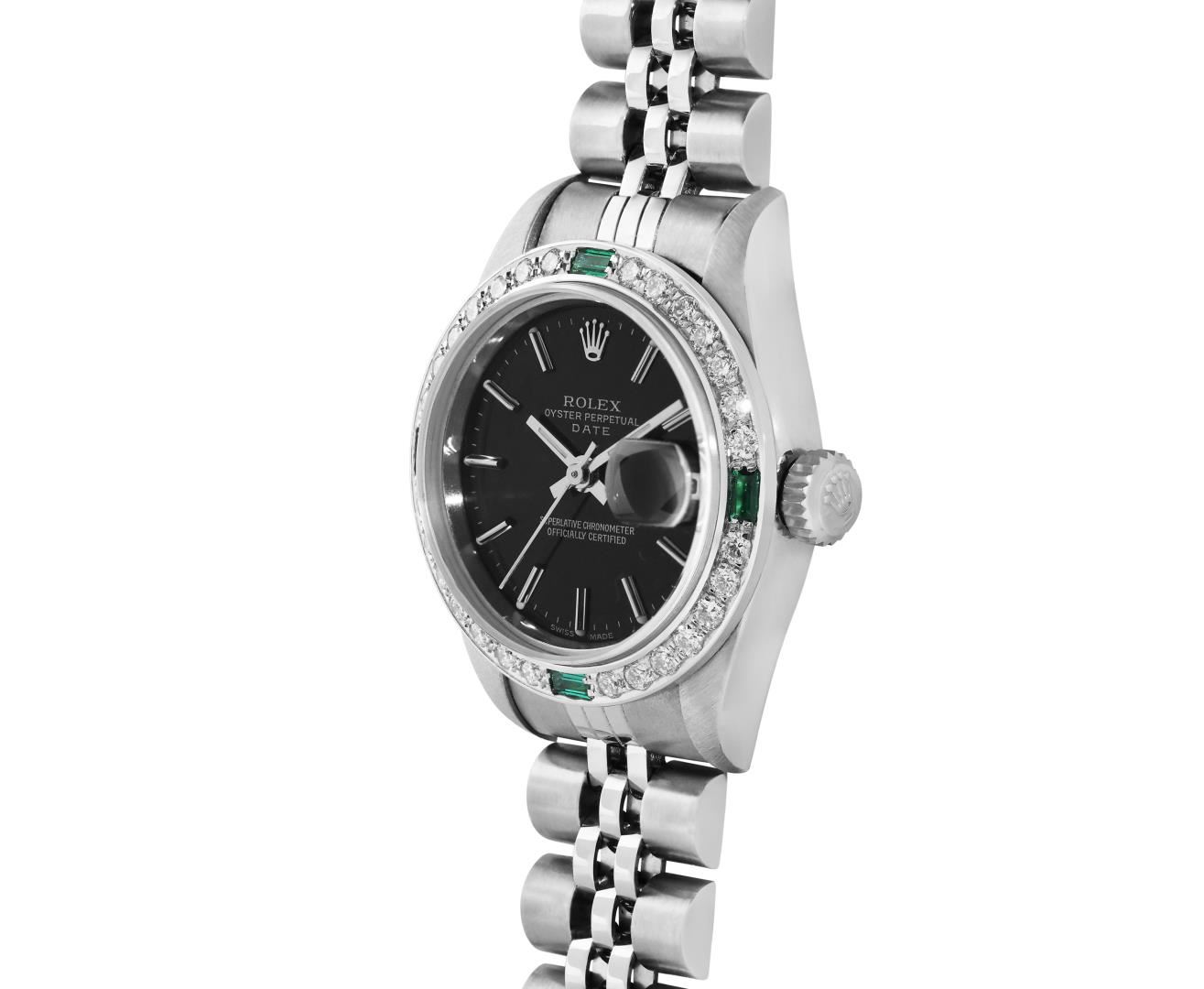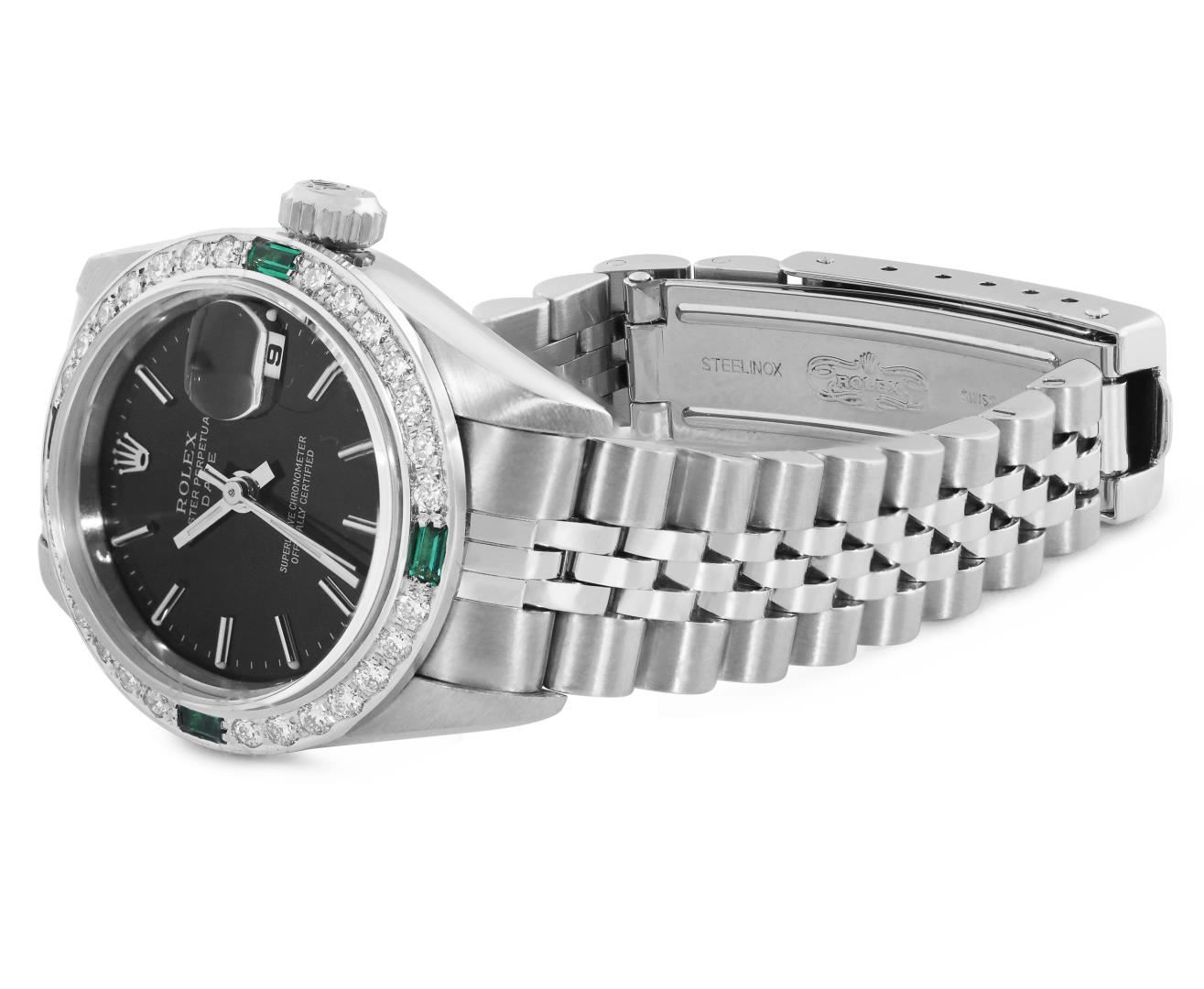 One Rolex Ladies Pre Owned Quickset Stainless Steel Date Wristwatch Polished Bright with Satin Finish, Serviced And Electronically Tested, Stainless Steel Case: 26mm, Stainless Steel Crown, Custom Bezel: New 18K White Gold Emerald Beadset Diamond Bezel, Diamond + Gem Count: 36 Diamonds + 4 Emeralds. Custom Crystal: New Sapphire With Magnified Date Window. Custom Hands: New Luminescent Hands. Rolex Movement: 2235 Automatic Winding Movement. Rolex Dial: Factory Black Dial With Index Hour Markers, and Dash Track. Date Window: 3 O'Clock Position Date Display, Model: Quickset Datejust. Condition: G-6 Extra Fine. Rolex Bracelet: Stainless Steel Jubilee Band. Bright Polish And Satin Finish. 6.0 Inch Length, Adjustable. Standard Clasp, With Rolex Logo. This Watch Has Been Serviced Time Tested And Is In Excellent Condition. It Is Free Of All Scratches And Dents.