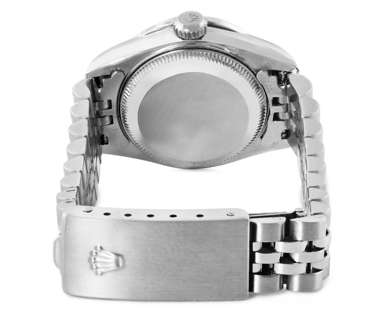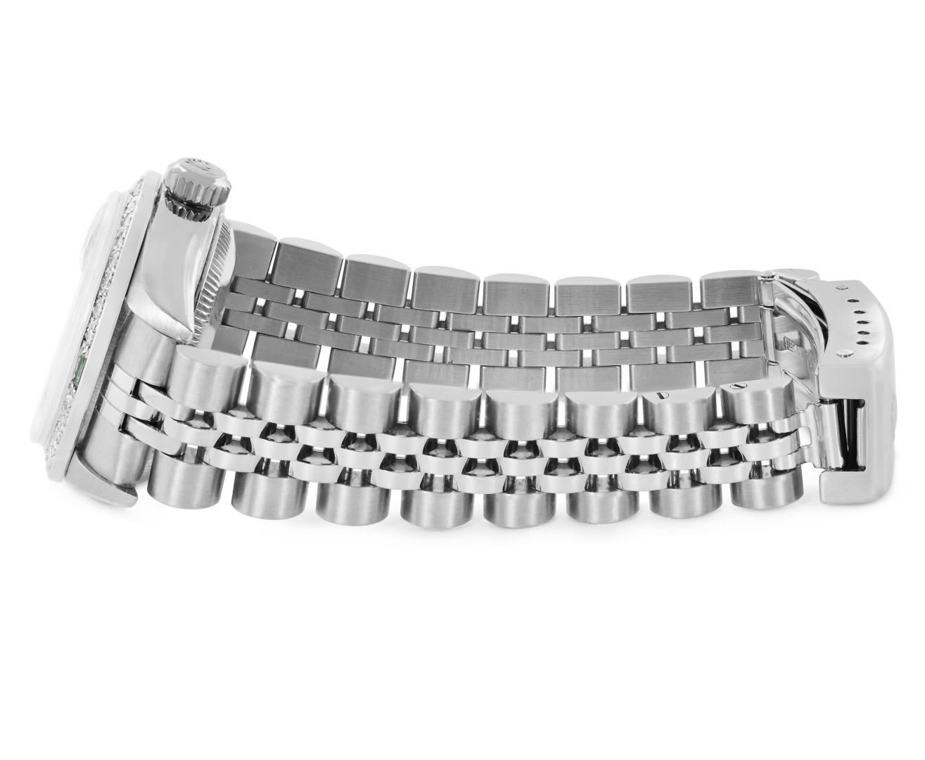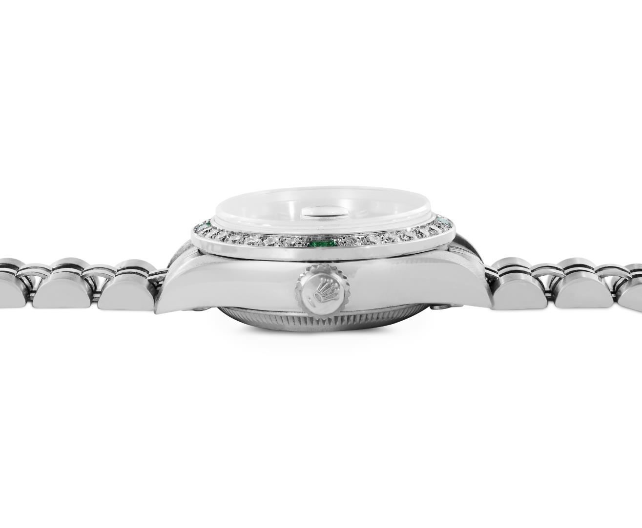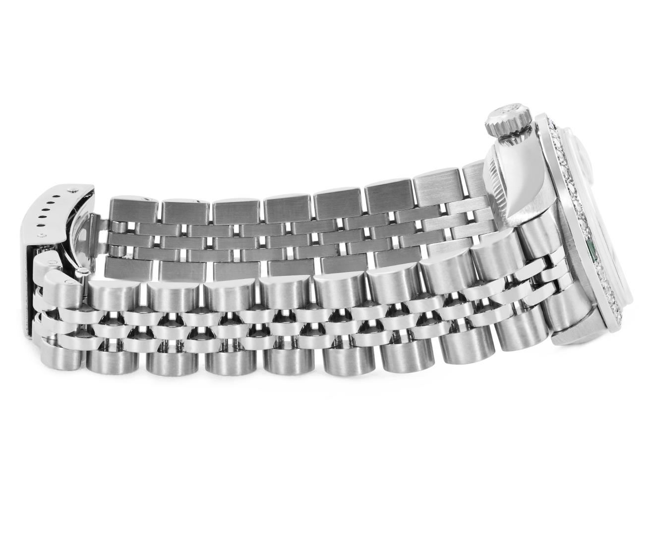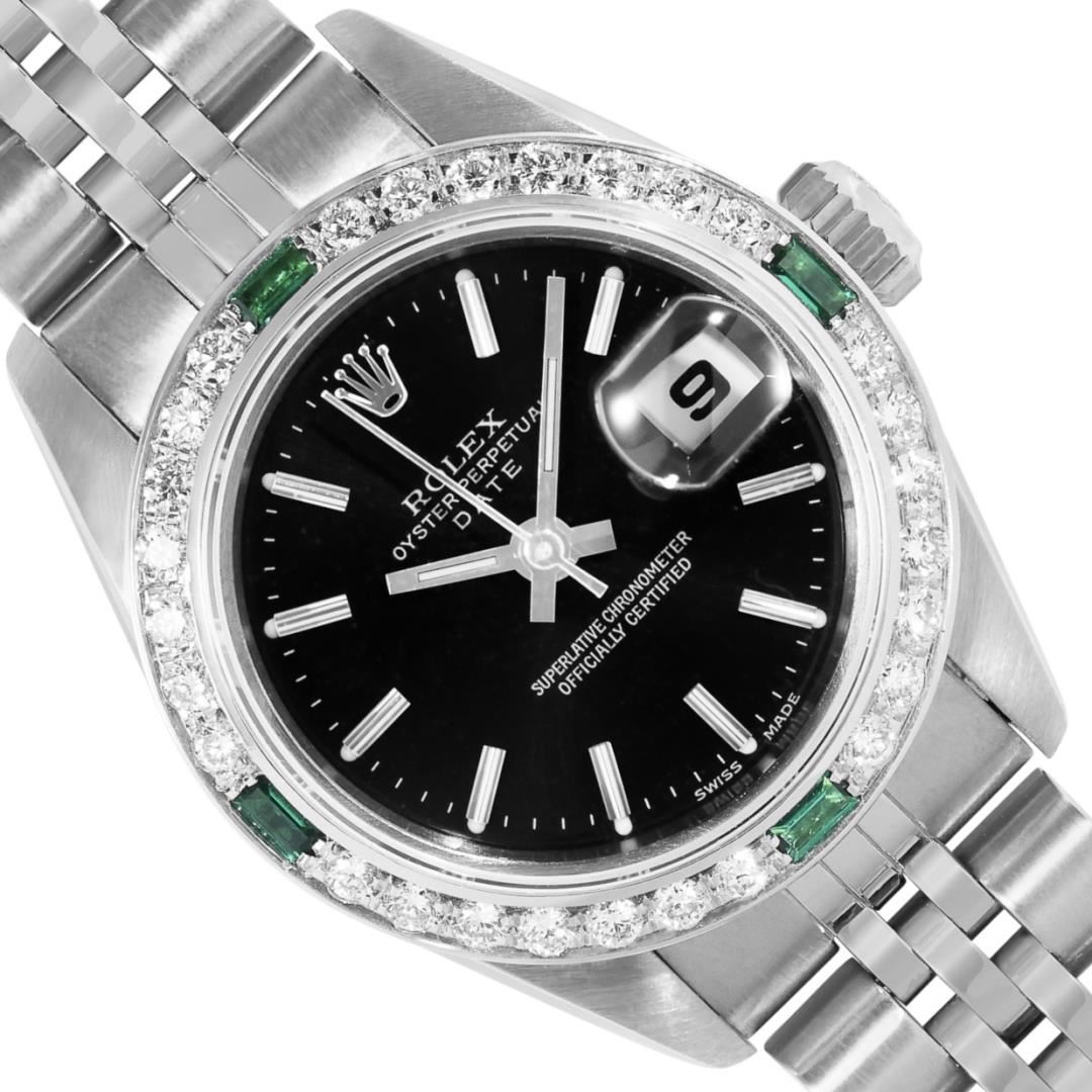 One Rolex Ladies Pre Owned Quickset Stainless Steel Date Wristwatch Polished Bright with Satin Finish, Serviced And Electronically Tested, Stainless Steel Case: 26mm, Stainless Steel Crown, Custom Bezel: New 18K White Gold Emerald Beadset Diamond Bezel, Diamond + Gem Count: 36 Diamonds + 4 Emeralds. Custom Crystal: New Sapphire With Magnified Date Window. Custom Hands: New Luminescent Hands. Rolex Movement: 2235 Automatic Winding Movement. Rolex Dial: Factory Black Dial With Index Hour Markers, and Dash Track. Date Window: 3 O'Clock Position Date Display, Model: Quickset Datejust. Condition: G-6 Extra Fine. Rolex Bracelet: Stainless Steel Jubilee Band. Bright Polish And Satin Finish. 6.0 Inch Length, Adjustable. Standard Clasp, With Rolex Logo. This Watch Has Been Serviced Time Tested And Is In Excellent Condition. It Is Free Of All Scratches And Dents.
