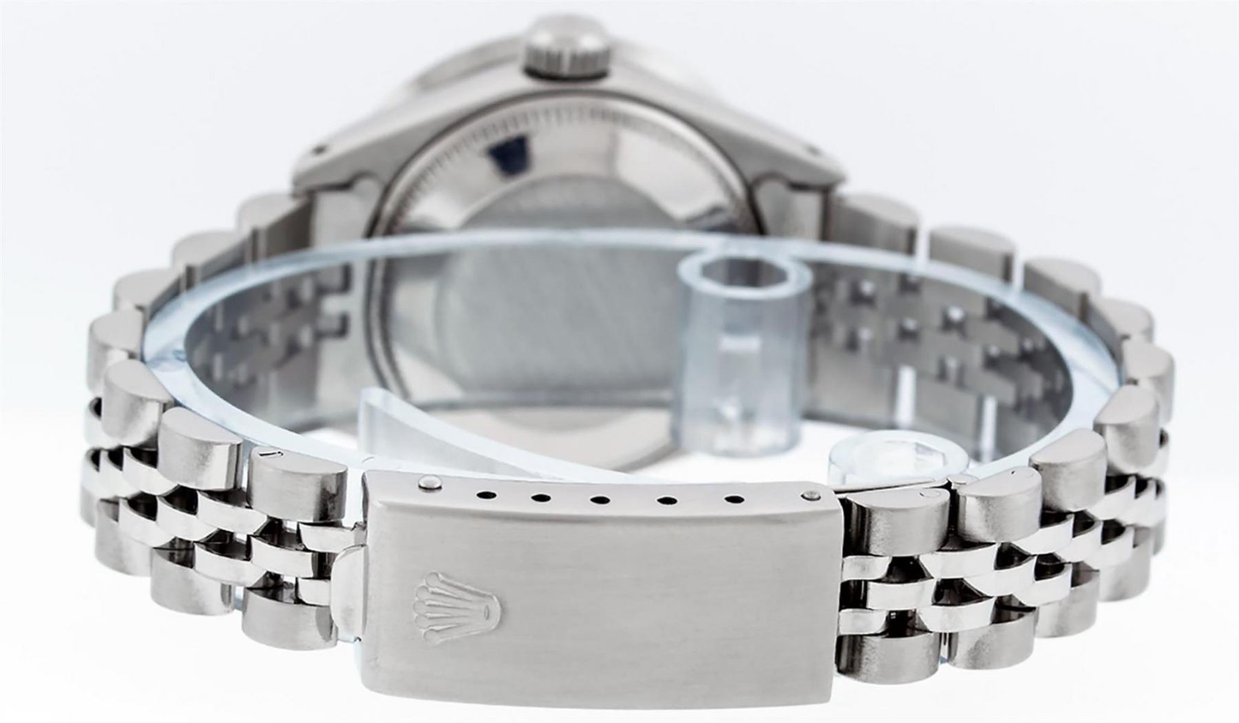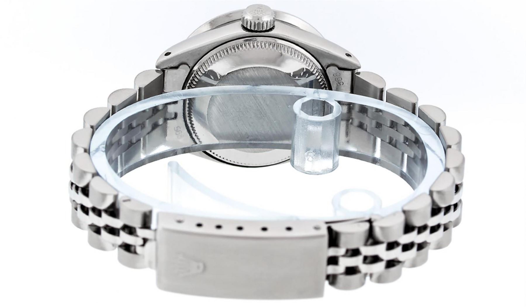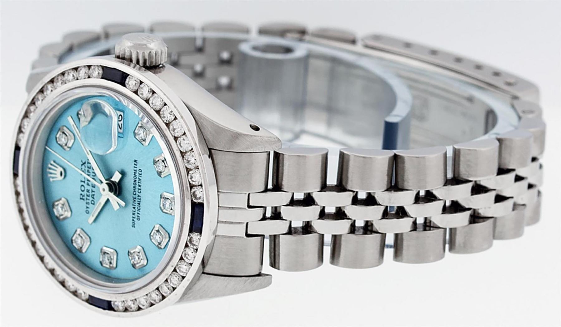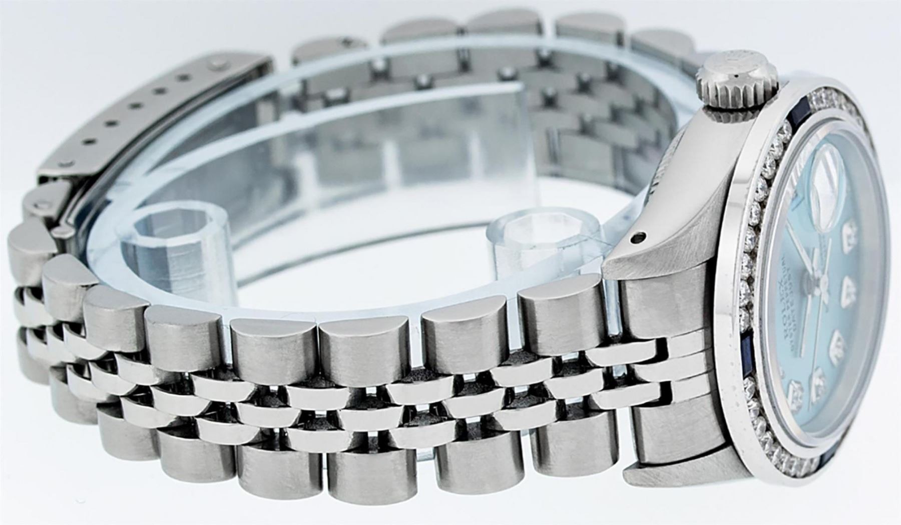 One Ladies Stainless Steel Rolex Datejust Polished Bright with Satin Finish, Serviced & Electronically Tested, Stainless Steel Case: 26mm, Stainless Steel Crown, Custom Bezel: New 18K White Gold Sapphire Channel Set Diamond Bezel, Diamond + Gem Count: 36 Diamonds + 4 Sapphires Total Weight 1.00 Carat, Clarity: SI-VS, Color: G to H. Custom Crystal: New Scratch Resistant Synthetic Sapphire Cyclops Lens. Custom Hands: New Luminescent Hands. Movement: Automatic Winding Movement. Custom Dial: Refinished Ice Blue With Diamond Hour Markers. Date Window: 3 O'Clock Position Date Display, Model: Datejust. Condition: G-6 Extra Fine. Bracelet: Stainless Steel Jubilee. Bright Polish & Satin Finish. 6.0 Inch Length, Adjustable. Standard Clasp, With Rolex Logo. This Watch Has Been Serviced Time Tested And Is In Excellent Condition It Is Free Of All Scratches And Dents.
