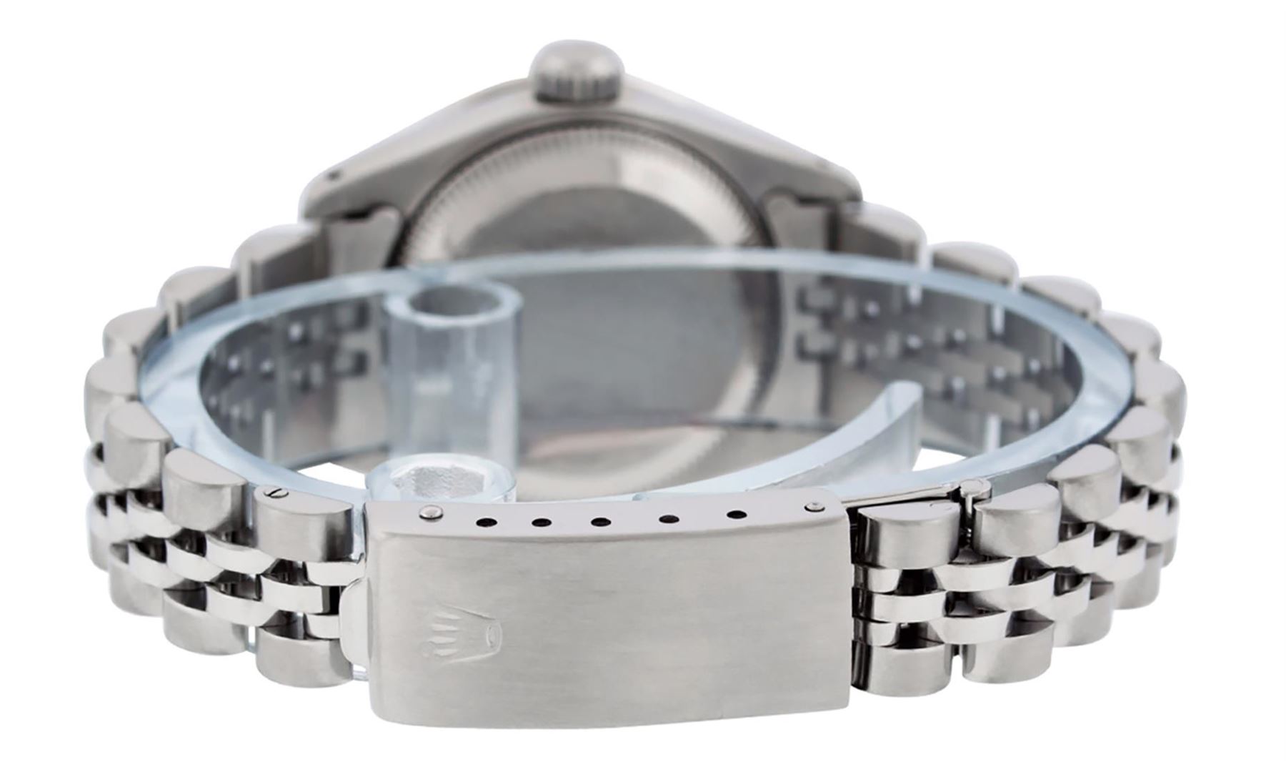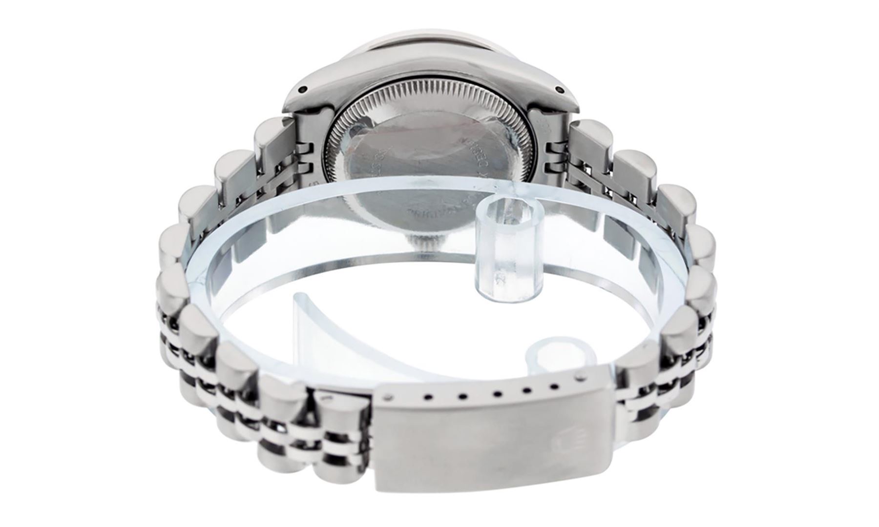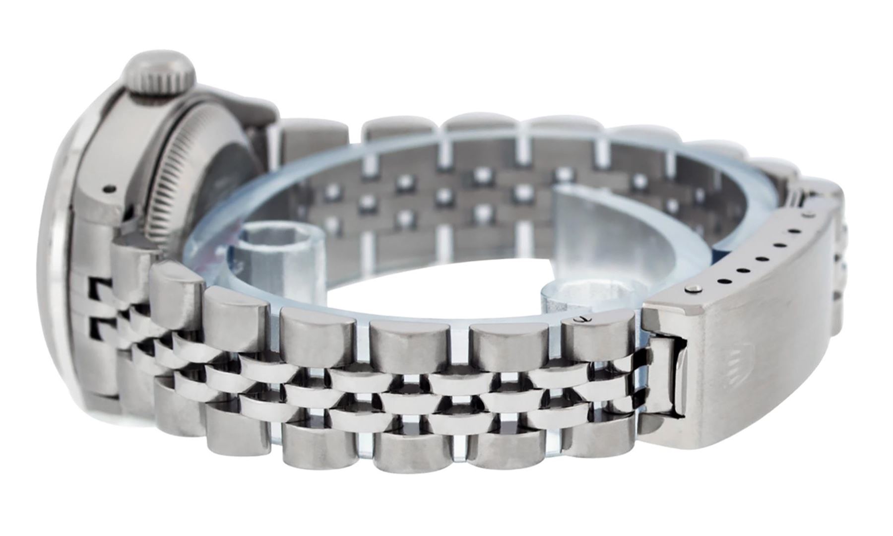 One Ladies Stainless Steel Rolex Oyster Perpetaul Datejust Polished Bright with Satin Finish, Serviced & Electronically Tested, Stainless Steel Case: 26mm, Stainless Steel Crown, Custom Bezel: New 18K White Gold Sapphire Beadset Diamond Bezel, Diamond + Gem Count: 28 Diamonds + 4 Sapphires Total Weight .70 Carat, Clarity: SI-VS, Color: G to H. Custom Crystal: New Synthetic Sapphire Cyclops Lens. Custom Hands: New Luminescent Hands. Movement: Automatic Winding Movement. Custom Dial: Refinished Blue With Diamond Hour Markers, 10 Diamond in Dial G To H In Color, Clarity: SI-VS. Date Window: 3 O'Clock Position Date Display, Model: Datejust. Condition: G-6 Extra Fine. Bracelet: Stainless Steel Jubilee. Bright Polish & Satin Finish. 6.0 Inch Length, Adjustable. Standard Clasp, With Rolex Logo. This Watch Has Been Serviced Time Tested And Is In Excellent Condition It Is Free Of All Scratches And Dents.