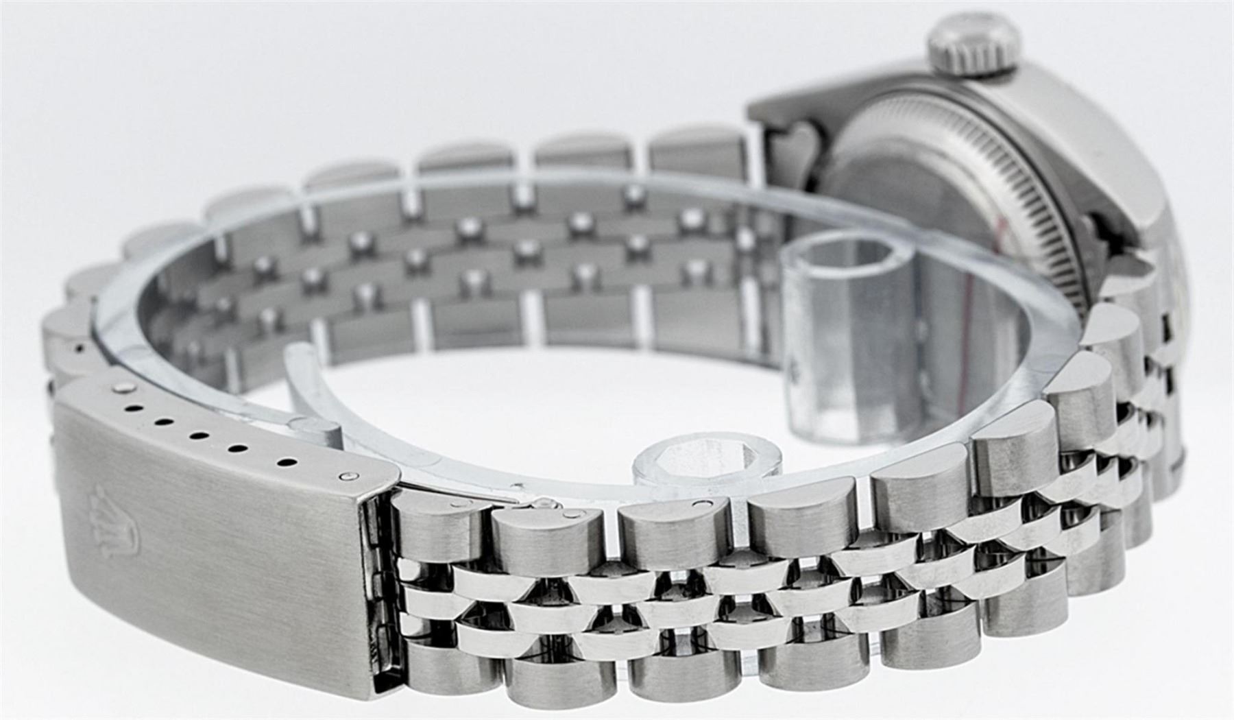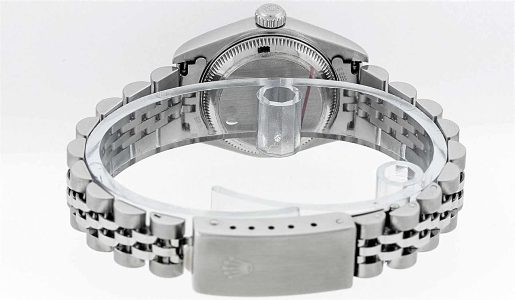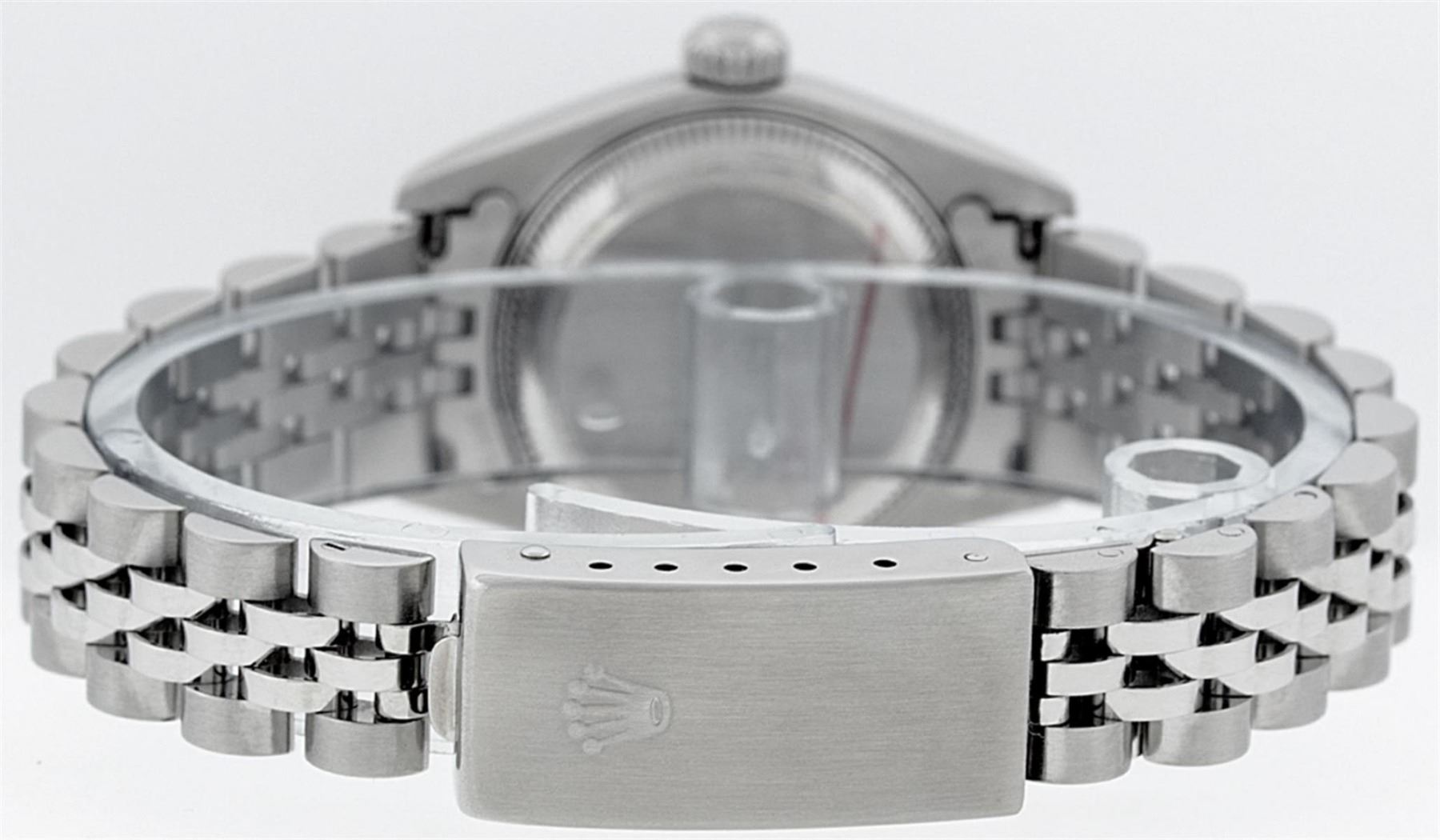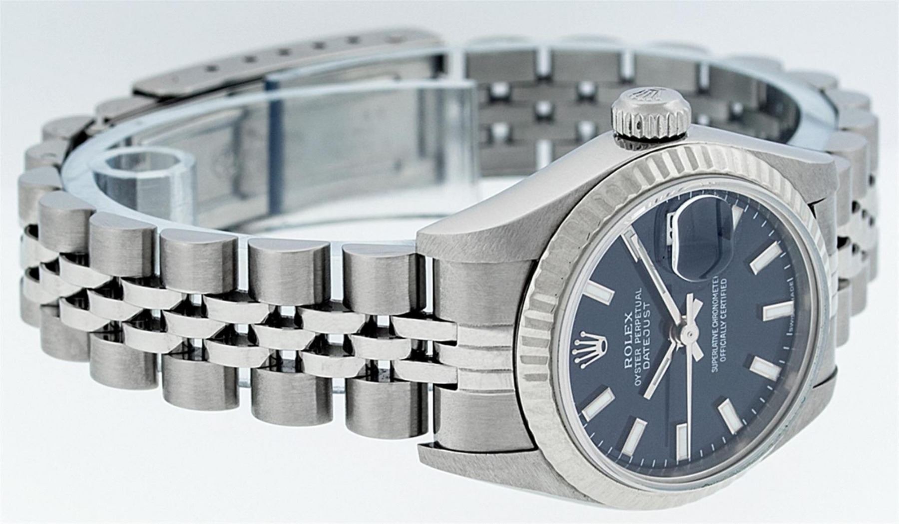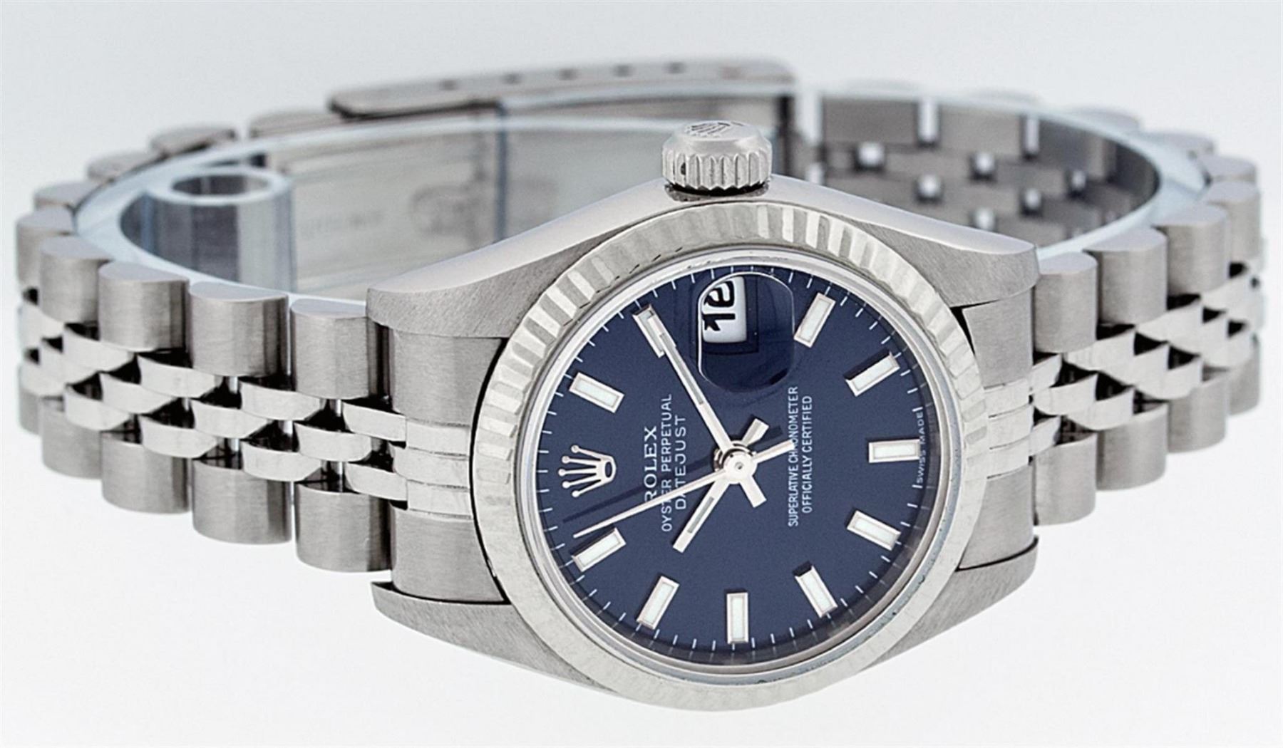 One Ladies Quickset Stainless Steel Rolex Datejust Polished Bright with Satin Finish, Serviced & Electronically Tested, Stainless Steel Case: 26mm, Stainless Steel Crown, Bezel: 18K White Gold Fluted Bezel. Custom Crystal: New Scratch Resistant Sapphire Cyclops Lens. Custom Hands: New Luminescent Hands. Movement: Automatic Winding Movement. Custom Dial: Blue Index Dial. Date Window: 3 O'Clock Position Date Display, Model: Quickset Datejust. Condition: G-6 Extra Fine. Bracelet: Stainless Steel Jubilee Band. Bright Polish & Satin Finish. 6.0 Inch Length, Adjustable. Standard Clasp, With Rolex Logo. This Watch Has Been Serviced Time Tested And Is In Excellent Condition It Is Free Of All Scratches And Dents.