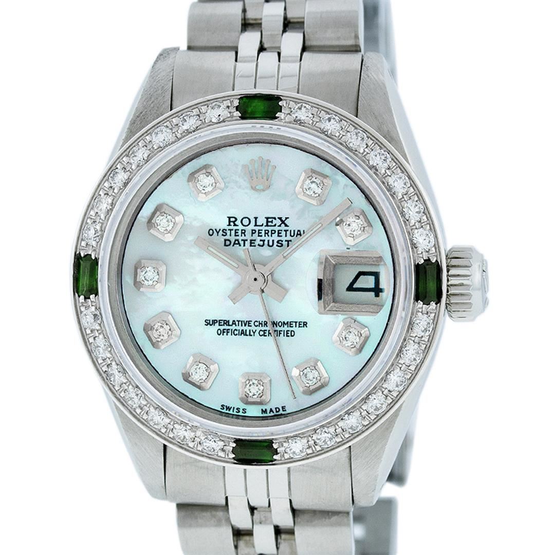 One Ladies Stainless Steel Rolex Datejust Polished Bright with Satin Finish, Serviced & Electronically Tested, Stainless Steel Case: 26mm, Stainless Steel Crown, Custom Bezel: New 18K White Gold Emerald Beadset Diamond Bezel, Diamond + Gem Count: 28 Diamonds + 4 Emeralds. Total Weight .70 Carat, Clarity: SI-VS, Color: G to H. Custom Crystal: New Scratch Resistant Synthetic Sapphire Cyclops Lens. Custom Hands: New Luminescent Hands. Movement: Automatic Winding Movement. Custom Dial: Refinished Blue Mother Of Pearl With Diamond Hour Markers, 10 Diamonds in Dial, G To H In Color, Clarity: SI-VS. Date Window: 3 O'Clock Position Date Display, Model: Datejust. Condition: G-6 Extra Fine. Bracelet: Stainless Steel Jubilee. Bright Polish & Satin Finish. 6.0 Inch Length, Adjustable. Standard Clasp, With Rolex Logo. This Watch Has Been Serviced Time Tested And Is In Excellent Condition It Is Free Of All Scratches And Dents.