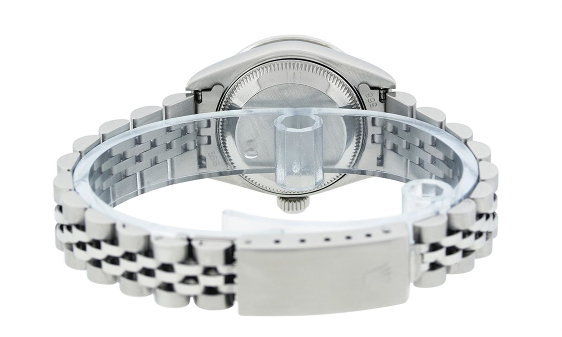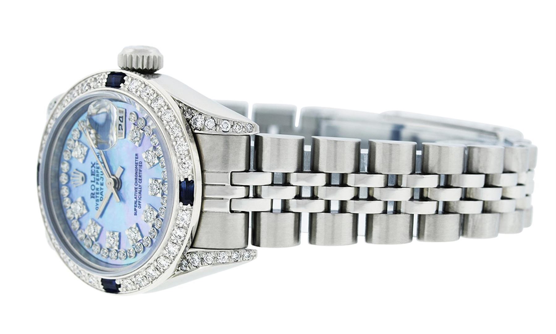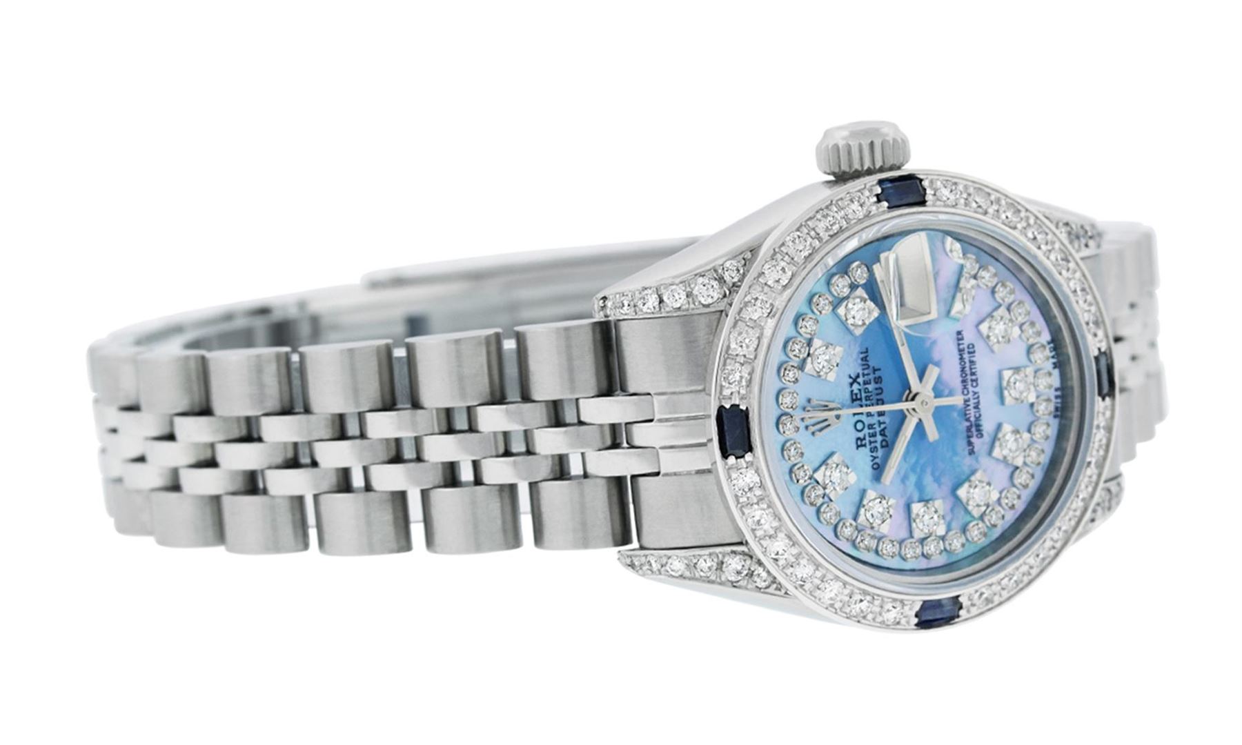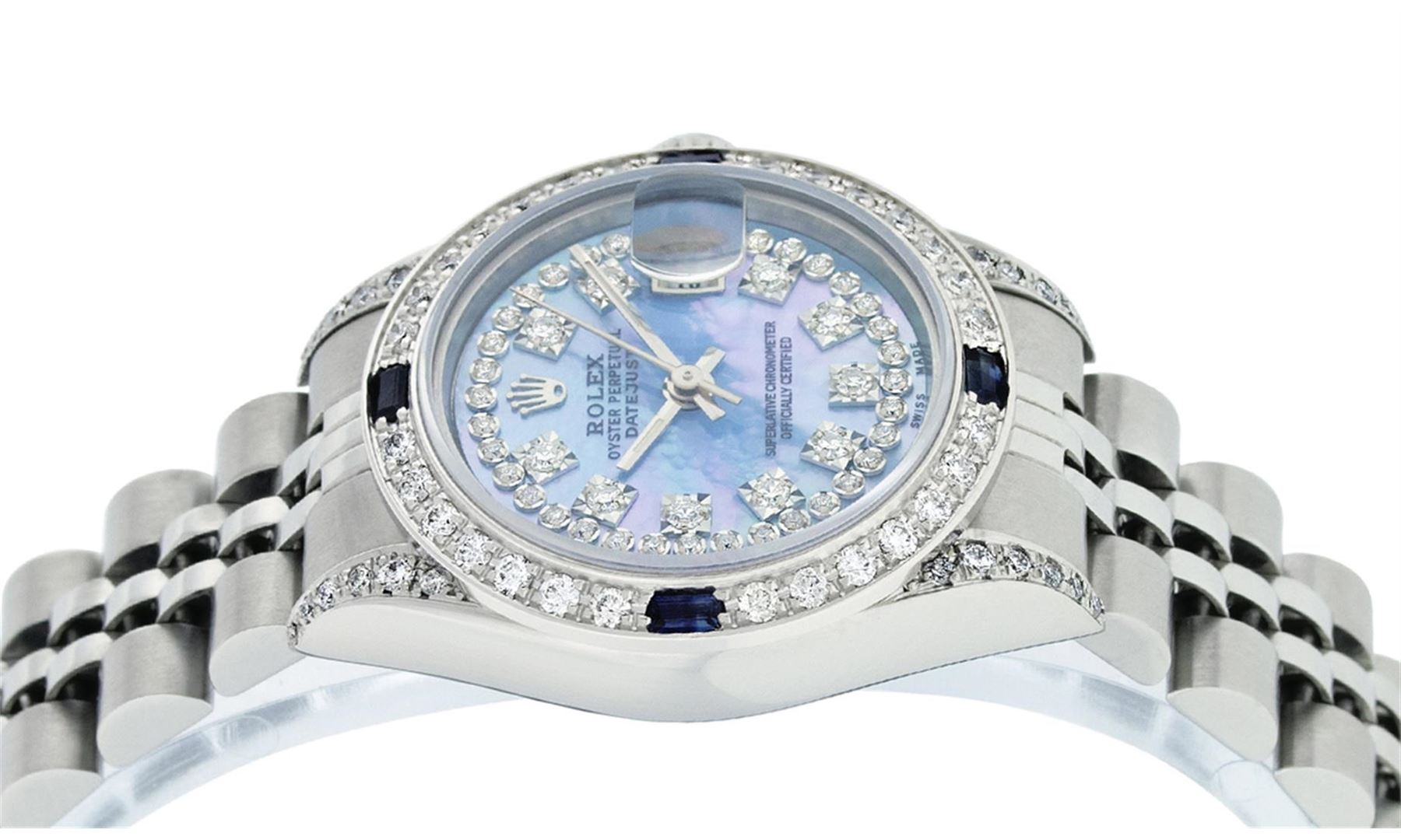 One Quickset Ladies Stainless Steel Rolex Datejust Polished Bright with Satin Finish, Serviced & Electronically Tested, Stainless Steel Case: 26mm, Stainless Steel Crown, Custom Diamond Lugs: 24 Diamonds On Lugs, Clarity: SI-VS, Color: G to H. Custom Bezel: New 18K White Gold Diamond + Sapphire Beadset Diamond Bezel, Stone Count: 28 Diamonds + 4 Sapphires, Total Weight .70 Carat, Clarity: SI-VS, Color: G to H. Custom Crystal: New Scratch Resistant Synthetic Sapphire Cyclops Lens. Custom Hands: New Luminescent Hands. Movement: Automatic Winding Movement Caliber 2235. Custom Dial: Refinished Single Cut Blue Mother Of Pearl String Diamond Dial, 43 Diamonds On Dial G To H In Color, Clarity: VS. Date Window: 3 O'Clock Position Date Display, Model: Quickset Datejust. Condition: G-6 Extra Fine. Bracelet: Stainless Steel Jubilee Band. Bright Polish & Satin Finish. 6.0 Inch Length, Adjustable. Standard Clasp, With Rolex Logo. This Watch Has Been Serviced Time Tested And Is In Excellent Condition It Is Free Of All Scratches And Dents.