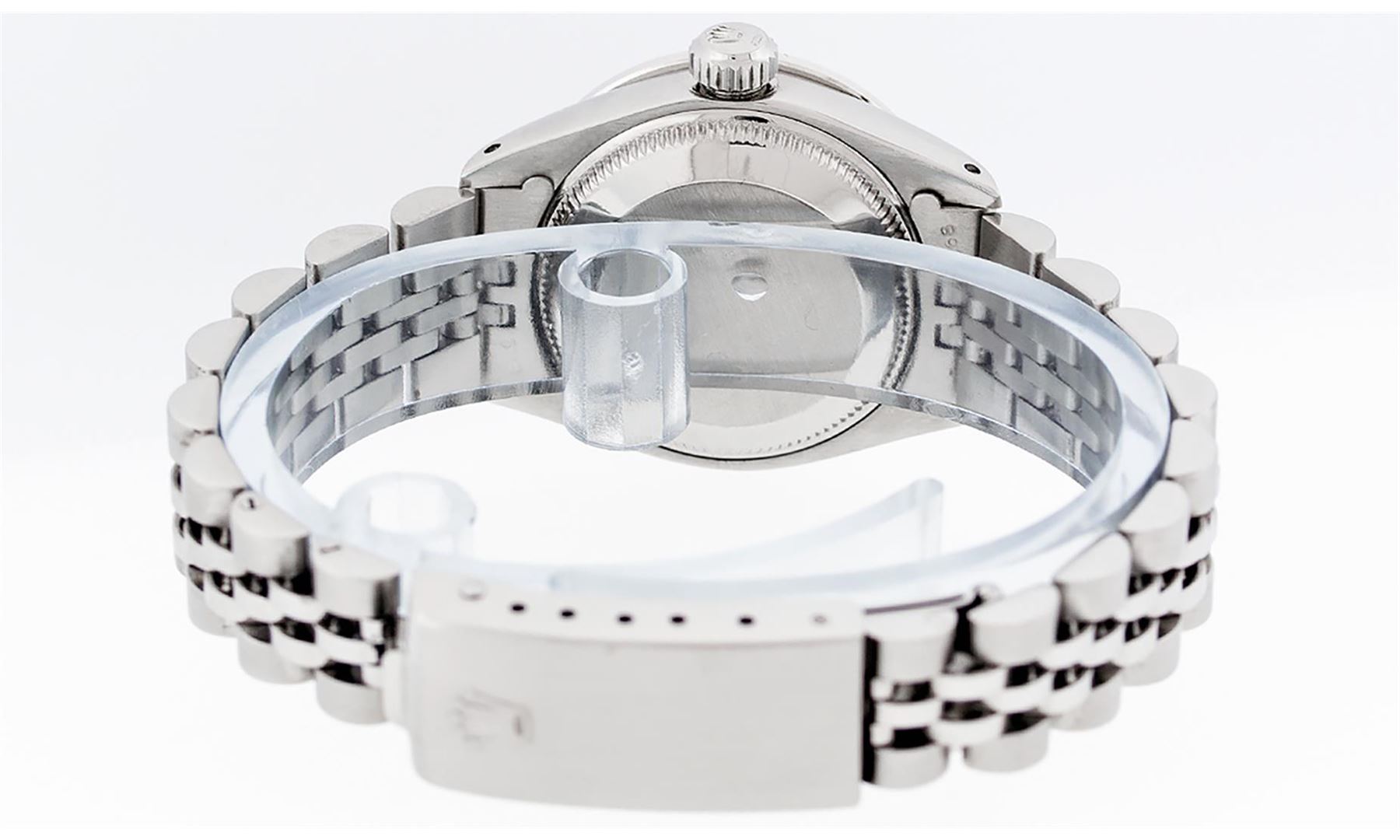 One Ladies Stainless Steel Rolex Datejust Polished Bright with Satin Finish, Serviced & Electronically Tested, Stainless Steel Case: 26mm, Stainless Steel Crown, Custom Bezel: New 18K White Gold Ruby Beadset Diamond Bezel, Diamond + Gem Count: 28 Diamonds + 4 Rubies. Total Weight .70 Carat, Clarity: SI-VS, Color: G to H. Custom Crystal: New Scratch Resistant Synthetic Sapphire Cyclops Lens. Custom Hands: New Luminescent Hands. Movement: Automatic Winding Movement. Custom Dial: Refinished Blue Mother Of Pearl With Diamond Hour Markers, 10 Diamonds in Dial, G To H In Color, Clarity: SI-VS. Date Window: 3 O'Clock Position Date Display, Model: Datejust. Condition: G-6 Extra Fine. Bracelet: Stainless Steel Jubilee. Bright Polish & Satin Finish. 6.0 Inch Length, Adjustable. Standard Clasp, With Rolex Logo. This Watch Has Been Serviced Time Tested And Is In Excellent Condition It Is Free Of All Scratches And Dents.