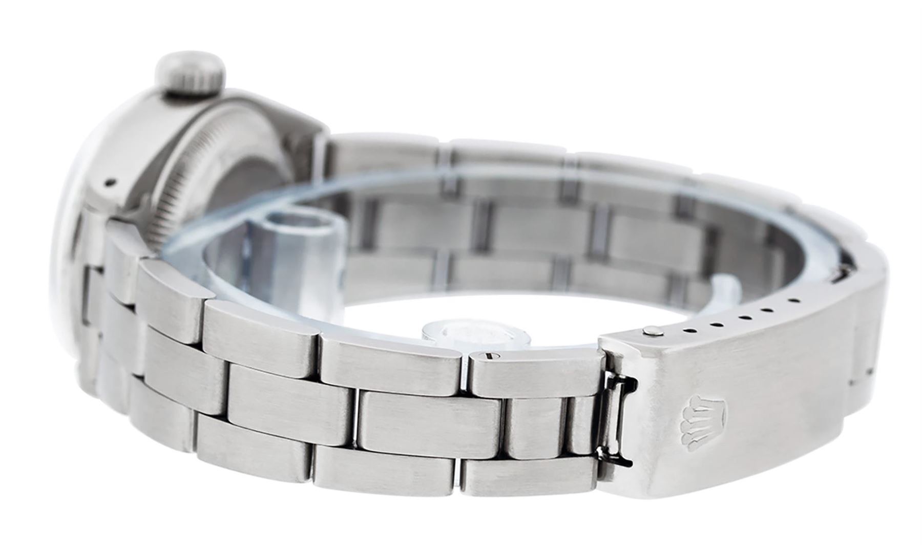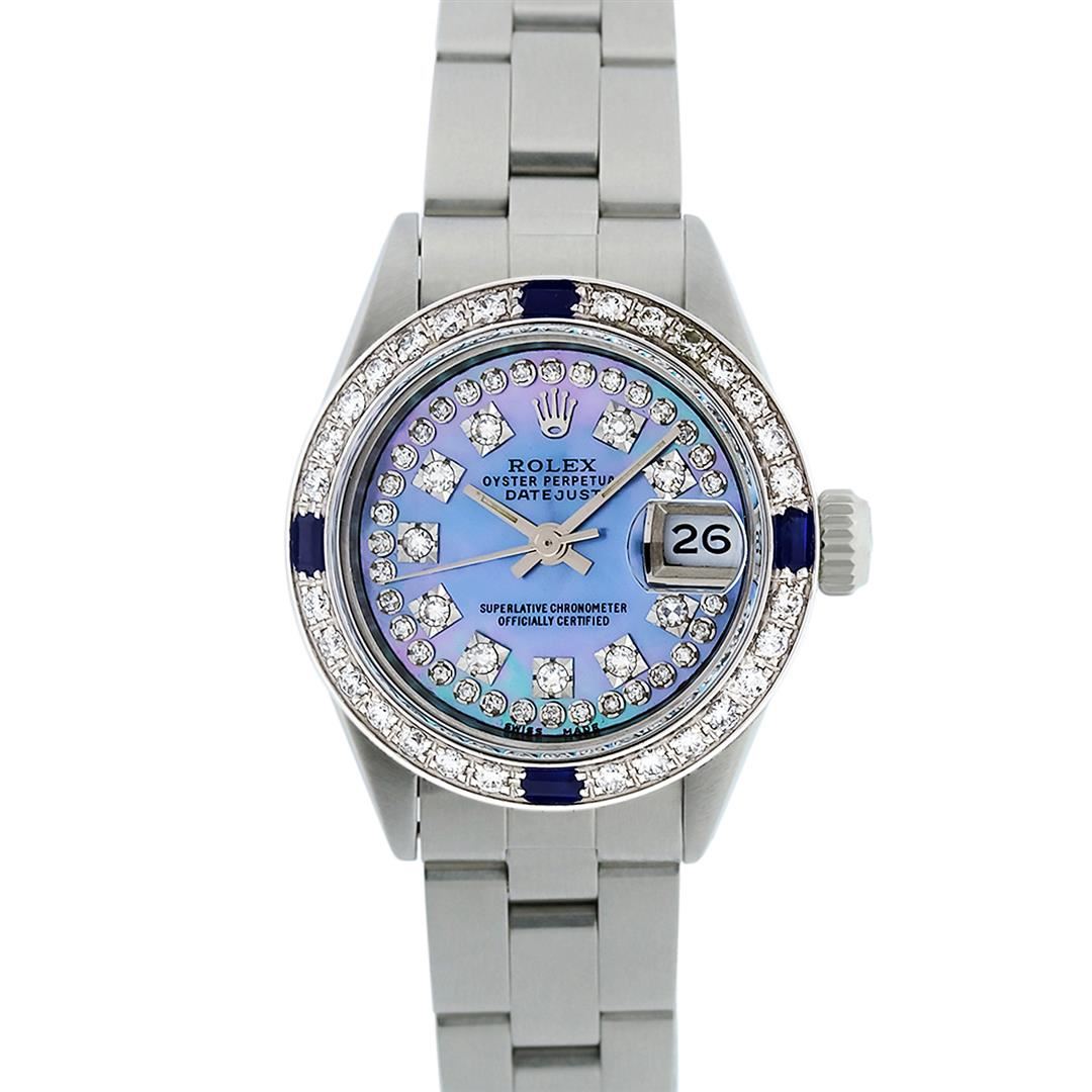 One Ladies Stainless Steel Rolex Datejust Polished Bright with Satin Finish, Serviced & Electronically Tested, Stainless Steel Case: 26mm, Stainless Steel Crown. Custom Bezel: New 18K White Gold Beadset & Sapphire Diamond Bezel, Diamond Count: 28 Diamonds + 4 Sapphires. Total Weight .70 Carat, Clarity: SI-VS, Color: G to H. Custom Crystal: New Scratch Resistant Synthetic Sapphire Cyclops Lens. Custom Hands: New Luminescent Hands. Movement: Automatic Winding Movement. Custom Dial: Refinished Blue Mother Of Pearl String Diamond Dial, Stone Count: 43 Diamonds On Dial, G To H In Color, Clarity: SI-VS. Date Window: 3 O'Clock Position Date Display, Model: Datejust. Condition: G-6 Extra Fine. Bracelet: Stainless Steel Oyster Band. Bright Polish & Satin Finish. 6.0 Inch Length, Adjustable. Standard Clasp, With Rolex Logo. This Watch Has Been Serviced Time Tested And Is In Excellent Condition It Is Free Of All Scratches And Dents.