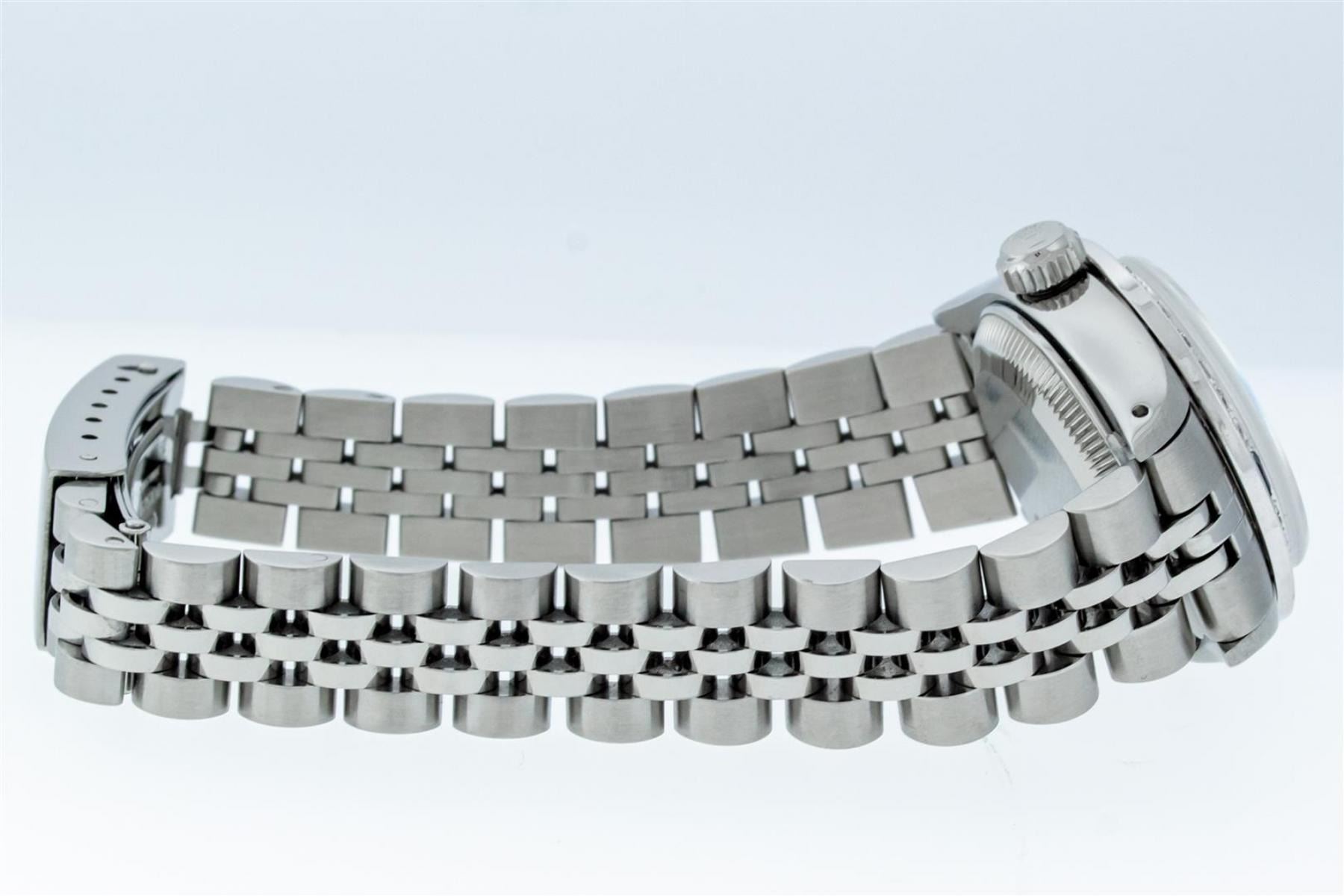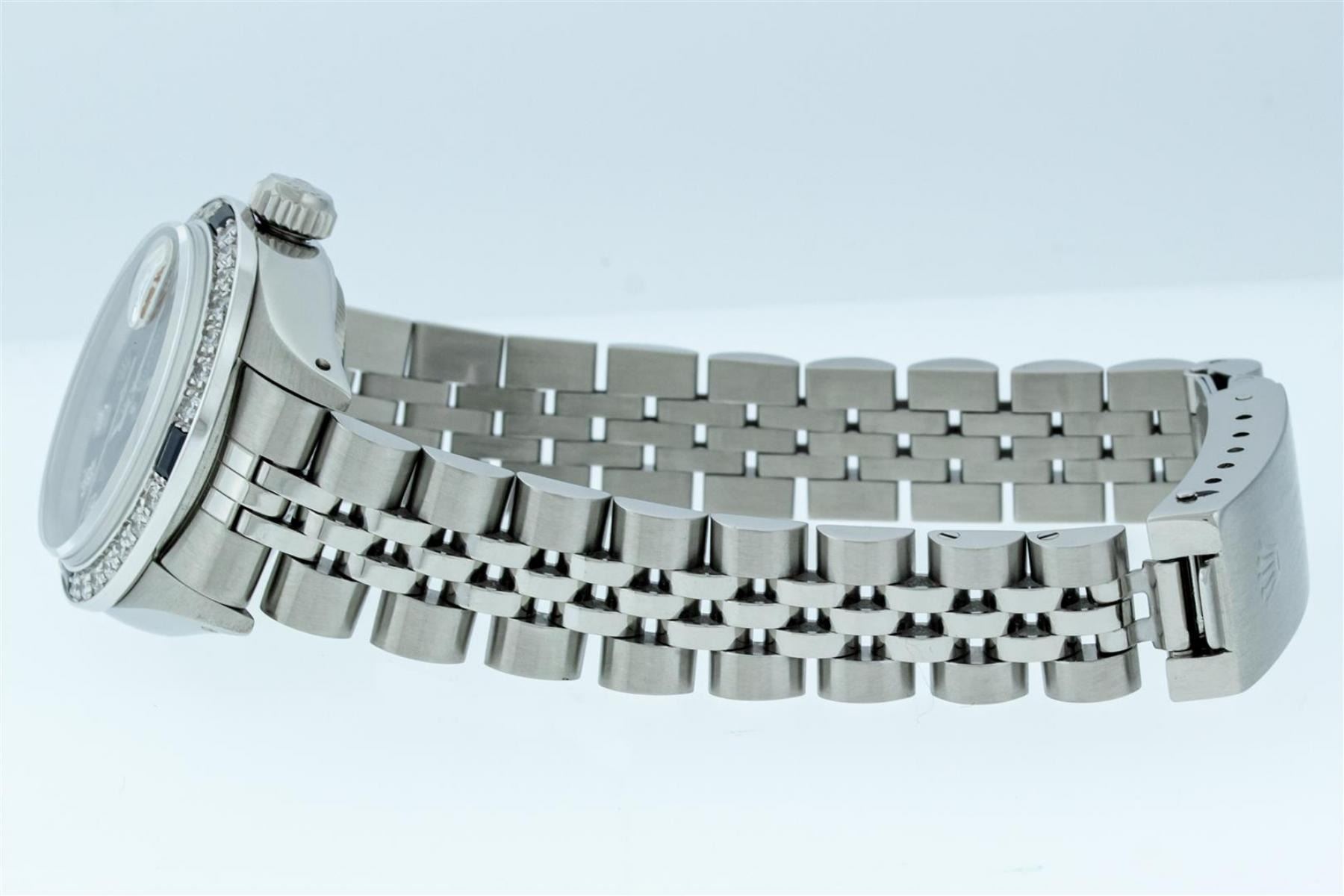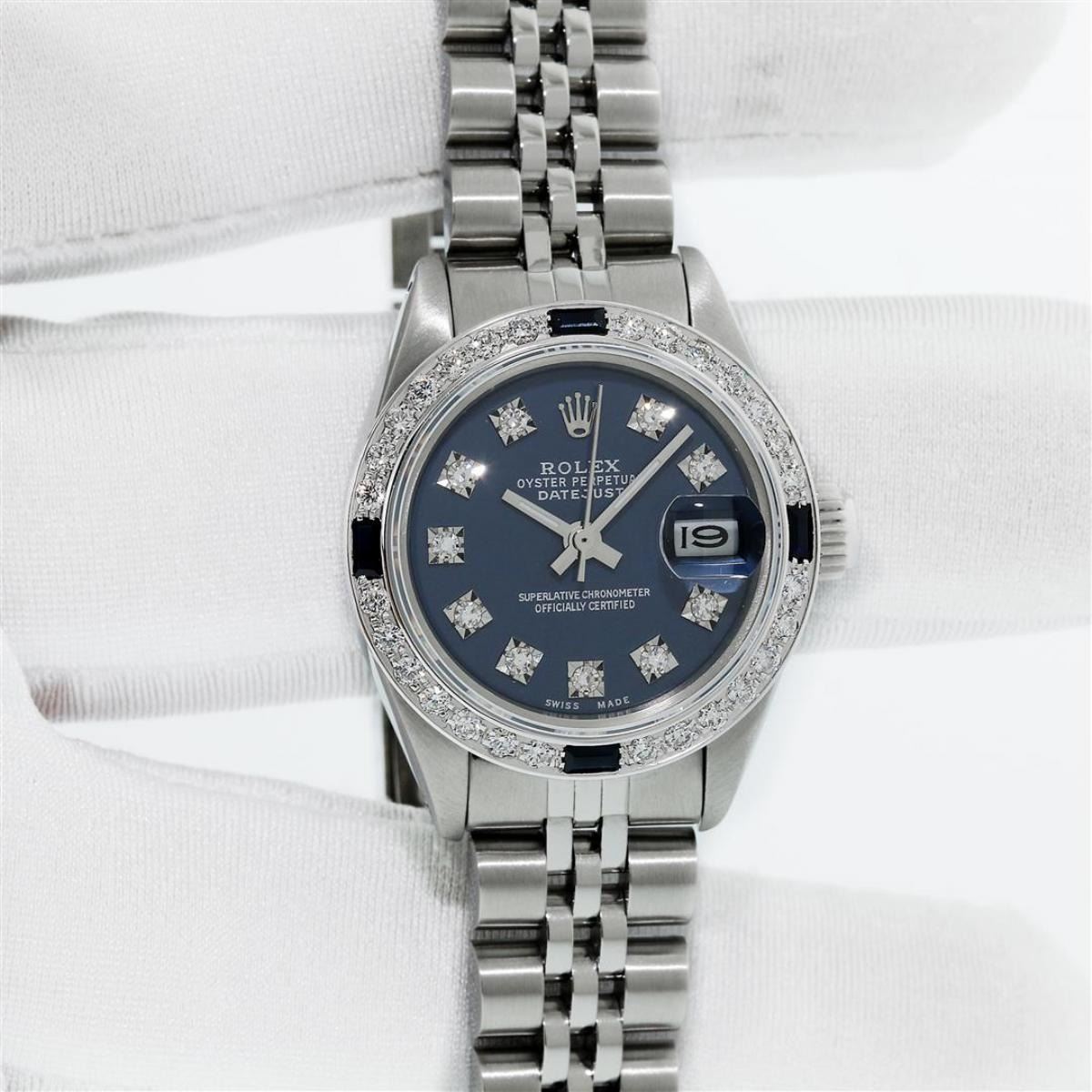 One Ladies Stainless Steel Rolex Datejust Polished Bright with Satin Finish, Serviced & Electronically Tested, Stainless Steel Case: 26mm, Stainless Steel Crown. Custom Bezel: New 18K White Gold Sapphire Beadset Bezel, Diamond Count: 28 Diamonds + 4 Sapphires, Total Weight .70 Carat, Clarity: SI-VS, Color: G to H. Custom Crystal: New Scratch Resistant Synthetic Sapphire Cyclops Lens. Custom Hands: New Luminescent Hands. Movement: Automatic Winding Movement. Custom Dial: Refinished Blue Diamond Dial, 10 Diamonds in Dial G To H In Color, Clarity: VS. Date Window: 3 O'Clock Position Date Display, Model: Datejust Condition: G-6 Extra Fine. Bracelet: Stainless Steel Jubilee Band. Bright Polish & Satin Finish. 6.0 Inch Length, Adjustable. Standard Clasp, With Rolex Logo. This Watch Has Been Serviced Time Tested And Is In Excellent Condition It Is Free Of All Scratches And Dents.
