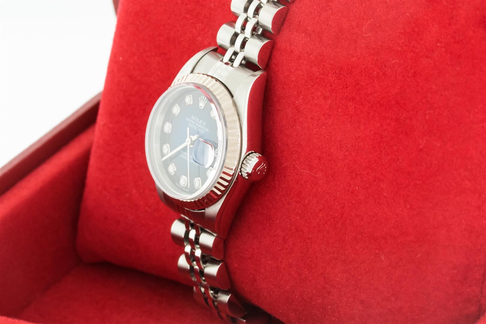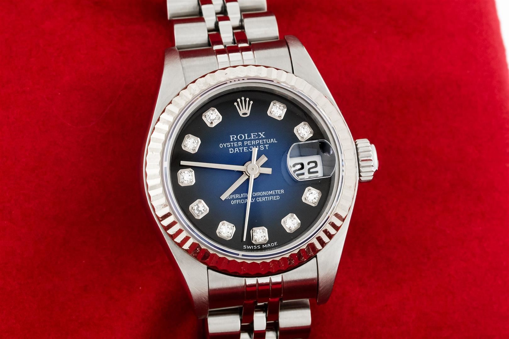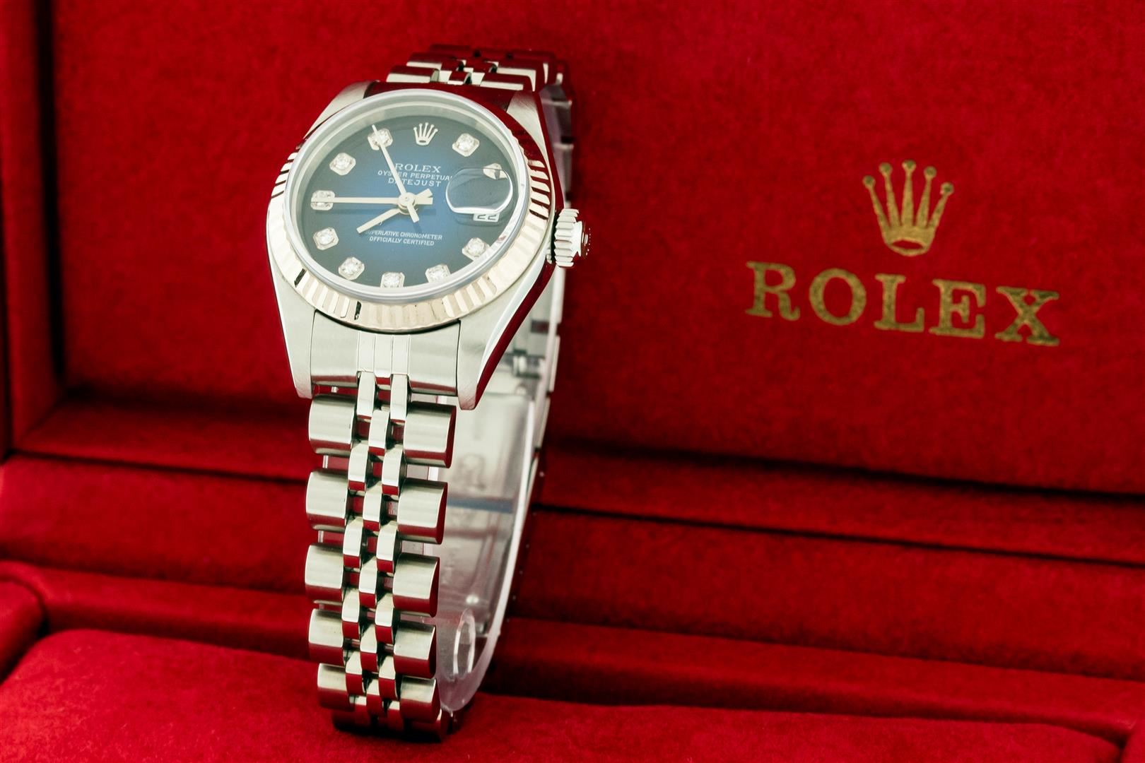 One Ladies Quickset Pre Owned Stainless Steel Rolex Datejust Polished Bright with Satin Finish, Serviced & Electronically Tested, Stainless Steel Case: 26mm, Stainless Steel Crown, Bezel: Rolex 18K White Gold Fluted Bezel. Crystal: Sapphire With Magnified Date Window. Hands: Non luminous hands. Rolex Movement: Automatic Winding Movement 2235. Custom Dial: Refinished To Blue Vignette With Custom Added Diamonds, Diamond Count: 10 Diamonds In Dial, Clarity: VS, Date Window: 3 O'Clock Position Date Display, Model: Quickset Datejust. Condition: G-6 Extra Fine. Rolex Bracelet: Stainless Steel Jubilee Band. Bright Polish & Satin Finish. 6 Inch Length, Standard Clasp, With Rolex Logo. This Watch Has Been Serviced Time Tested And Is In Excellent Condition It Is Free Of All Scratches And Dents. This Watch Comes With A Rolex Box.