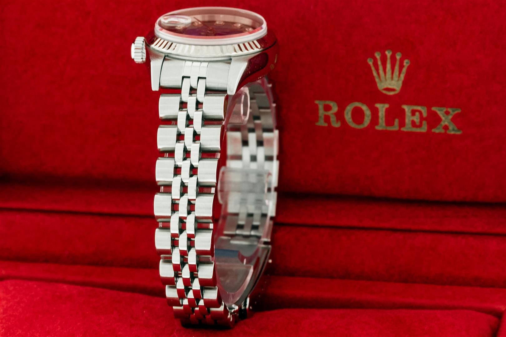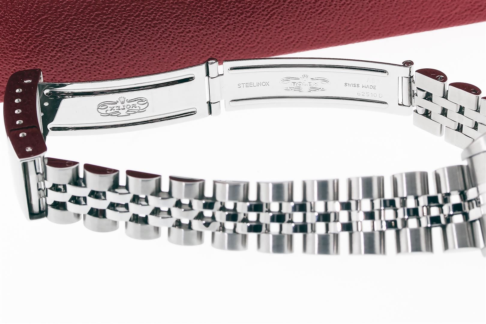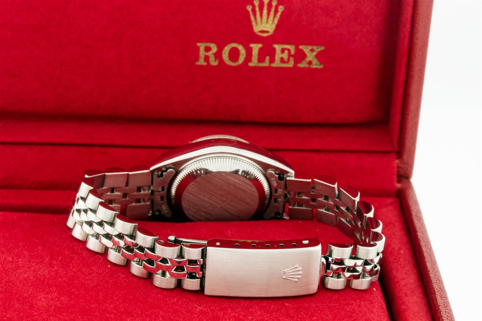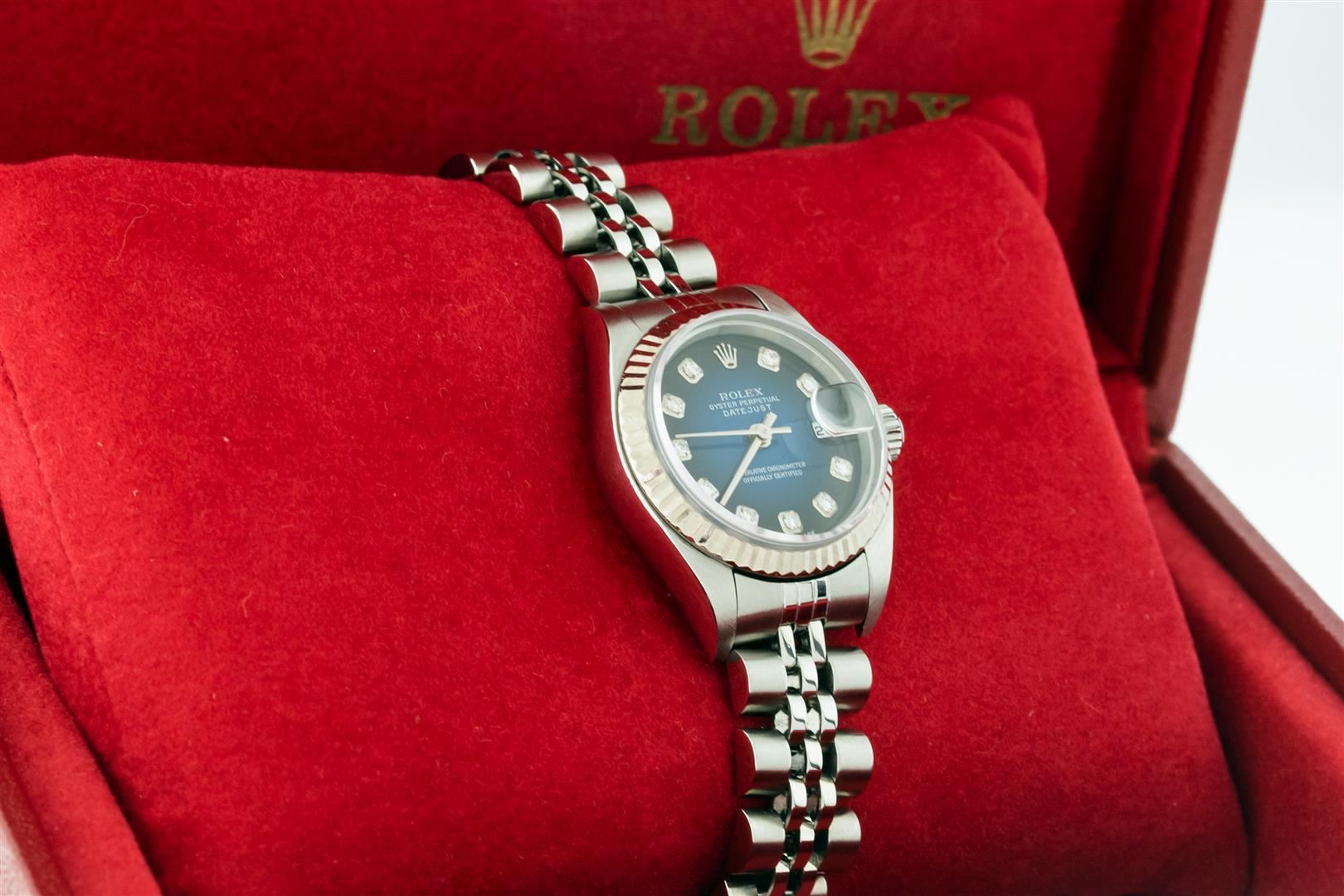 One Ladies Quickset Pre Owned Stainless Steel Rolex Datejust Polished Bright with Satin Finish, Serviced & Electronically Tested, Stainless Steel Case: 26mm, Stainless Steel Crown, Bezel: Rolex 18K White Gold Fluted Bezel. Crystal: Sapphire With Magnified Date Window. Hands: Non luminous hands. Rolex Movement: Automatic Winding Movement 2235. Custom Dial: Refinished To Blue Vignette With Custom Added Diamonds, Diamond Count: 10 Diamonds In Dial, Clarity: VS, Date Window: 3 O'Clock Position Date Display, Model: Quickset Datejust. Condition: G-6 Extra Fine. Rolex Bracelet: Stainless Steel Jubilee Band. Bright Polish & Satin Finish. 6 Inch Length, Standard Clasp, With Rolex Logo. This Watch Has Been Serviced Time Tested And Is In Excellent Condition It Is Free Of All Scratches And Dents. This Watch Comes With A Rolex Box.