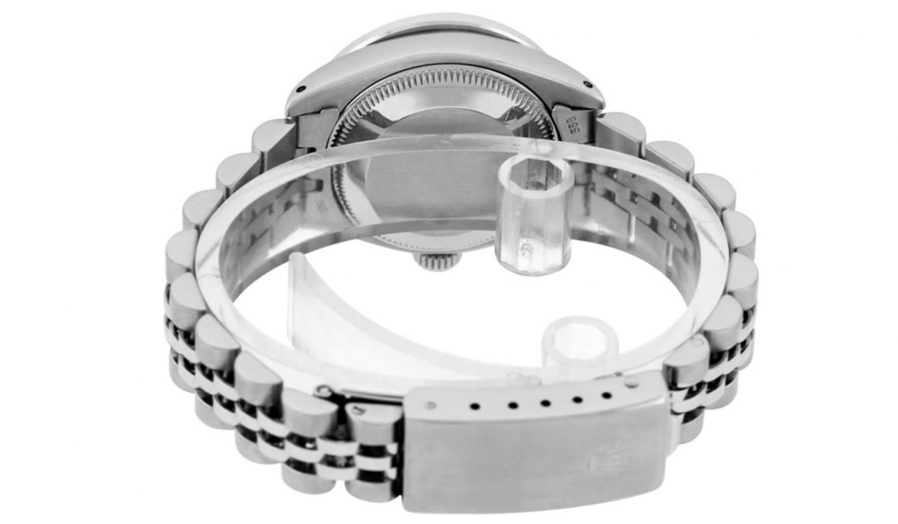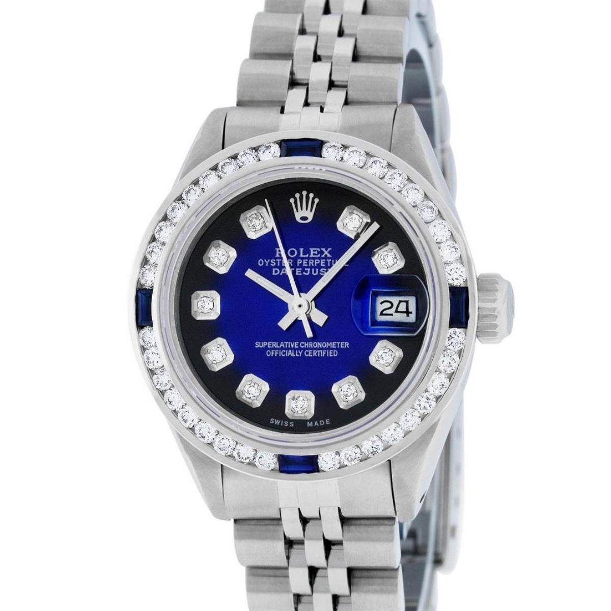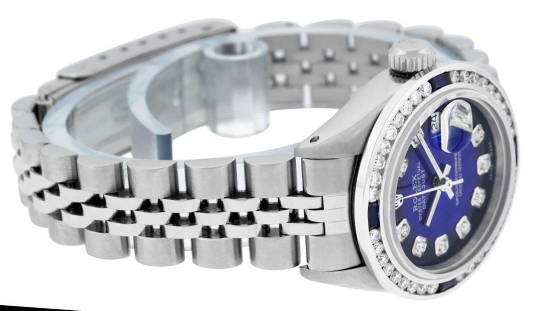 One Ladies Stainless Steel Rolex Datejust Polished Bright with Satin Finish, Serviced & Electronically Tested, Stainless Steel Case: 26mm, Stainless Steel Crown, Custom Bezel: New 18K White Gold Sapphire Channel Set Diamond Bezel, Diamond + Gem Count: 36 Diamonds + 4 Sapphires Total Weight 1.00 Carat, Clarity: SI-VS, Color: G to H. Custom Crystal: New Synthetic Sapphire Cyclops Lens. Custom Hands: New Luminescent Hands. Movement: Automatic Winding Movement Caliber 2030. Custom Dial: Refinished Blue Vignette With Diamond Hour Markers. Date Window: 3 O'Clock Position Date Display, Model: Datejust. Condition: G-6 Extra Fine. Bracelet: Stainless Steel Jubilee. Bright Polish & Satin Finish. 6.0 Inch Length, Adjustable. Standard Clasp, With Rolex Logo. This Watch Has Been Serviced Time Tested And Is In Excellent Condition It Is Free Of All Scratches And Dents.