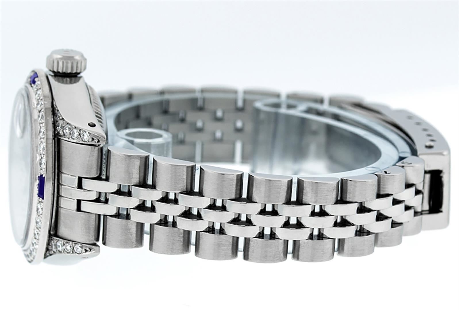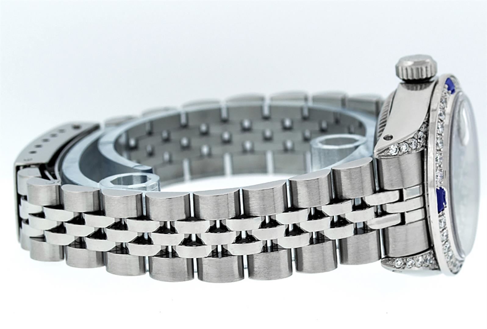 One Ladies Stainless Steel Rolex Datejust Polished Bright with Satin Finish, Serviced & Electronically Tested, Stainless Steel Case: 26mm, Stainless Steel Crown, Diamond Lugs: 24 Diamonds On Lugs, Clarity: SI-VS, Color: G to H. Custom Bezel: New 18K White Gold Sapphire Beadset Bezel, Diamond Count: 28 Diamonds + 4 Sapphires, Total Weight .70 Carat, Clarity: SI-VS, Color: G to H. Custom Crystal: New Scratch Resistant Synthetic Sapphire Cyclops Lens. Custom Hands: New Luminescent Hands. Movement: Automatic Winding Movement. Custom Dial: Refinished Blue Vignette String Diamond Dial, 43 Diamonds in Dial G To H In Color, Clarity: VS. Date Window: 3 O'Clock Position Date Display, Model: Datejust Condition: G-6 Extra Fine. Bracelet: Stainless Steel Jubilee Band. Bright Polish & Satin Finish. 6.0 Inch Length, Adjustable. Standard Clasp, With Rolex Logo. This Watch Has Been Serviced Time Tested And Is In Excellent Condition It Is Free Of All Scratches And Dents.