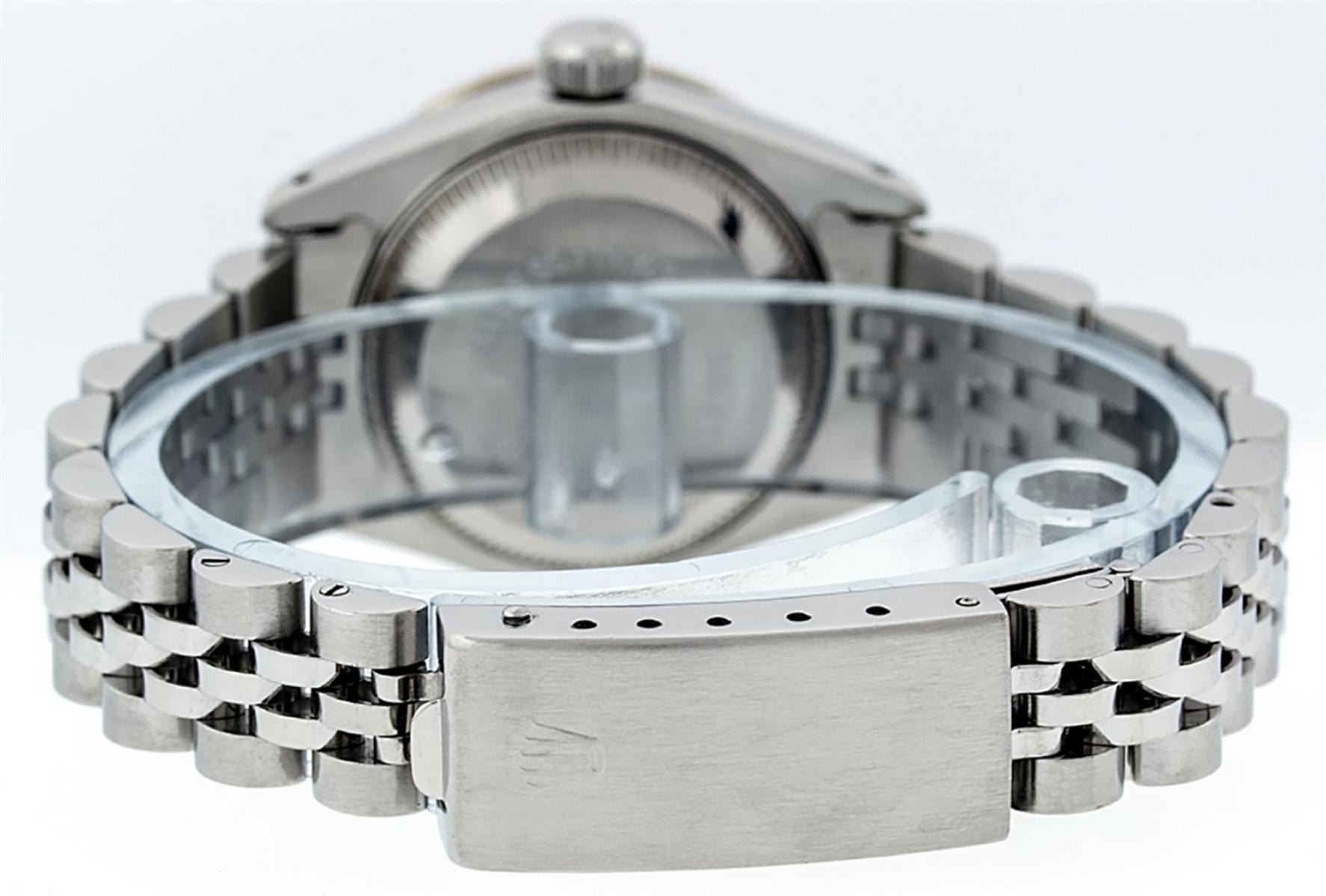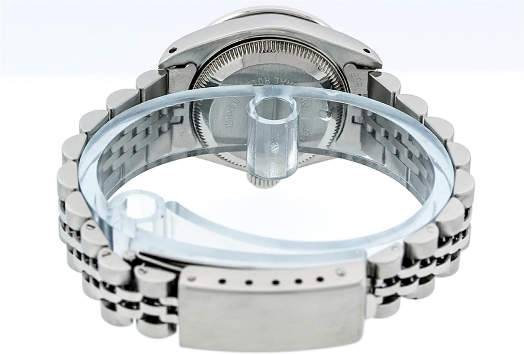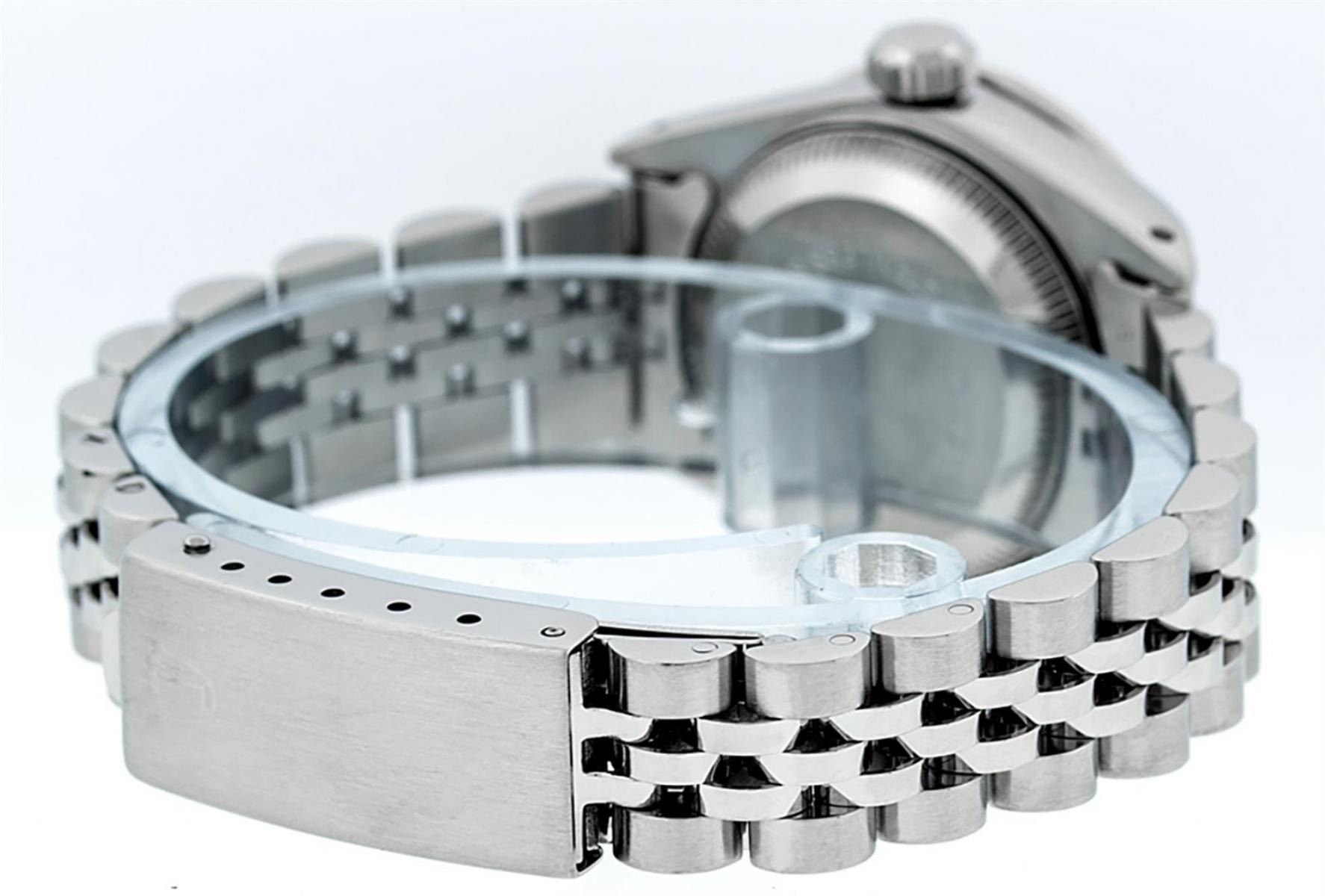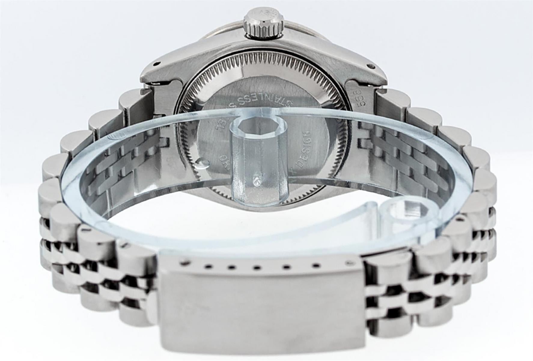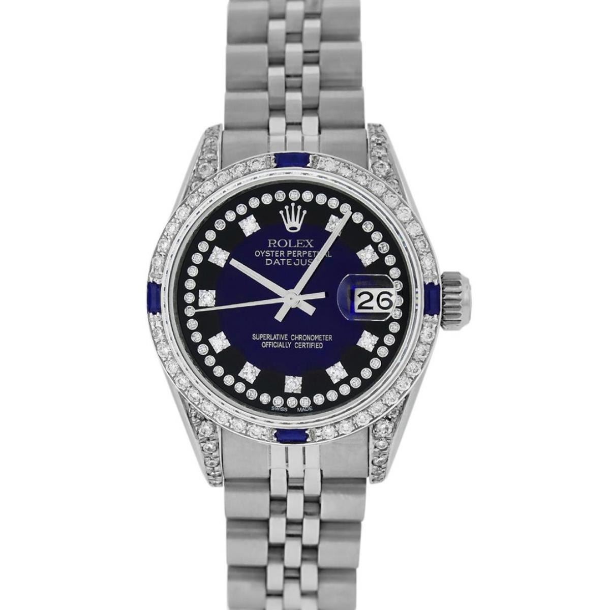 One Ladies Stainless Steel Rolex Datejust Polished Bright with Satin Finish, Serviced & Electronically Tested, Stainless Steel Case: 26mm, Stainless Steel Crown, Diamond Lugs: 24 Diamonds On Lugs, Clarity: SI-VS, Color: G to H. Custom Bezel: New 18K White Gold Sapphire Beadset Bezel, Diamond Count: 28 Diamonds + 4 Sapphires, Total Weight .70 Carat, Clarity: SI-VS, Color: G to H. Custom Crystal: New Scratch Resistant Synthetic Sapphire Cyclops Lens. Custom Hands: New Luminescent Hands. Movement: Automatic Winding Movement. Custom Dial: Refinished Blue Vignette String Diamond Dial, 43 Diamonds in Dial G To H In Color, Clarity: VS. Date Window: 3 O'Clock Position Date Display, Model: Datejust Condition: G-6 Extra Fine. Bracelet: Stainless Steel Jubilee Band. Bright Polish & Satin Finish. 6.0 Inch Length, Adjustable. Standard Clasp, With Rolex Logo. This Watch Has Been Serviced Time Tested And Is In Excellent Condition It Is Free Of All Scratches And Dents.