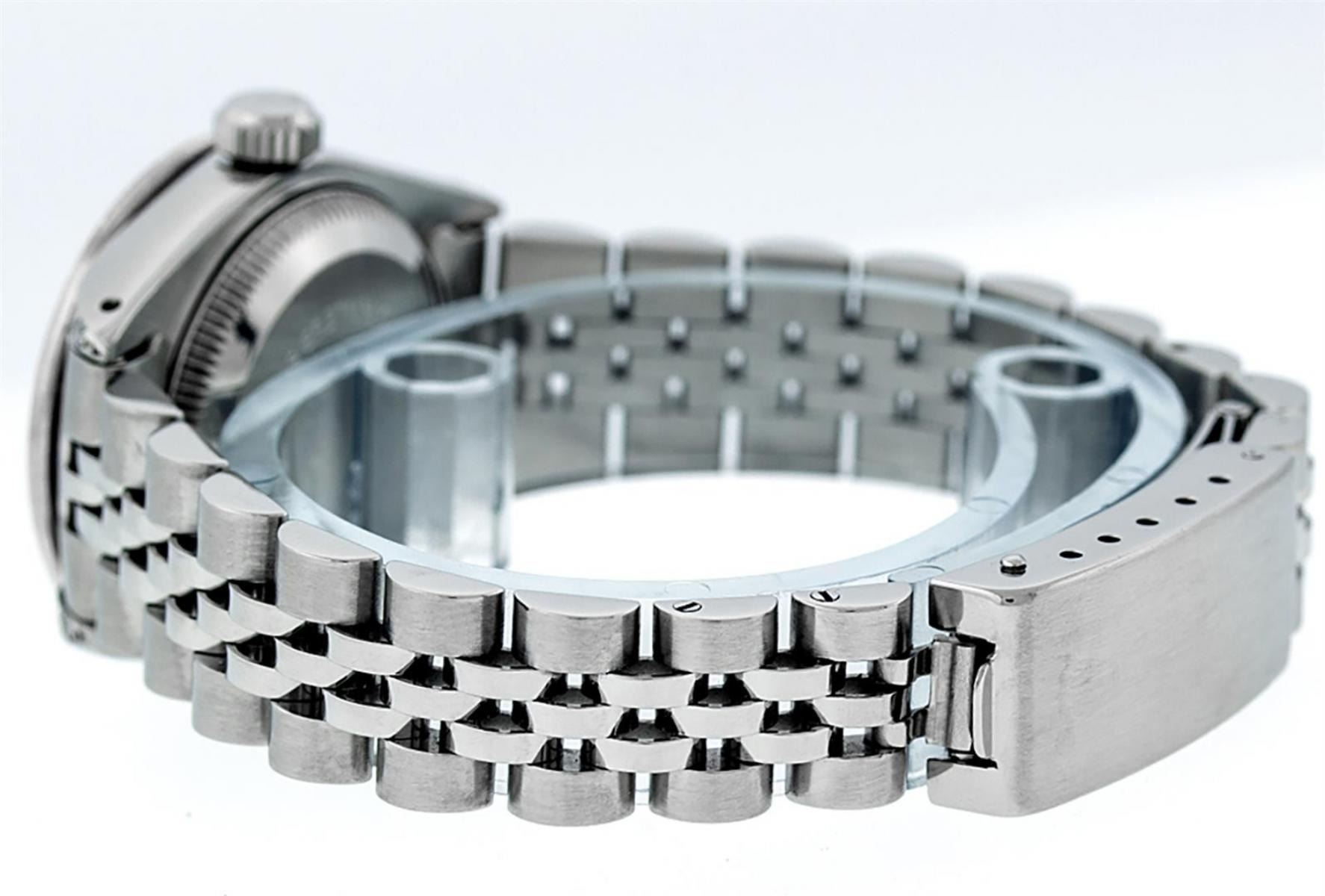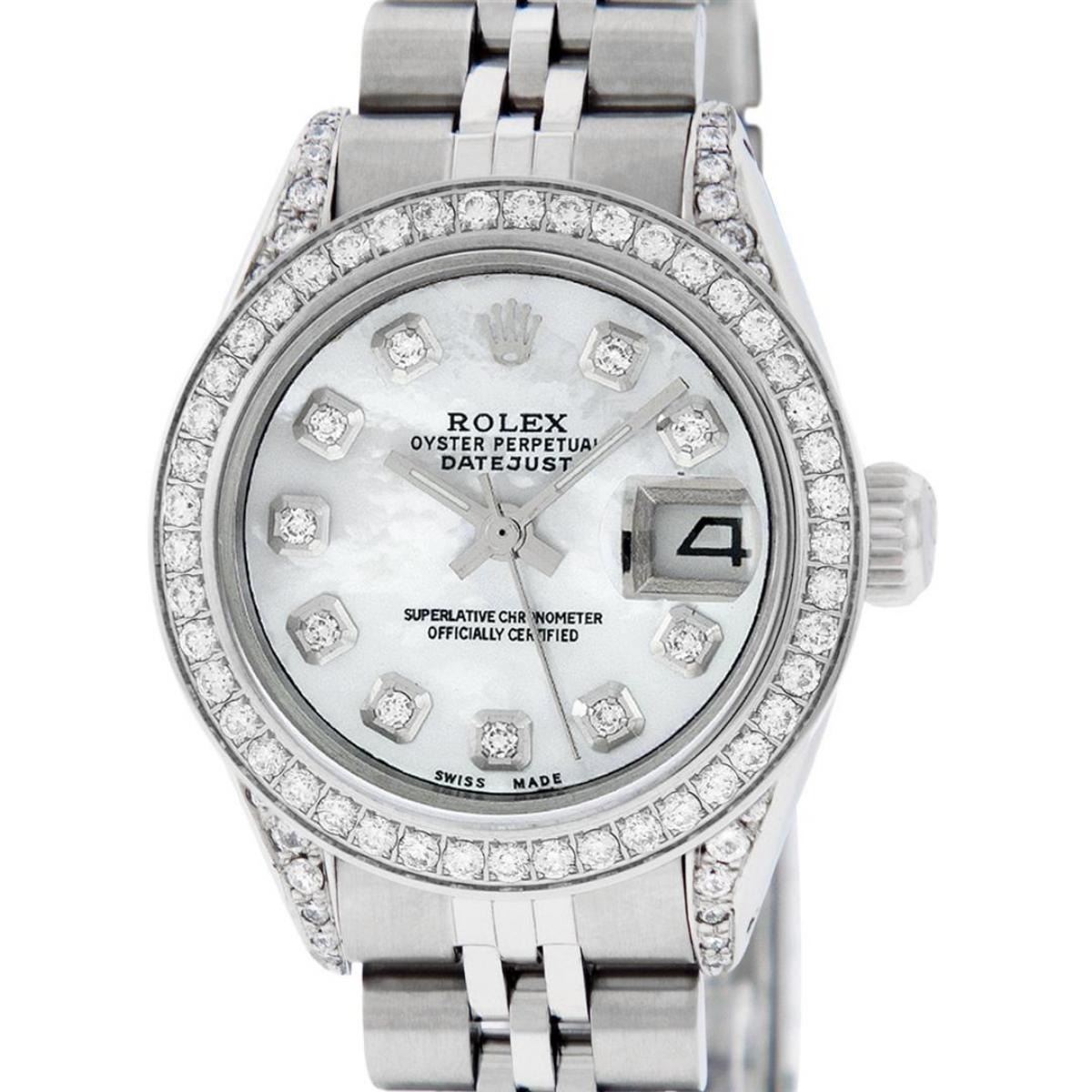 One Ladies Stainless Steel Rolex Datejust Polished Bright with Satin Finish, Serviced & Electronically Tested, Stainless Steel Case: 26mm, Stainless Steel Crown, Diamond Lugs: 24 Diamonds On Lugs, Clarity: SI-VS, Color: G to H. Custom Bezel: New Stainless Steel Beadset Bezel, Diamond Count: 39 Diamonds, Total Weight .70 Carat, Clarity: SI-VS, Color: G to H. Custom Crystal: New Scratch Resistant Synthetic Sapphire Cyclops Lens. Custom Hands: New Luminescent Hands. Movement: Automatic Winding Movement. Custom Dial: Mother Of Pearl Diamond Dial, 10 Diamonds in Dial G To H In Color, Clarity: VS. Date Window: 3 O'Clock Position Date Display, Model: Datejust Condition: G-6 Extra Fine. Bracelet: Stainless Steel Jubilee Band. Bright Polish & Satin Finish. 6.0 Inch Length, Adjustable. Standard Clasp, With Rolex Logo. This Watch Has Been Serviced Time Tested And Is In Excellent Condition It Is Free Of All Scratches And Dents.